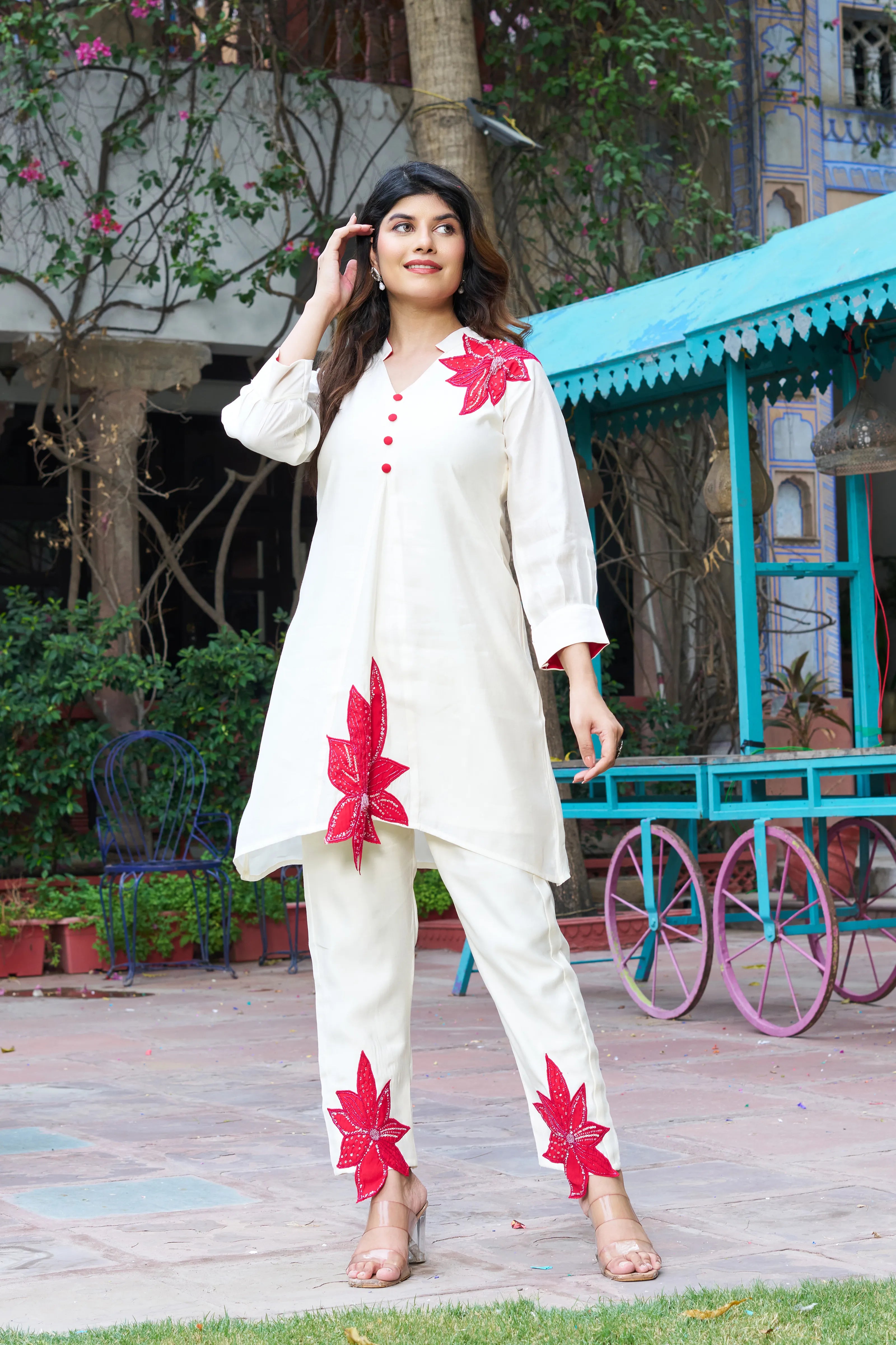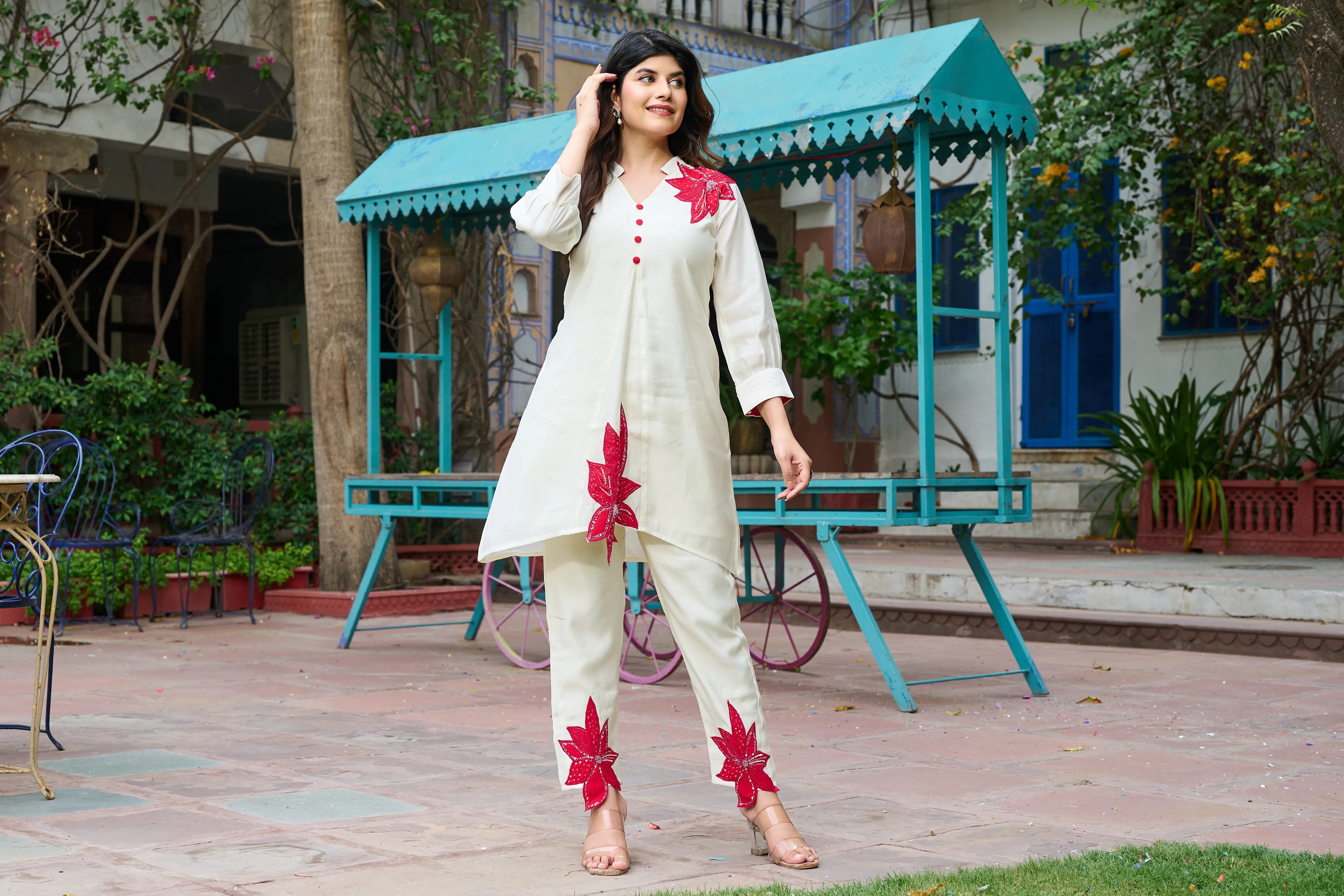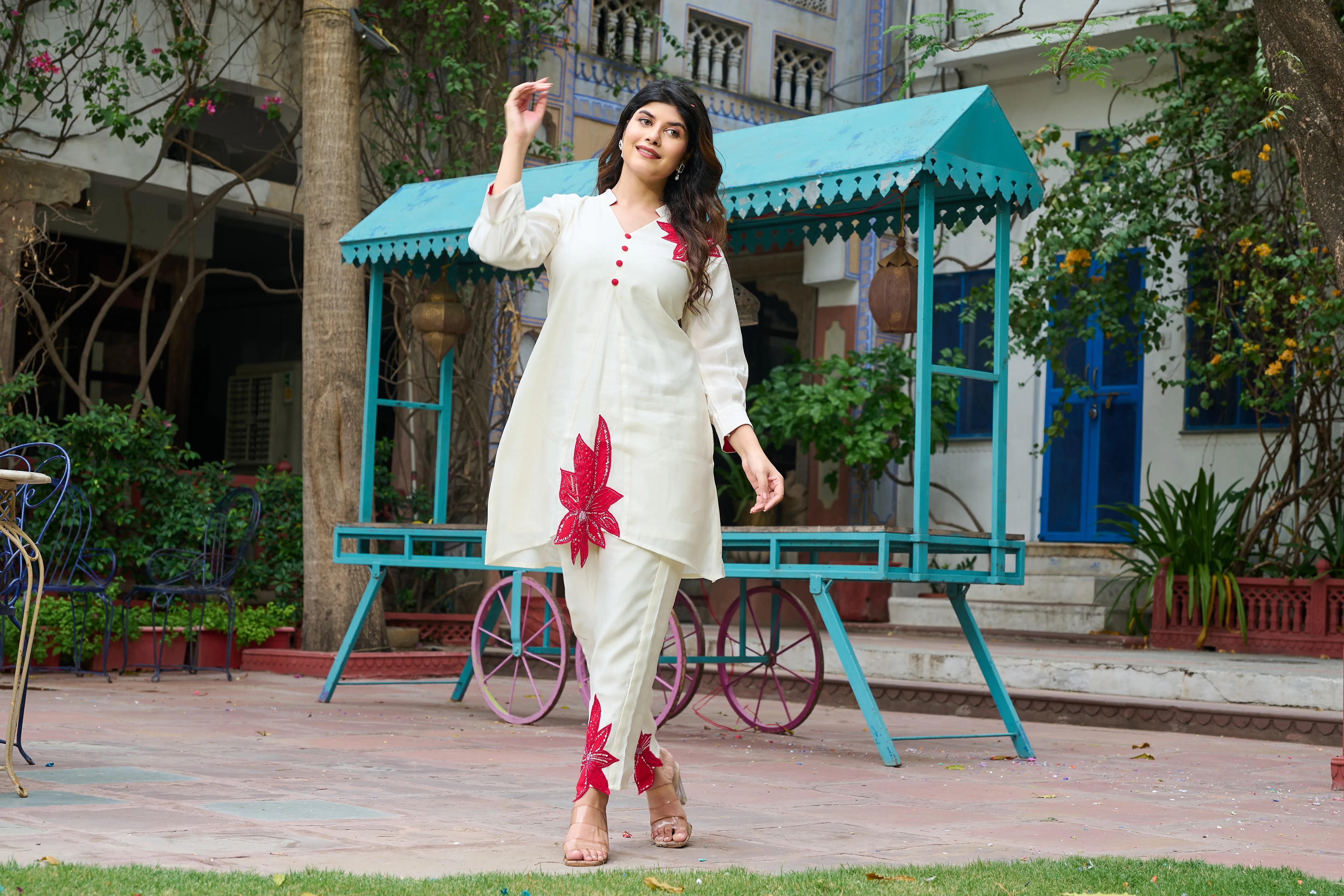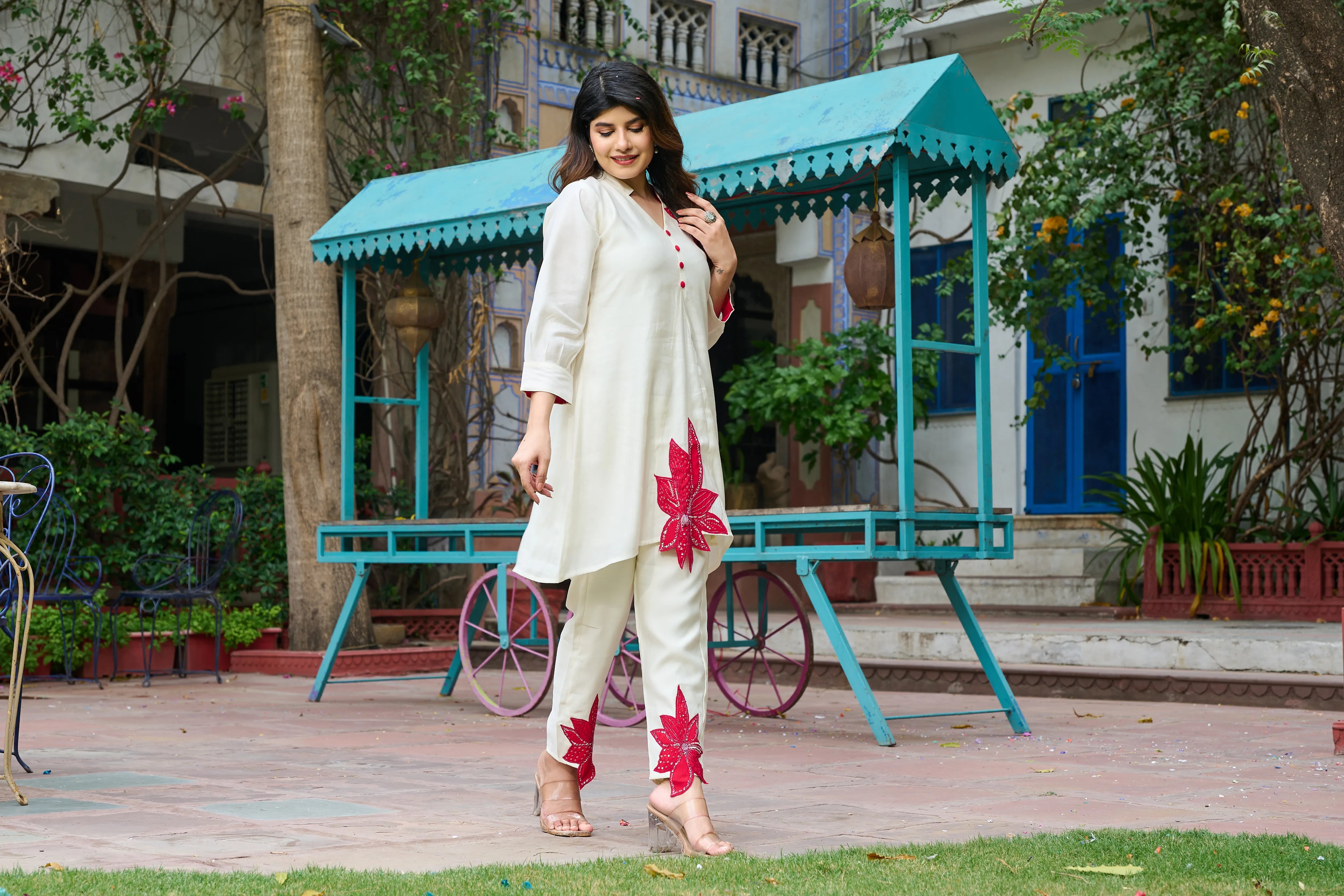 Ivory Ember: Red Appliqué Silk Kurta Co-ord Set