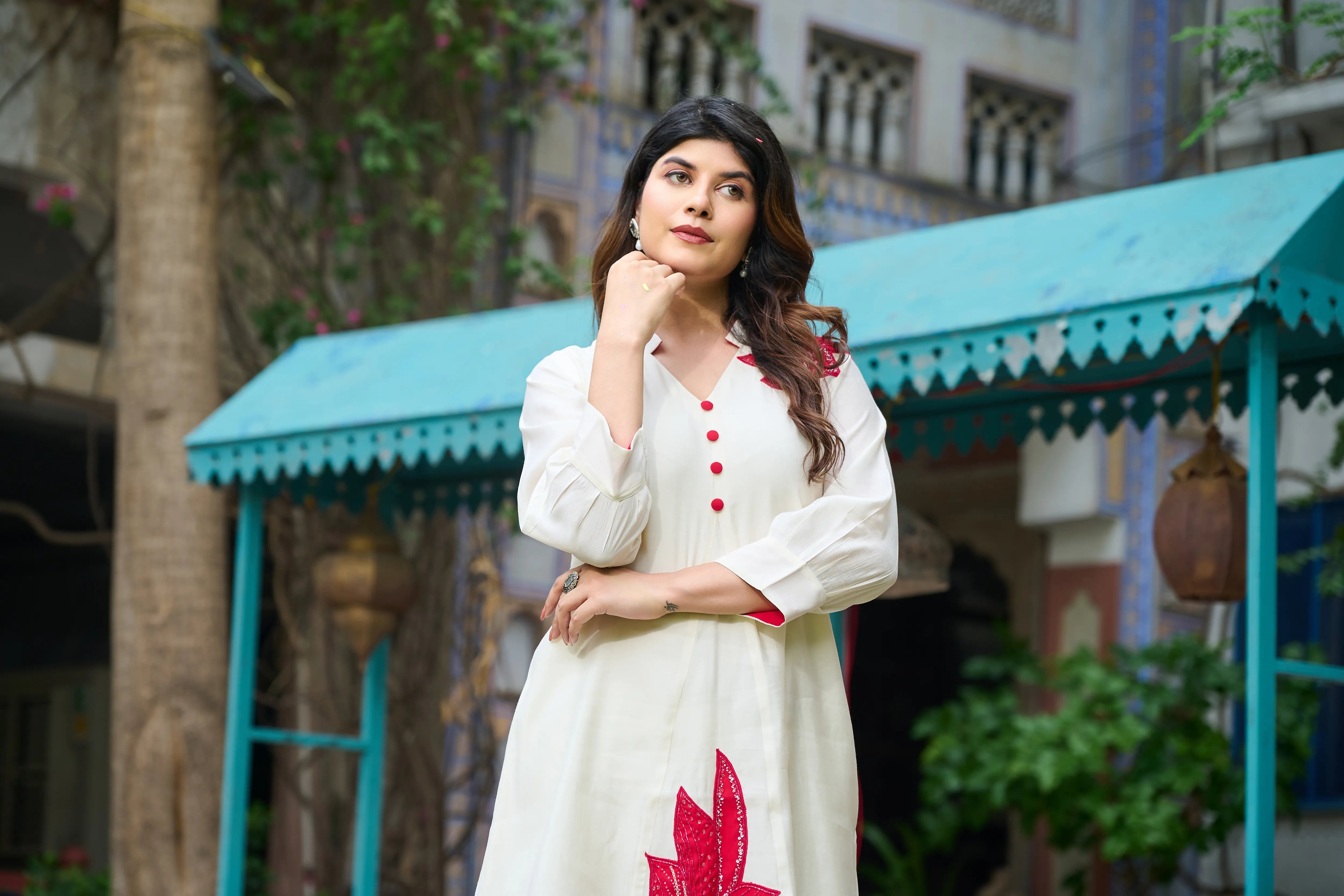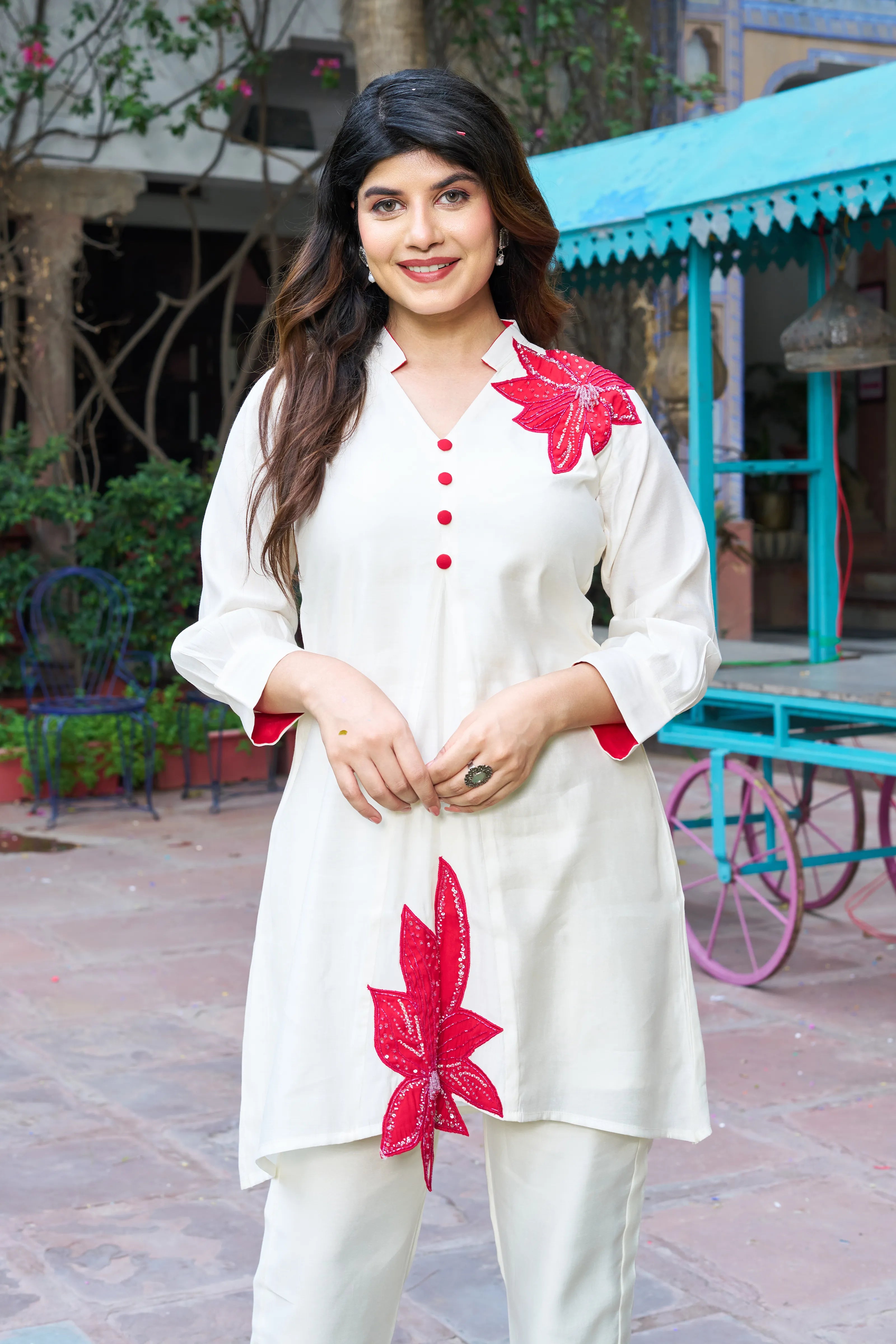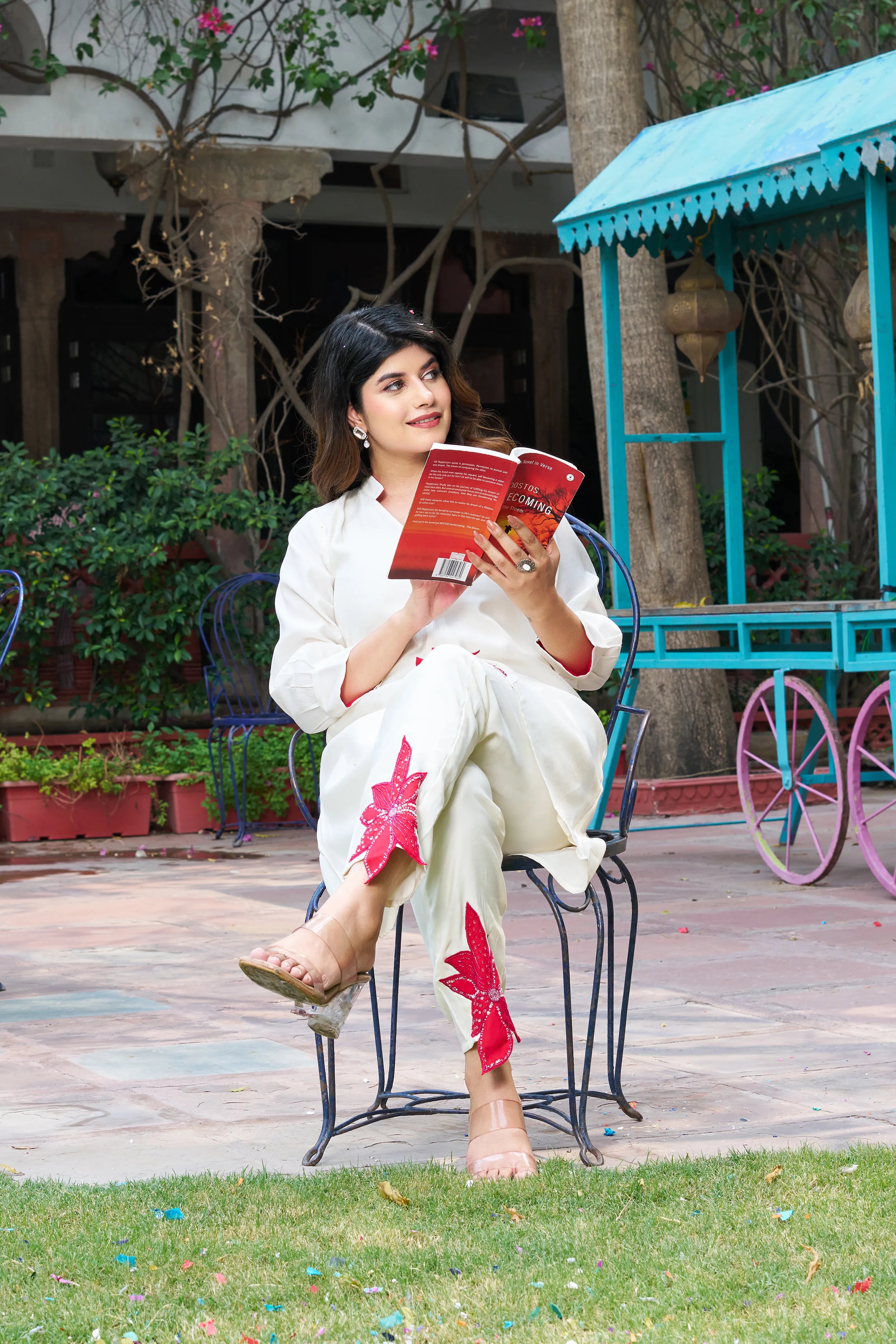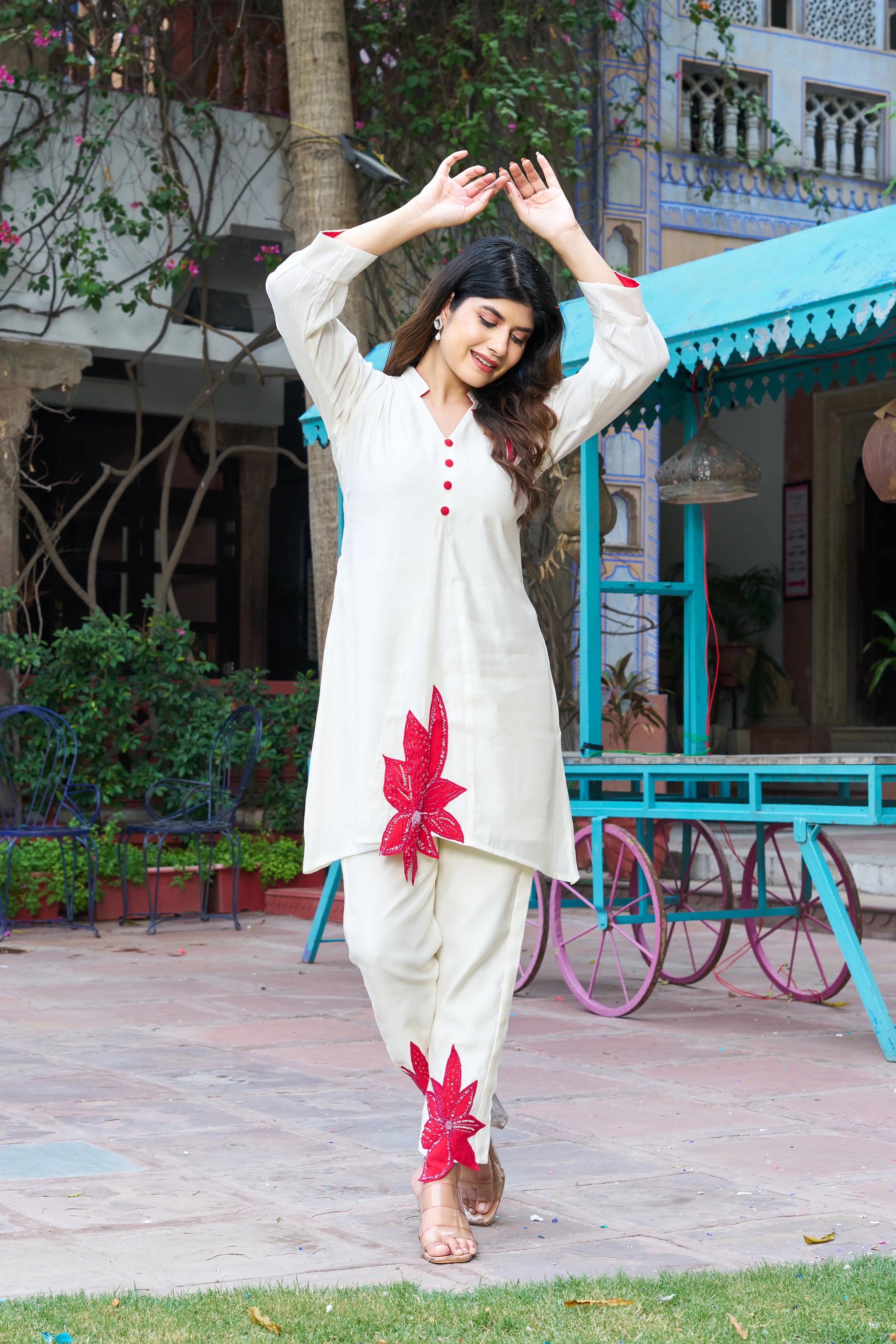 Ivory Ember: Red Appliqué Silk Kurta Co-ord Set