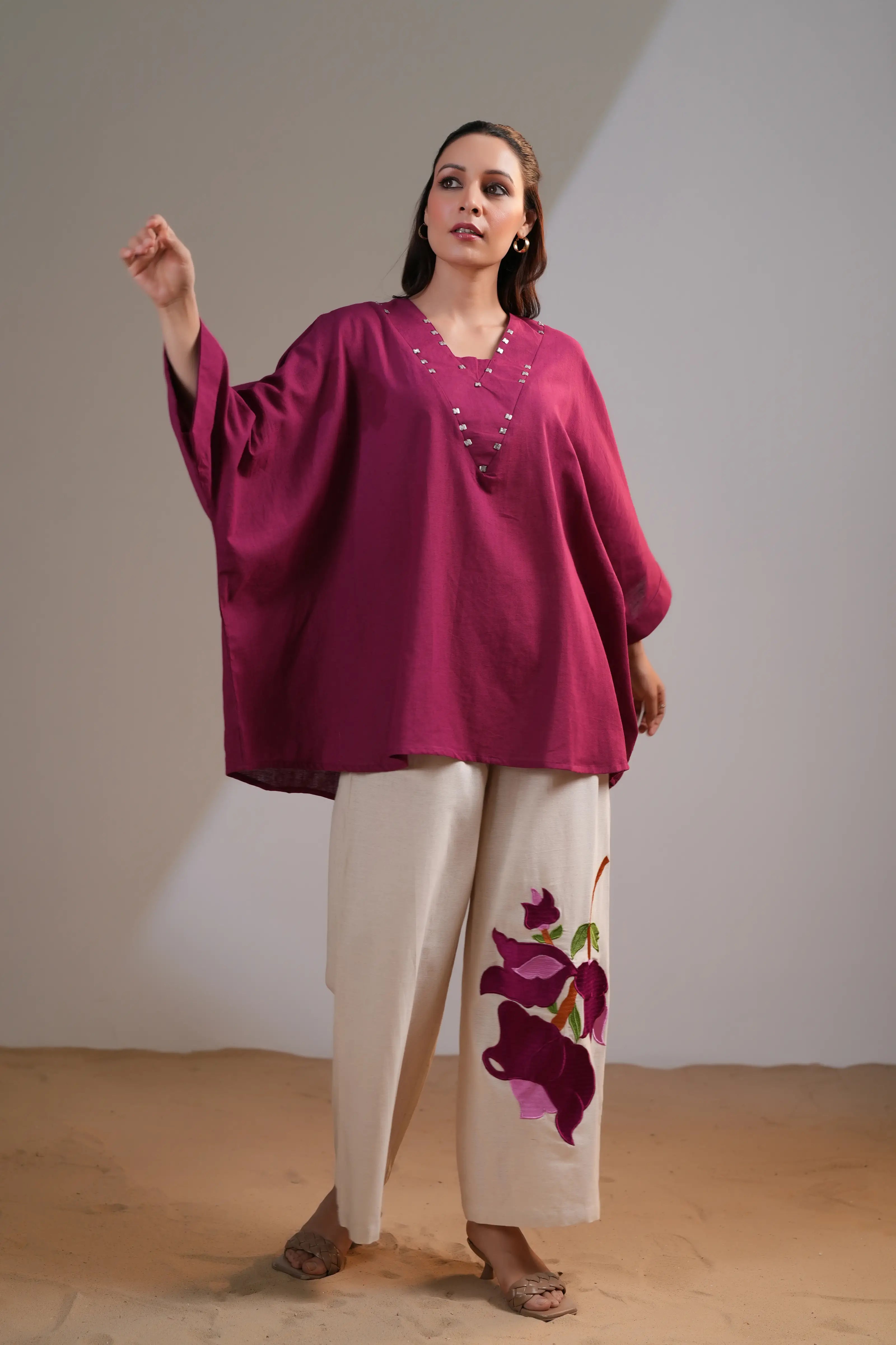 Make a striking statement with this Magenta Pink Co-Ord Set, designed to exude effortless sophistication. Featuring a silver-embellished V-neck top and placement-embroidered wide-leg pants, this ensemble is crafted from soft and breathable cotton flex, ensuring all-day comfort without compromising on style.