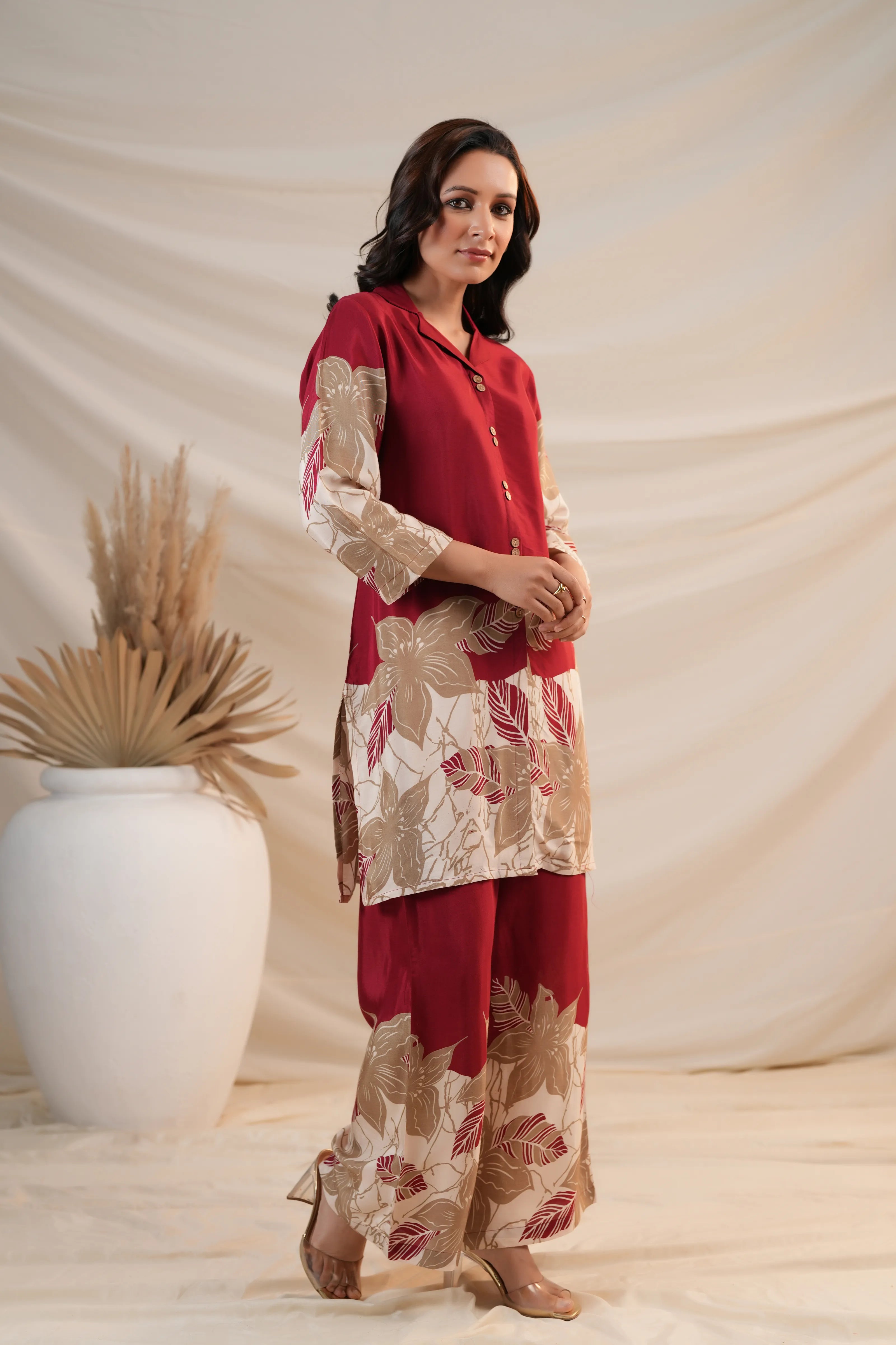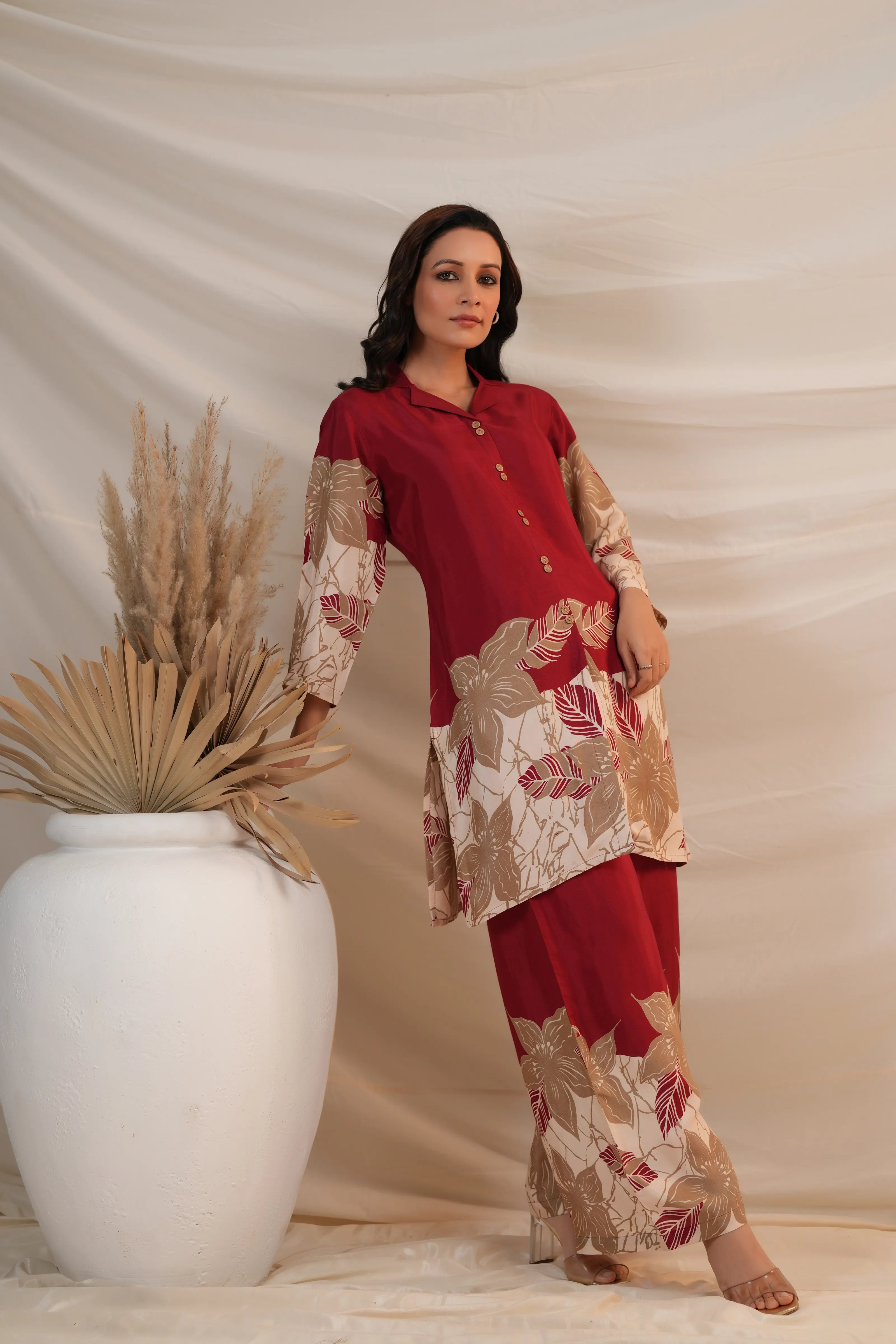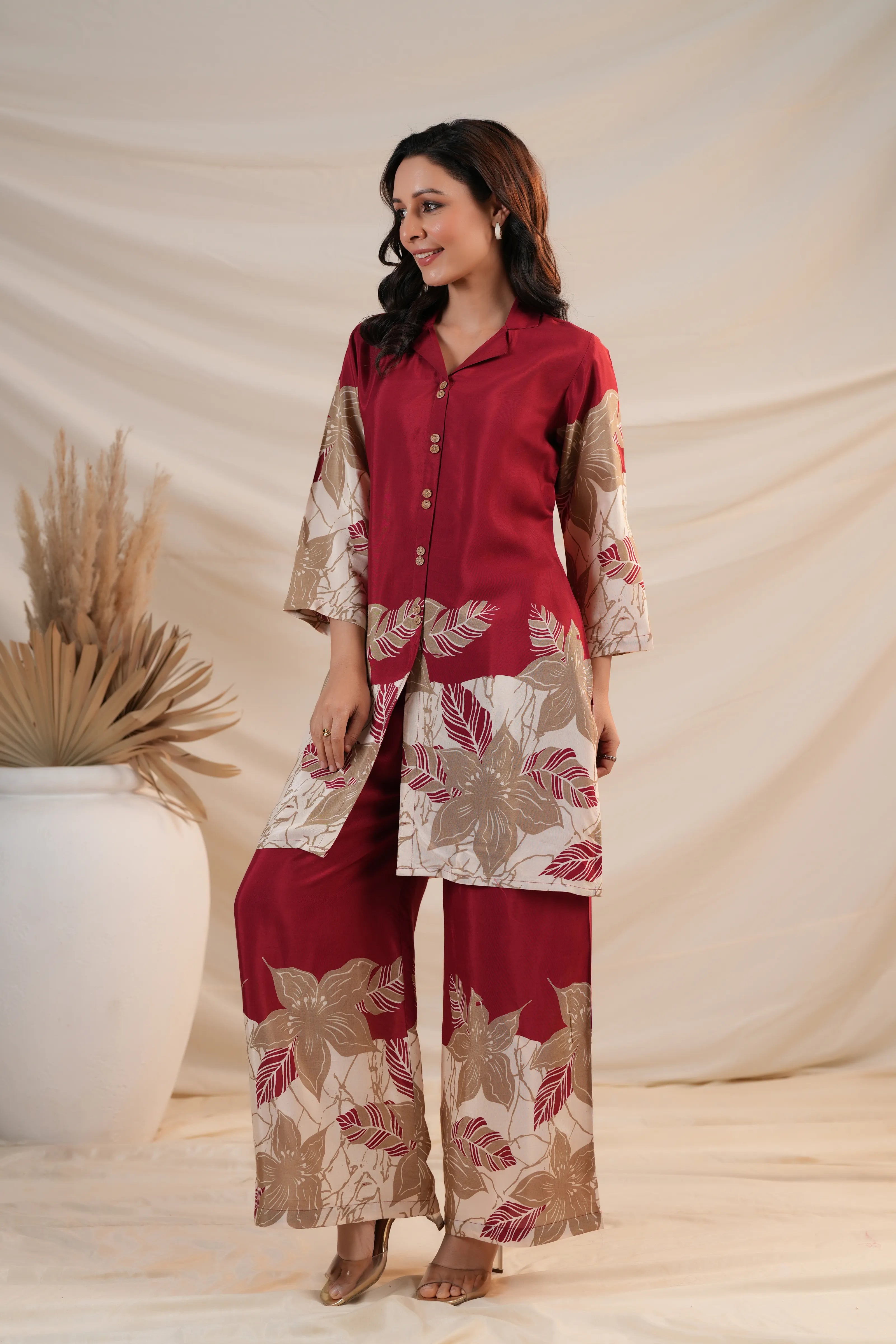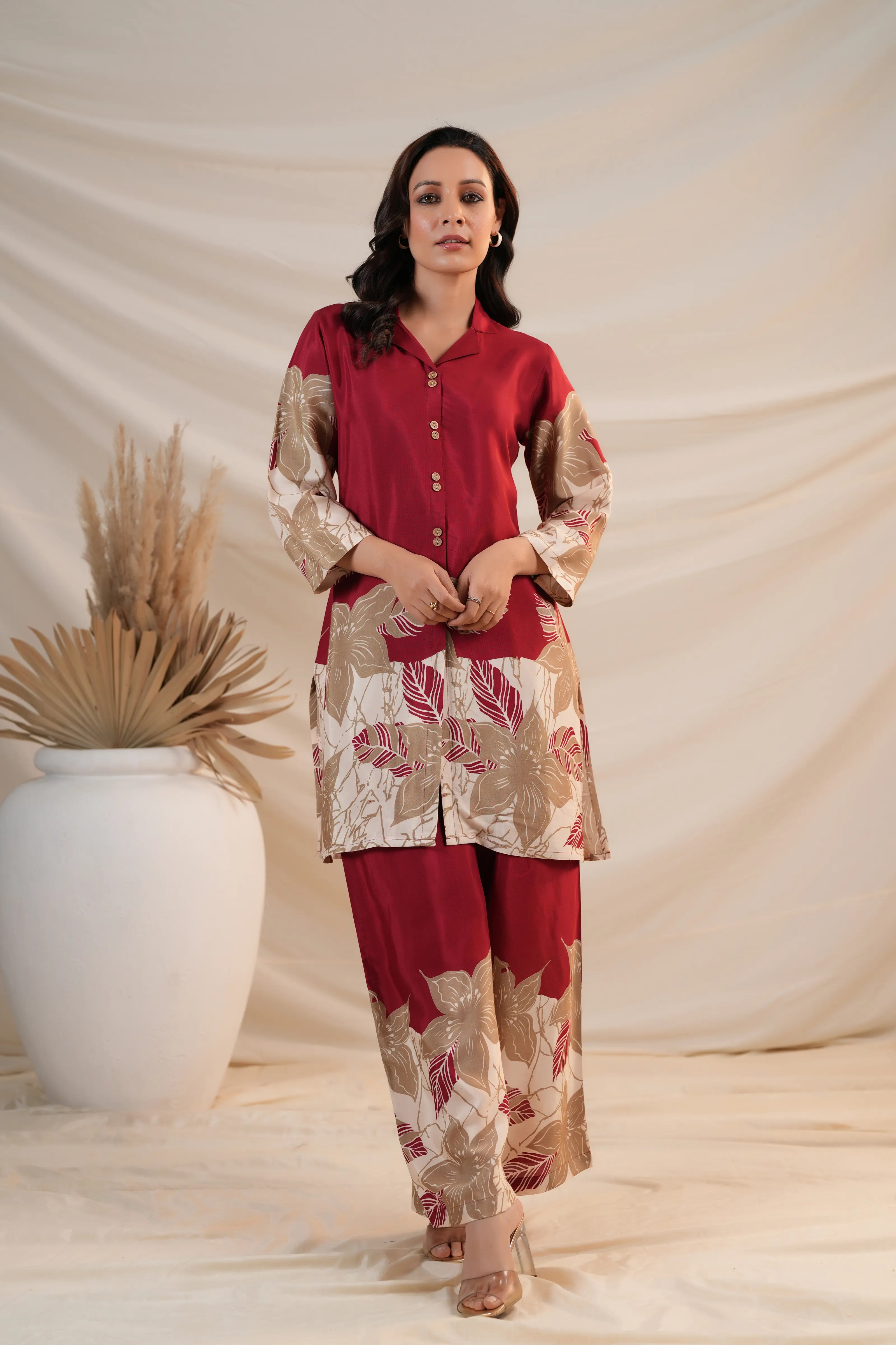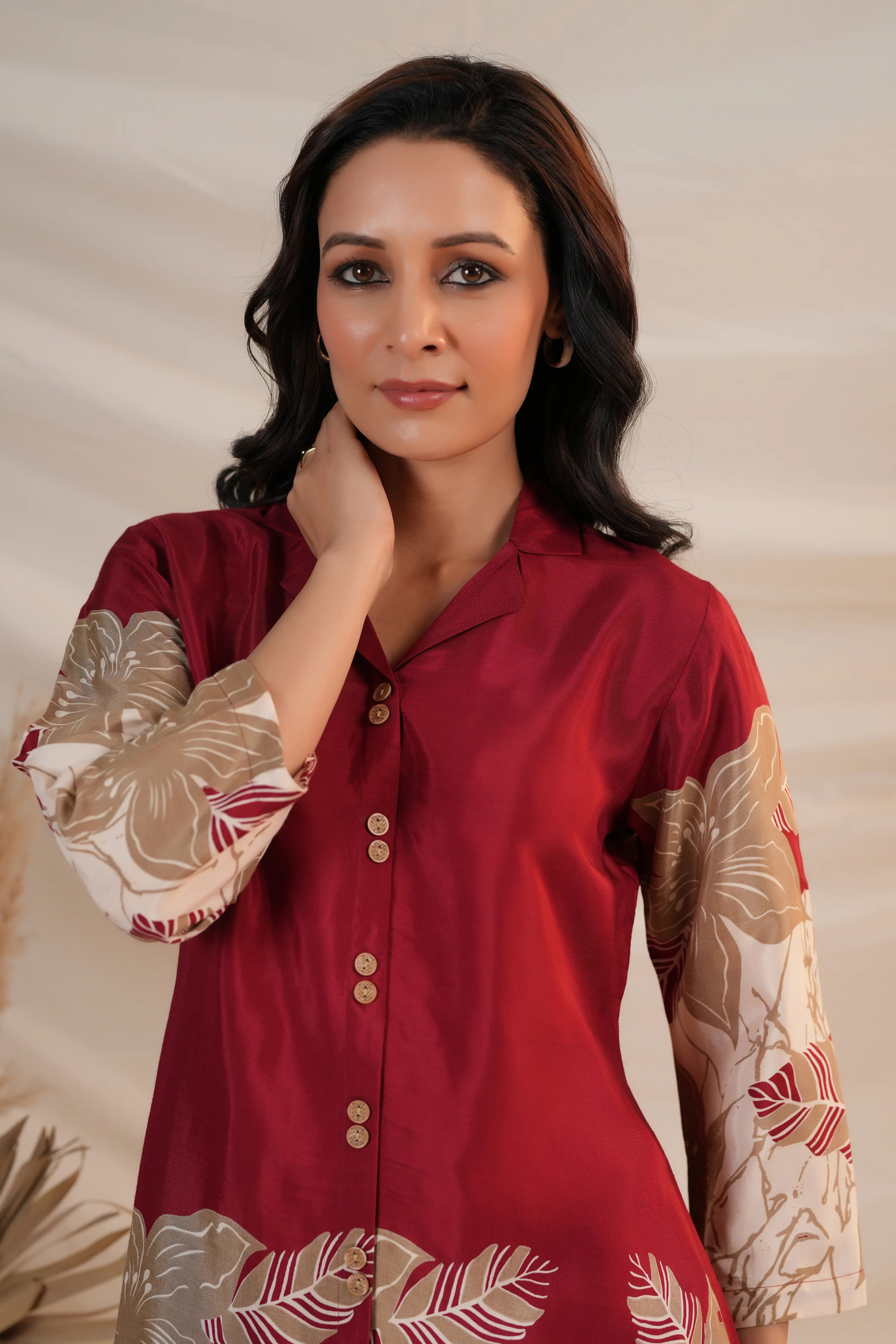 Crimson Bloom: Maroon Bold Floral Printed Russian Silk Co-ord Set
