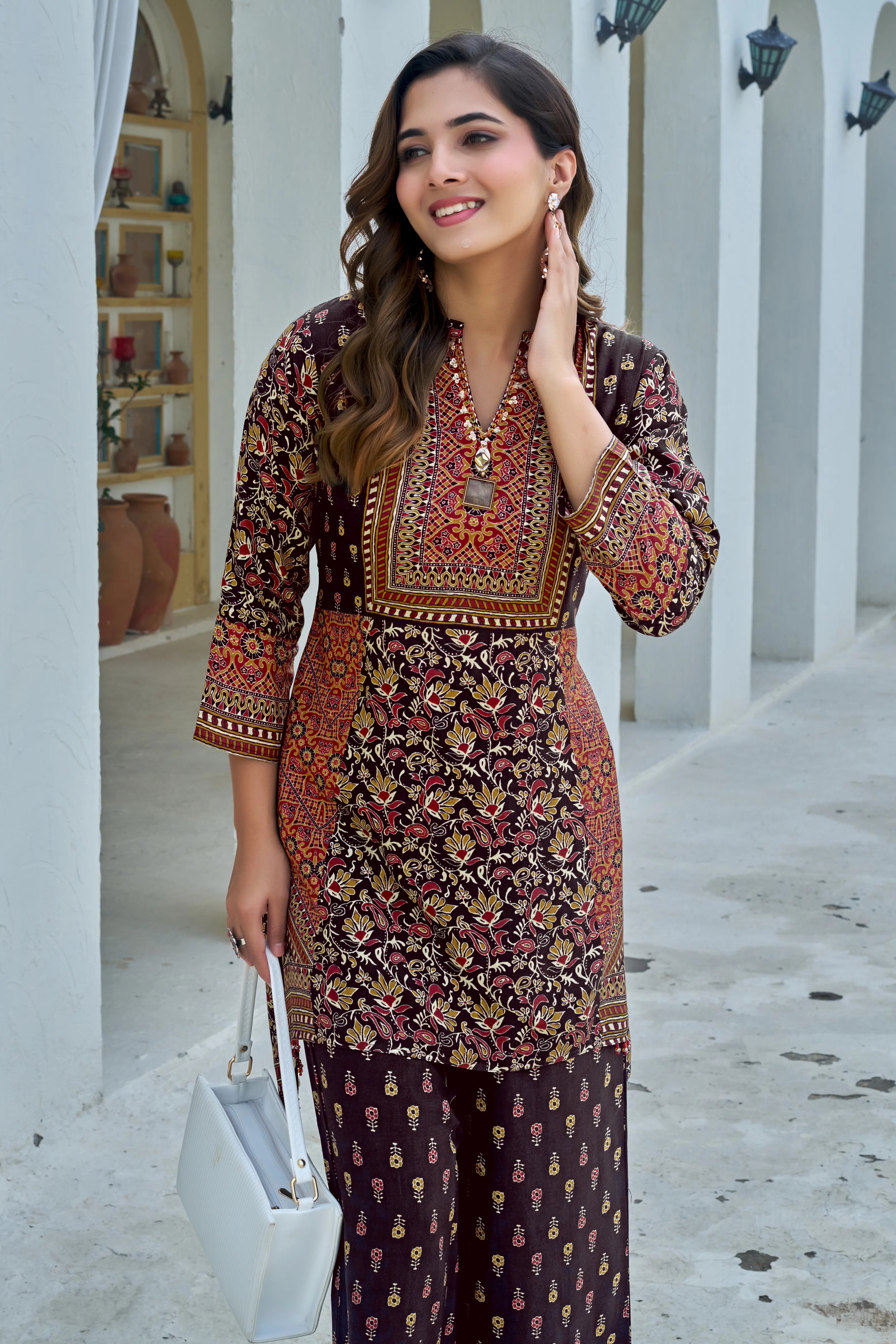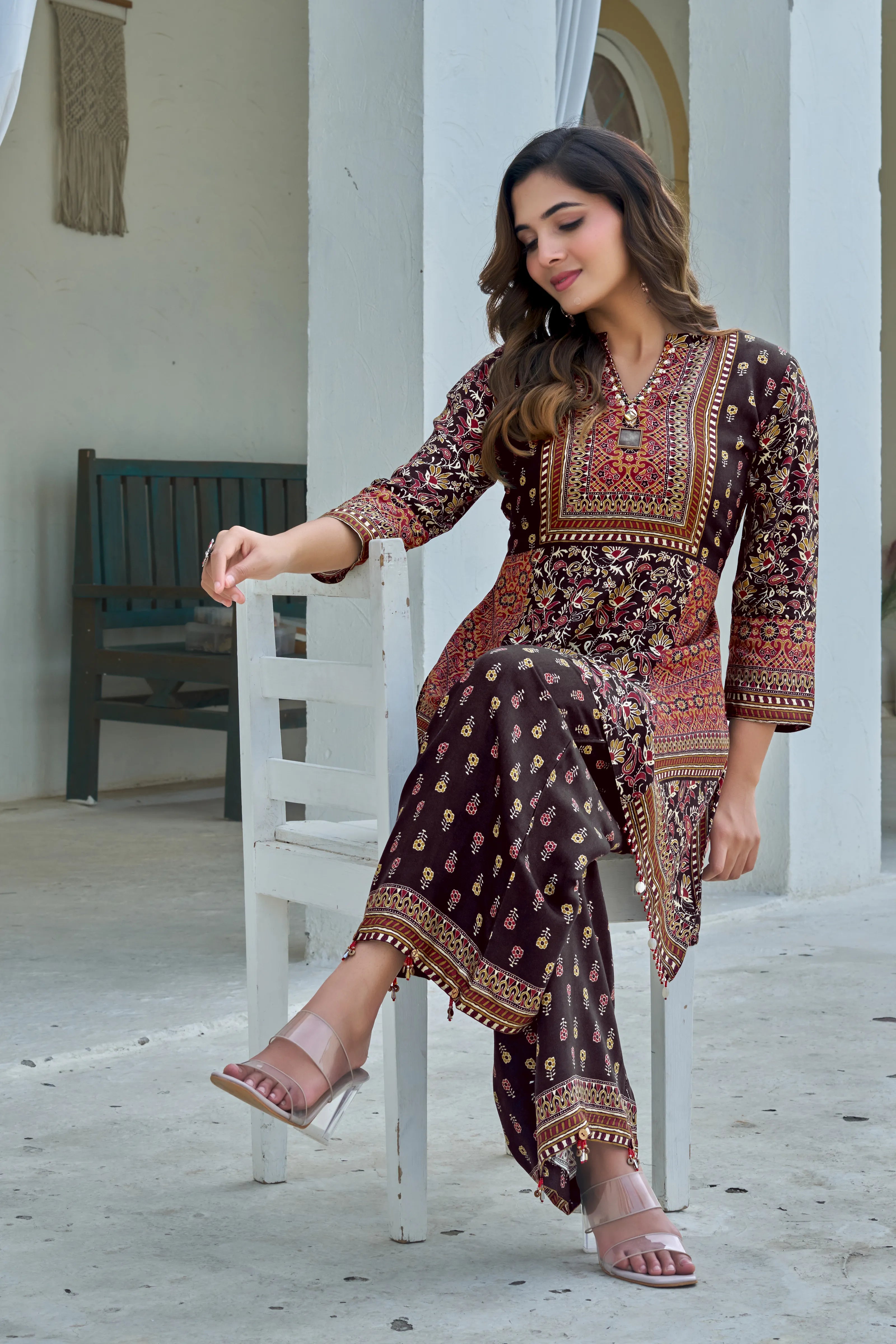 The Heritage Bloom co-ord set is an ode to timeless Indian craftsmanship. Crafted in soft, premium viscose silk, this co-ord features an intricate mix of ethnic motifs in a vibrant palette. A statement brooch and delicate embellishments adorn the V-neck with mandarin collar, while contrast patch panels and beadwork at the hem add a layered, artisanal feel. The coordinated palazzo pants bring a subtle print play to balance this richly designed ensemble.