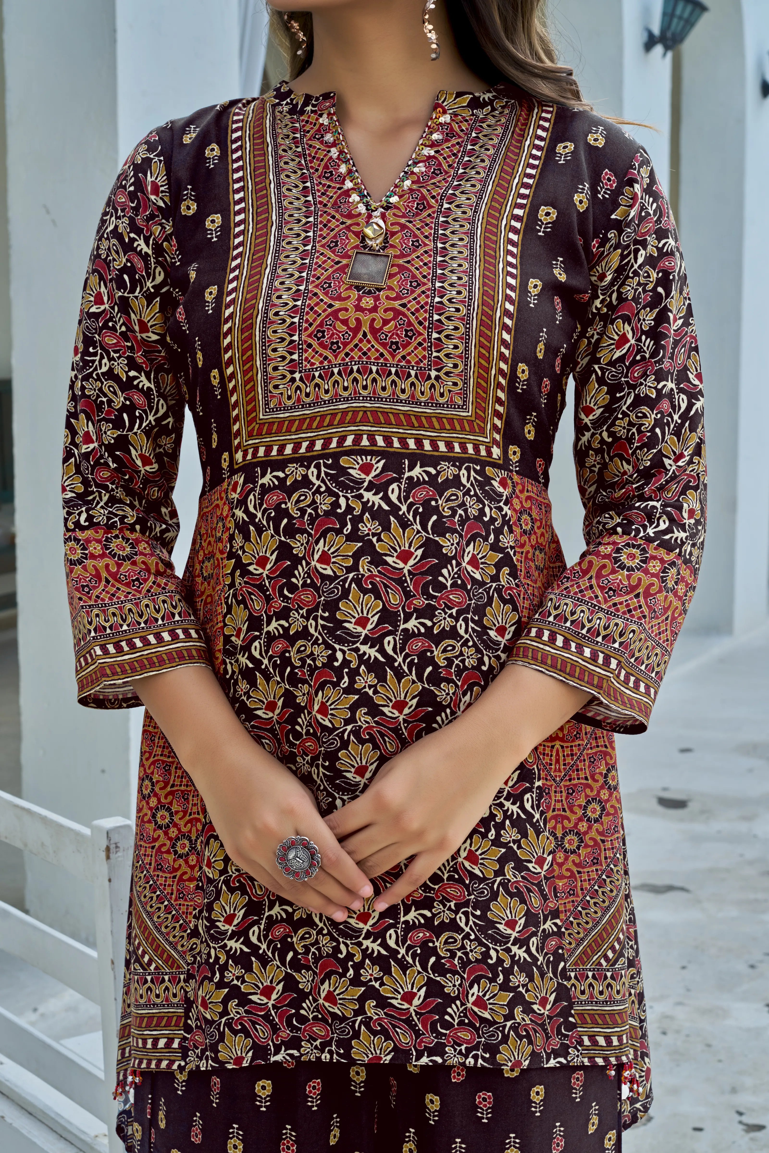 – 3/4th sleeves with intricate printed cuff