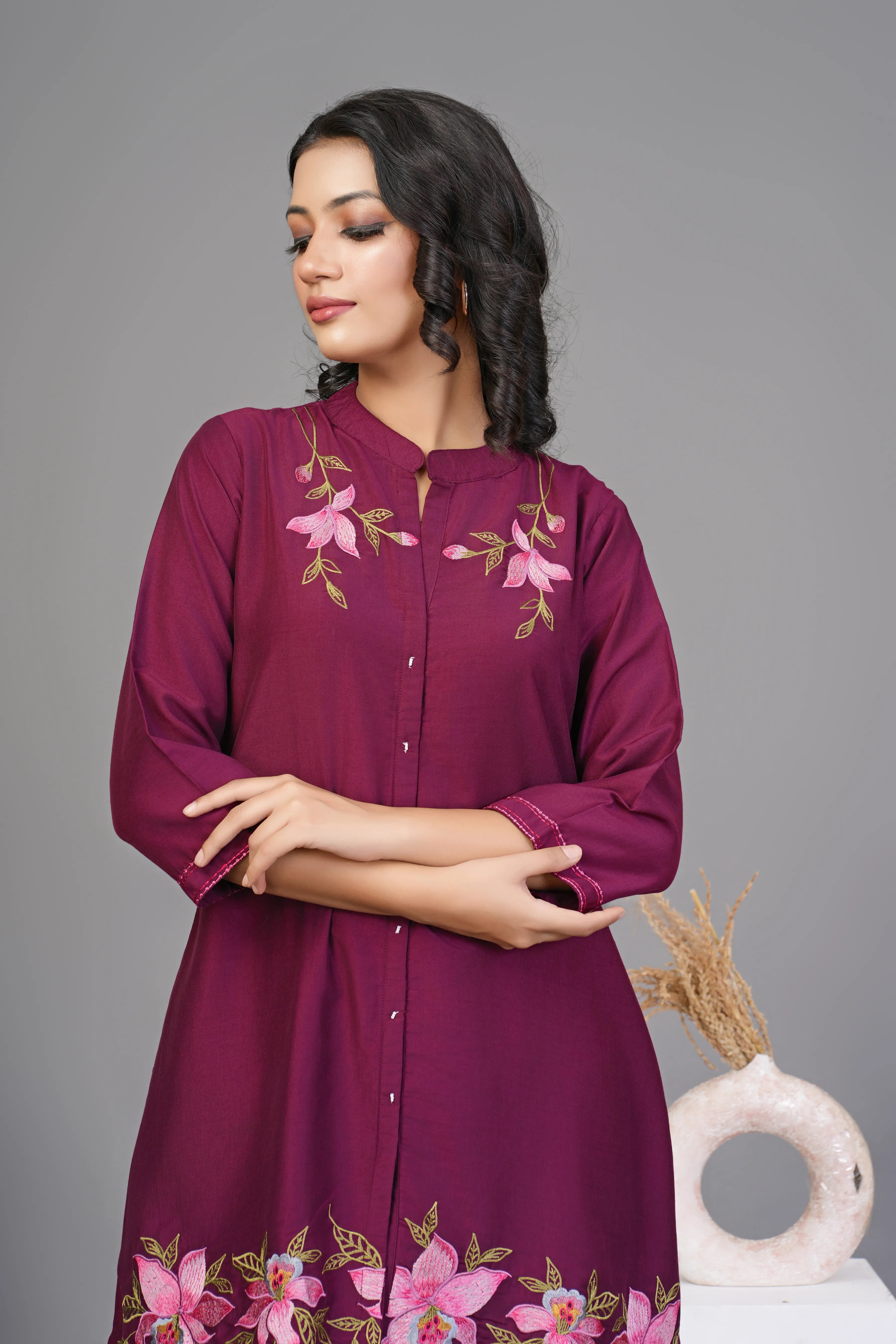 - Top Design: Multi-Thread Floral Embroidery, Mandarian Collar, 3/4th Sleeves with Scalloped Hem Detailing
