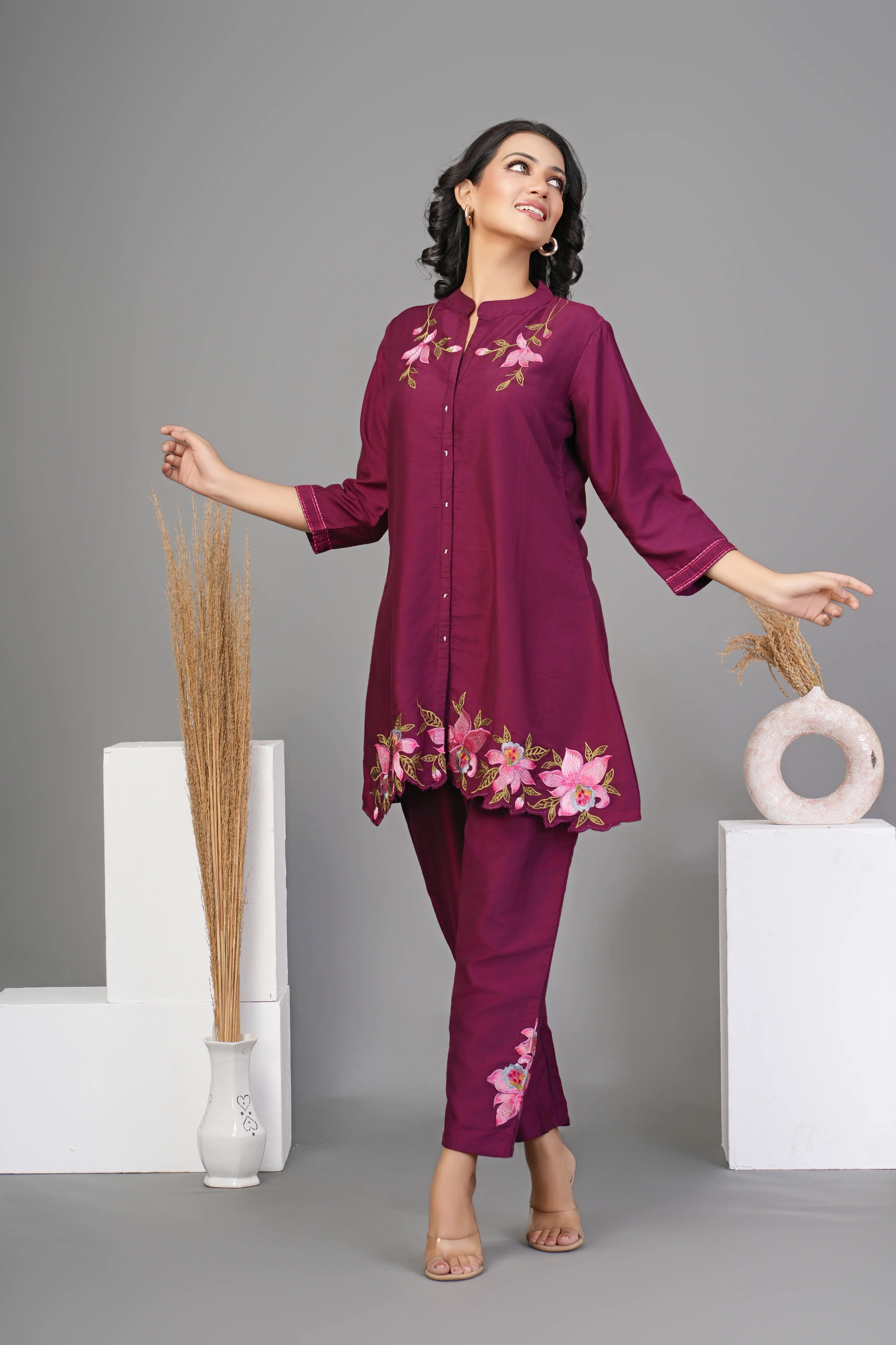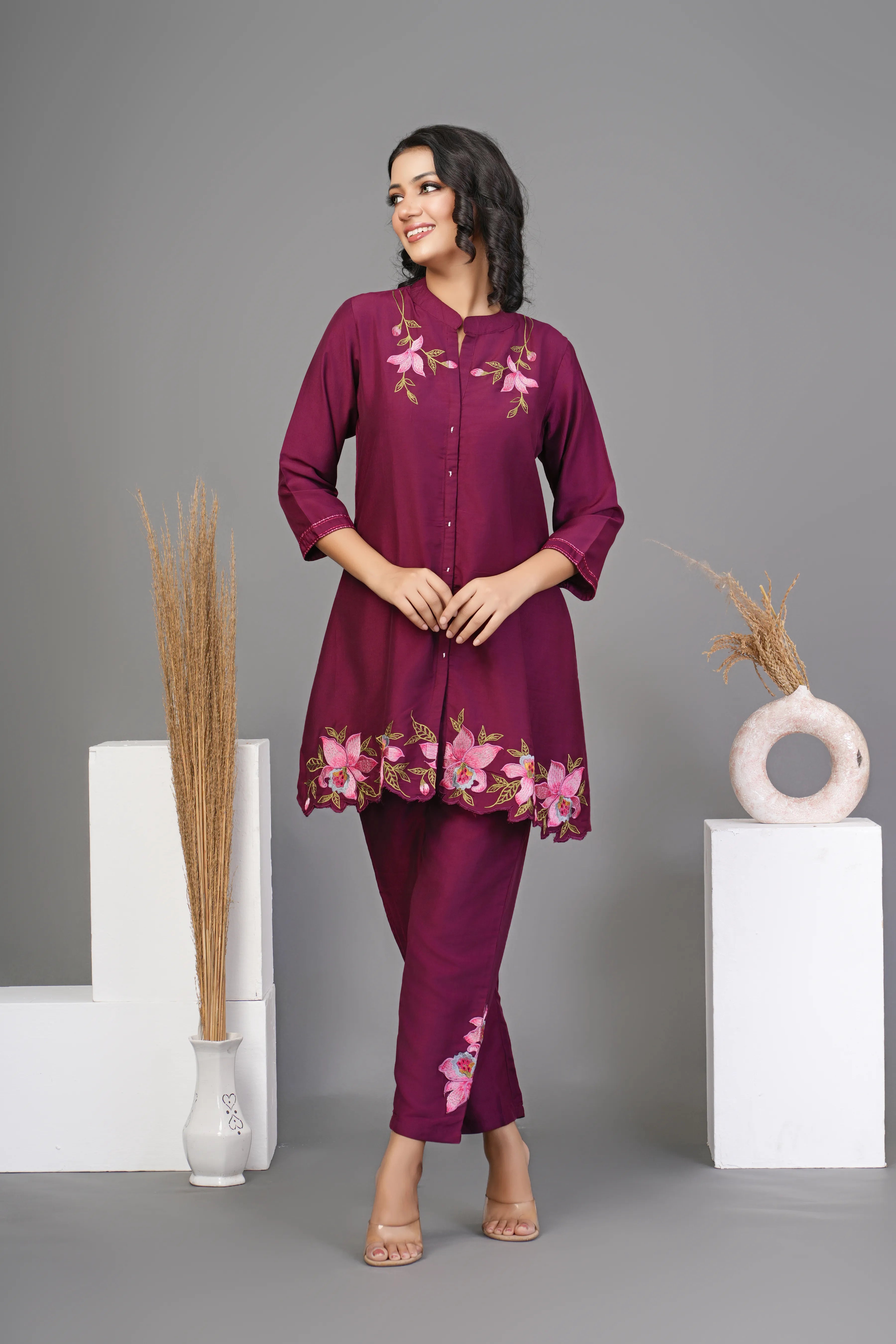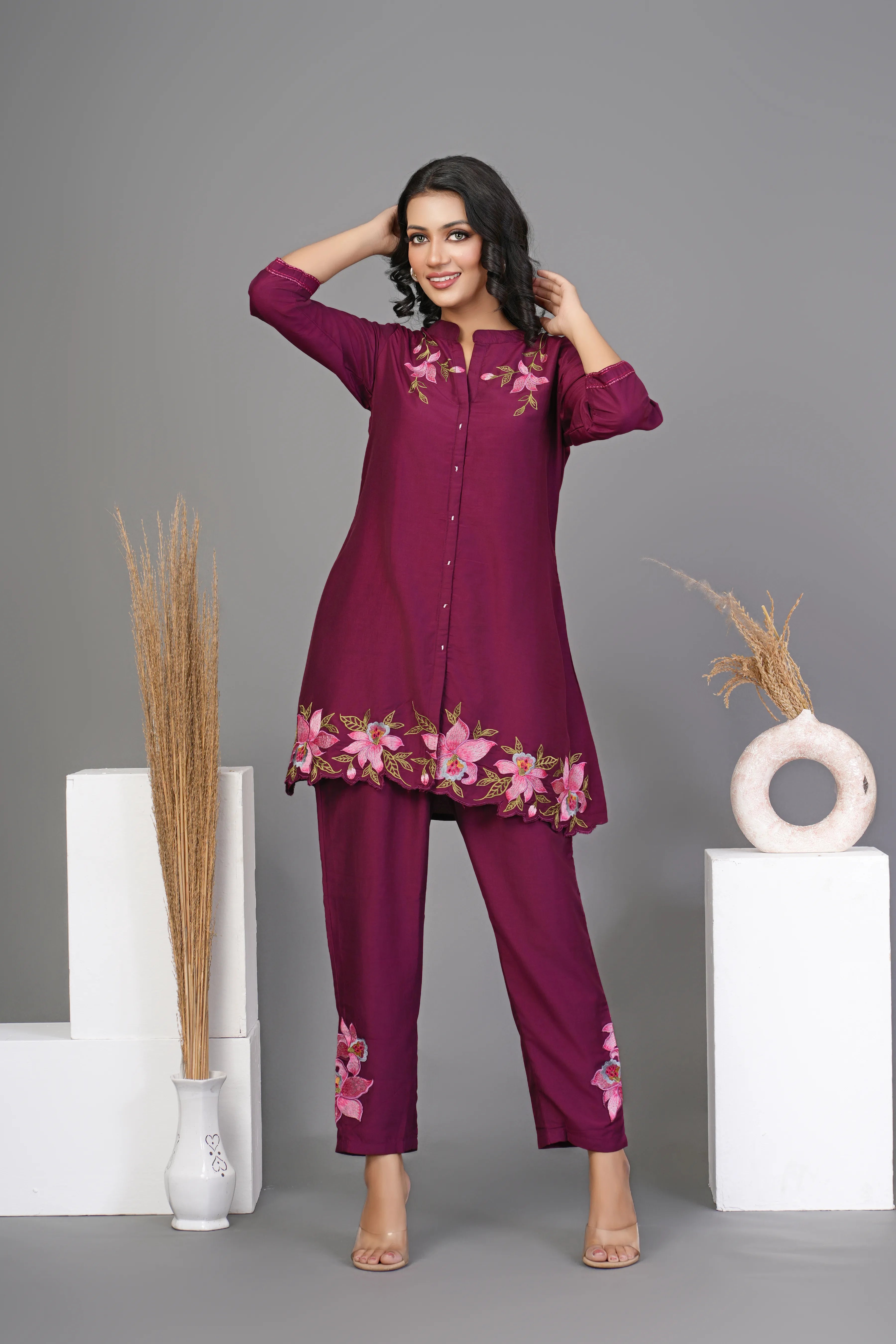 Step into timeless sophistication with this maroon co-ord set, crafted from luxurious chinon fabric for a graceful and flowy silhouette. The top features intricate multi-thread floral embroidery, a classic round neck, and 3/4th sleeves with delicate scalloped hem detailing, adding a touch of refined charm.