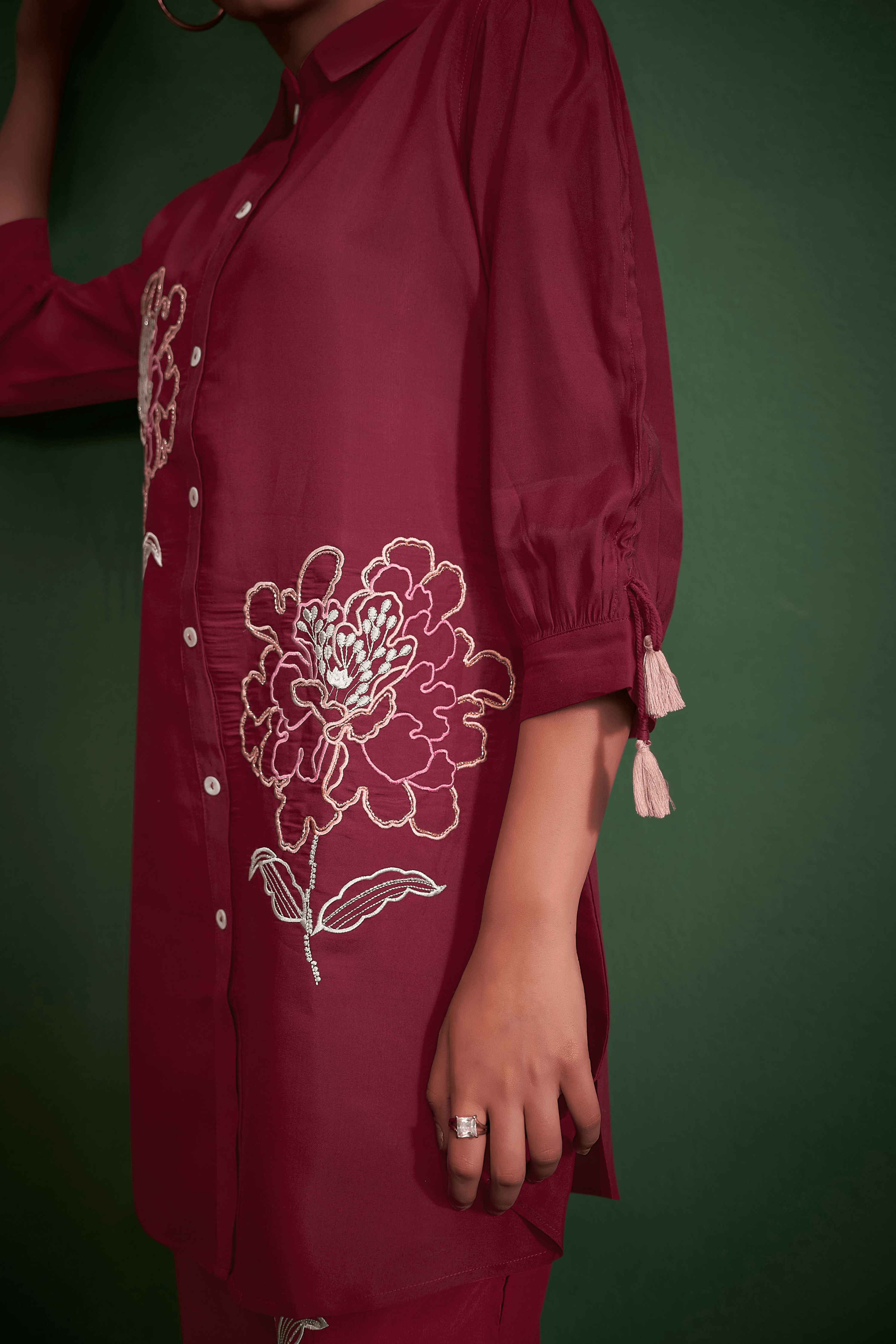 Exude timeless elegance with this maroon embroidered kurta and trouser set, crafted from luxurious viscose fabric for a fluid and graceful silhouette. The A-line kurta features a spread collar, intricate floral embroidery at the front, full button closure, and three-quarter sleeves with charming tassel tie-up cuffs, adding a unique touch of sophistication.
