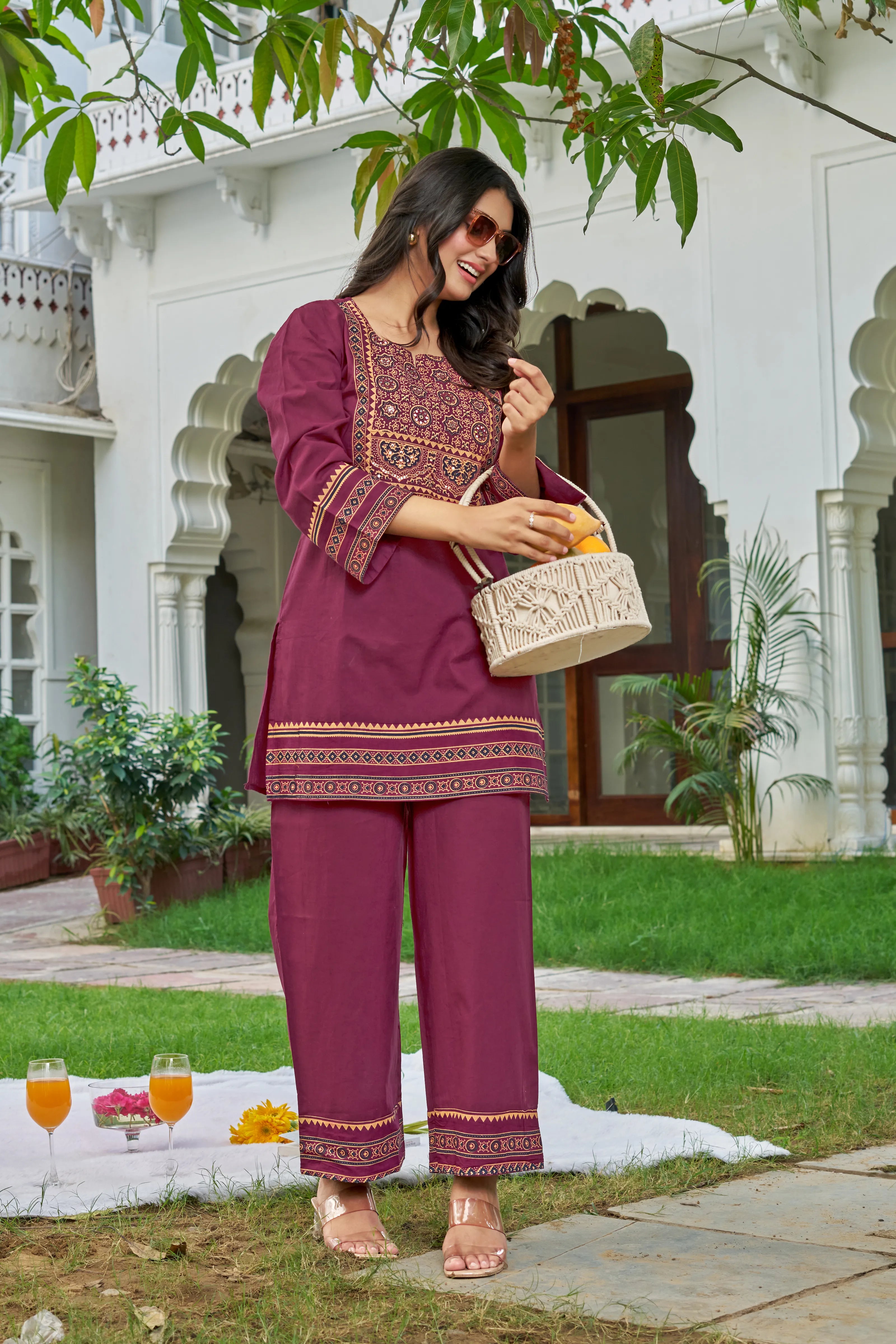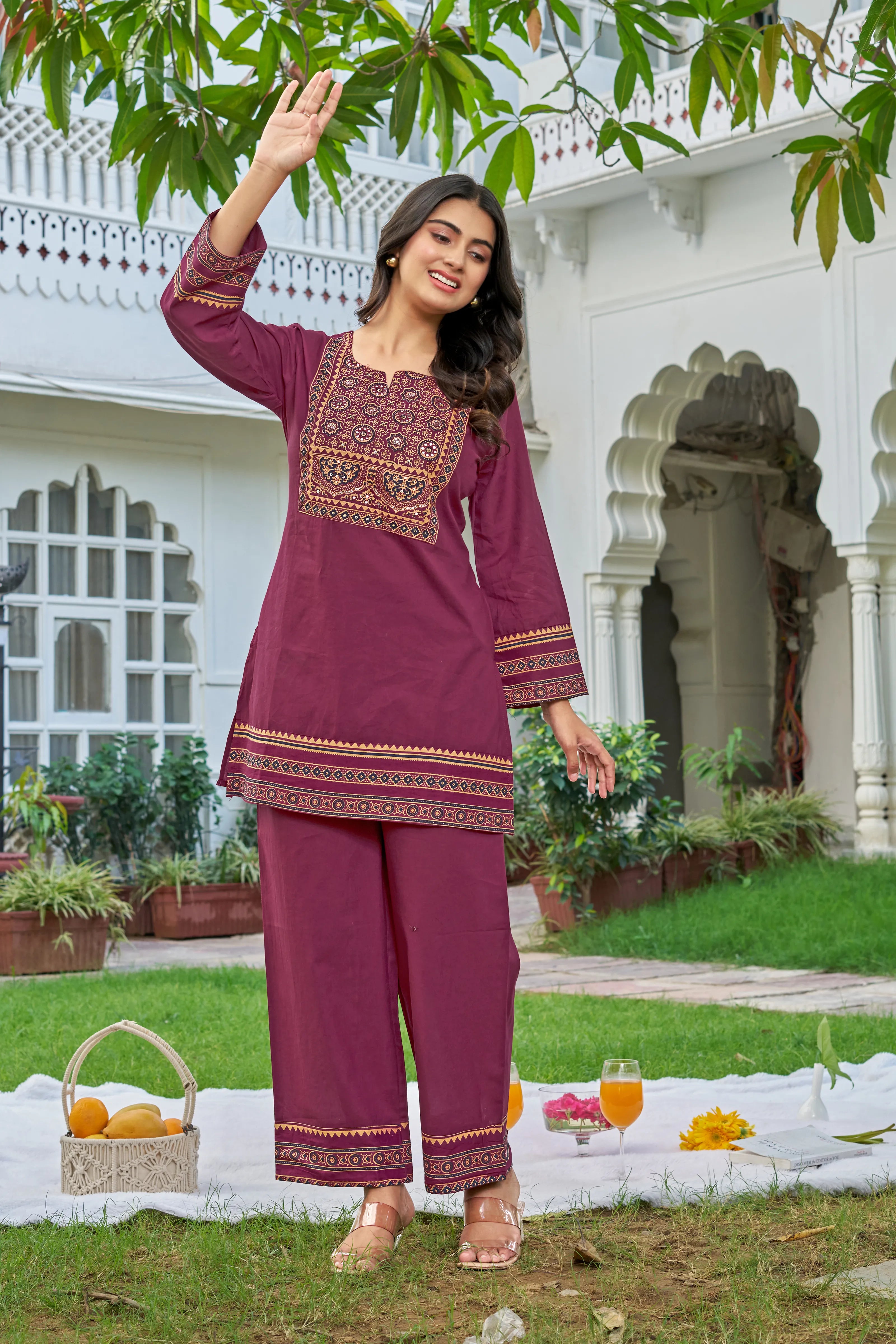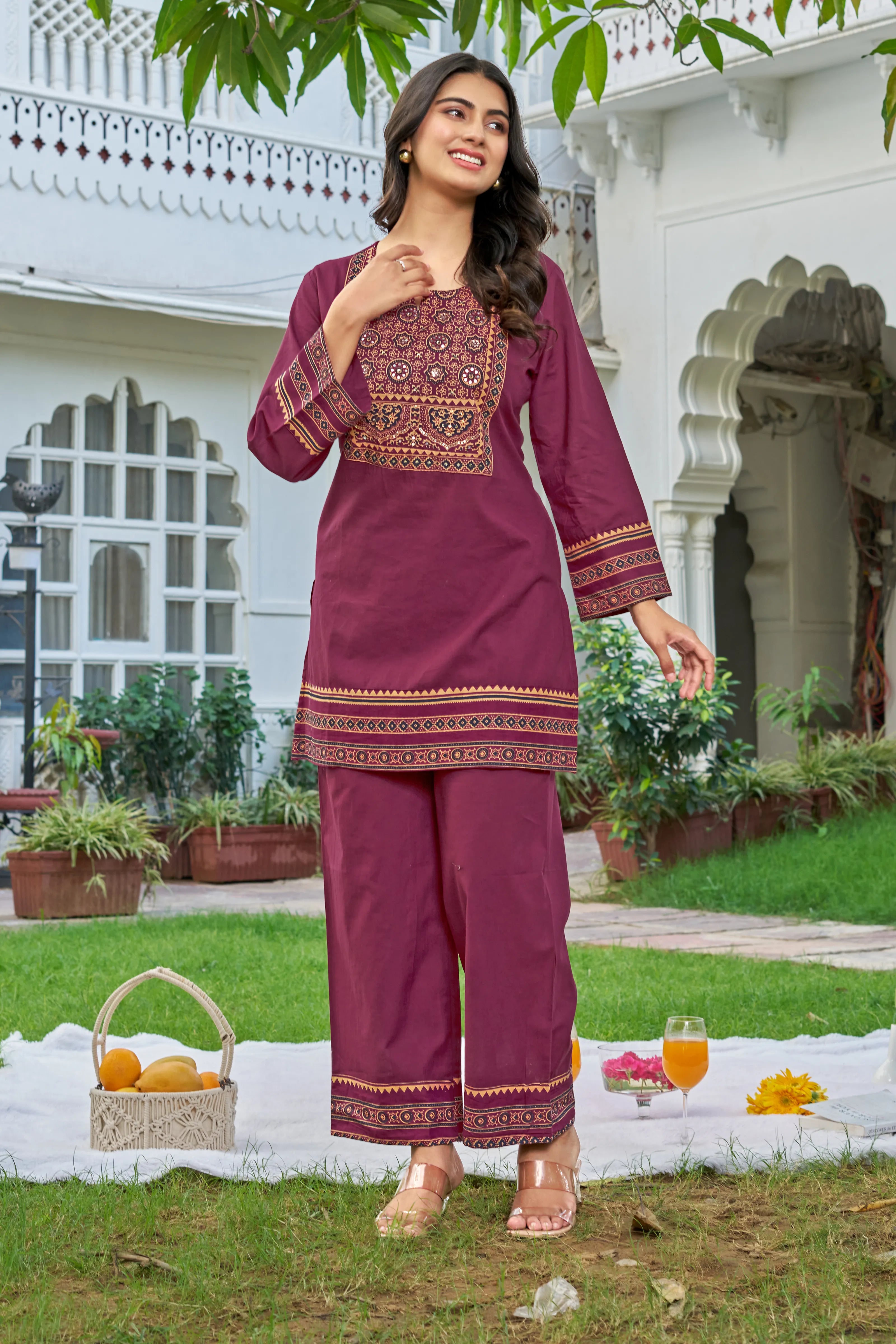 Timeless tradition meets modern flair in our Festive Maroon co-ord set. Designed in a rich maroon hue, the outfit features an intricate ethnic print patch at the yoke, elevated with fine sequin and mirror work—perfect for understated festive glam.