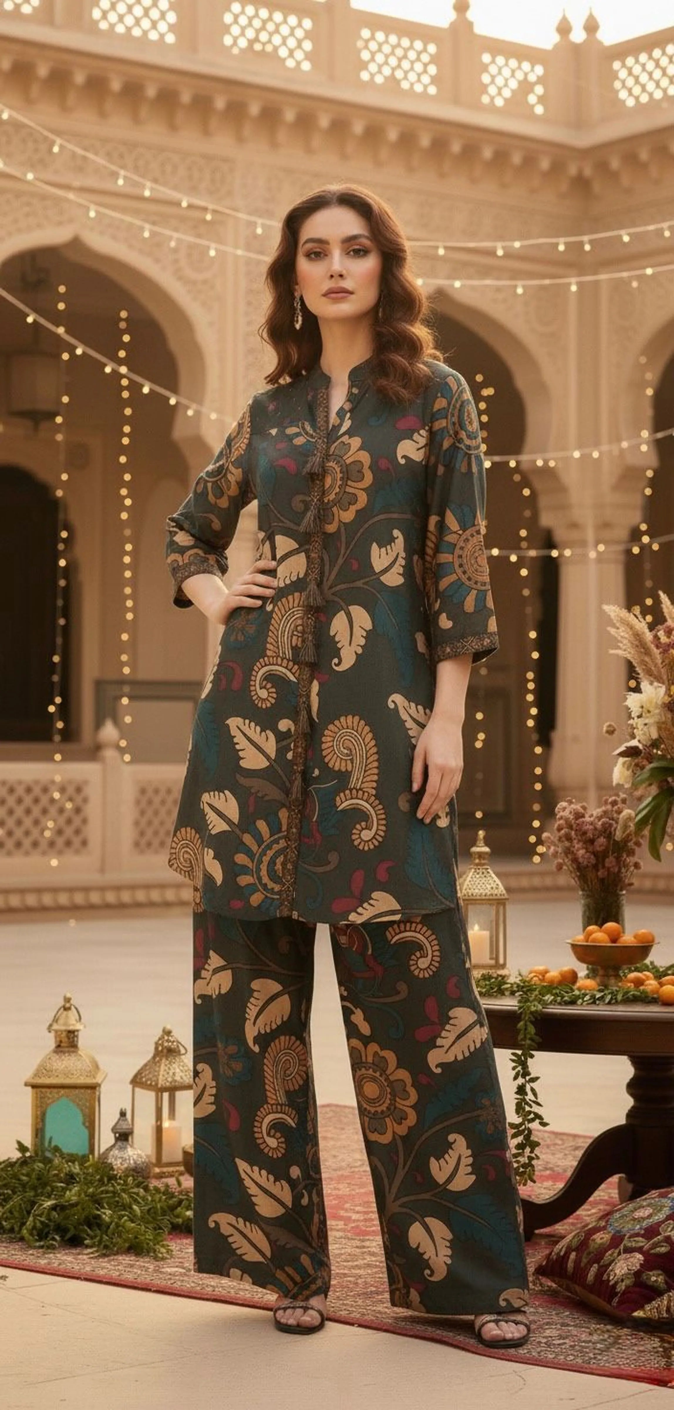 Immerse yourself in the timeless elegance of Kalamkari Charm, a moss green co-ord set that captures the beauty of Indian heritage art with a modern silhouette. Crafted in soft, breathable muslin, this set offers a fluid drape and luxurious comfort, making it ideal for festive brunches, family gatherings, or art-inspired evenings.