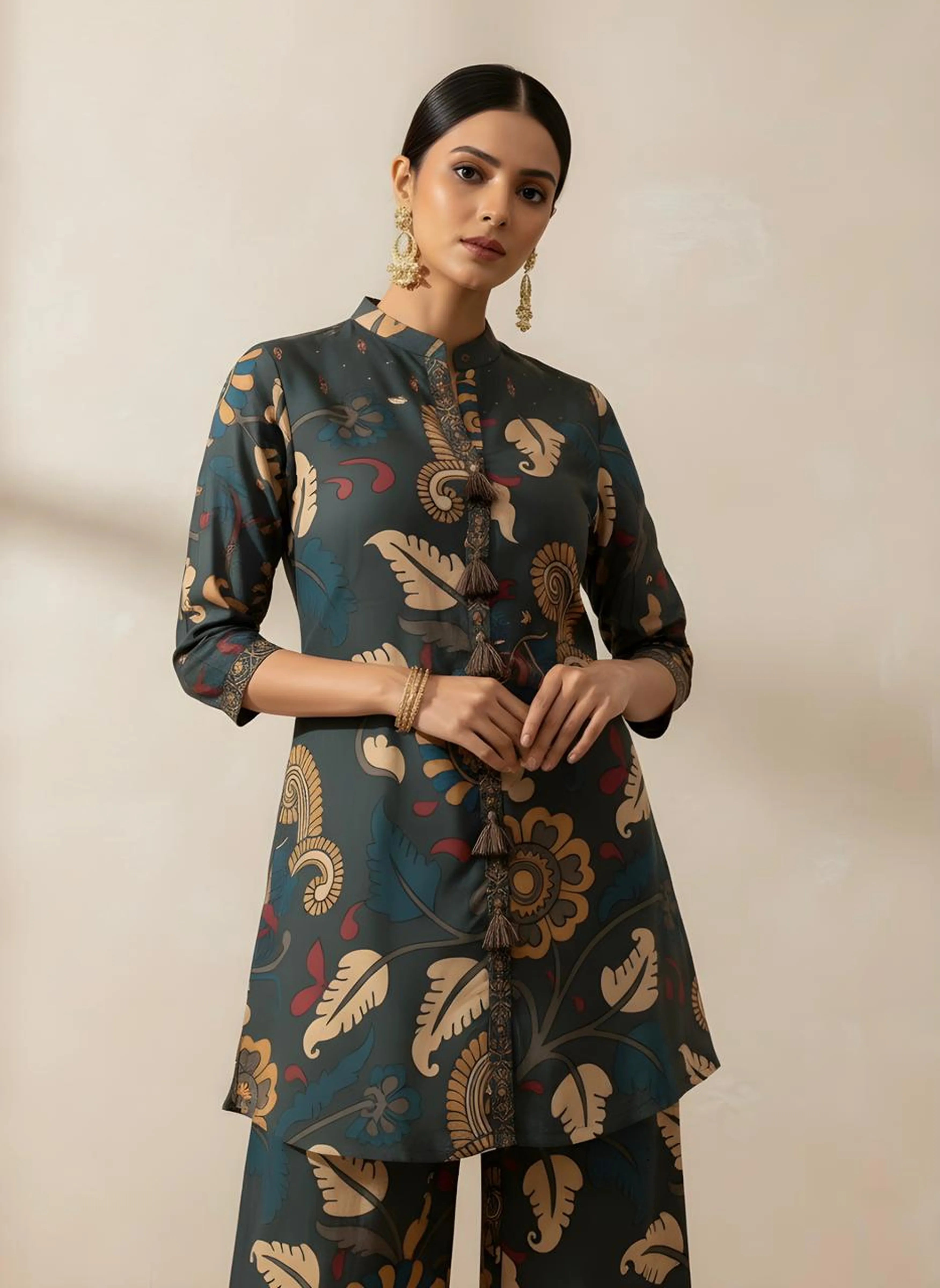 The top features a mandarin collar and 3/4th sleeves, enhanced with delicate tassel detailing along the front panel, adding a touch of playful sophistication. The entire ensemble is adorned with a colorful Kalamkari-style floral print, featuring hues of mustard, maroon, teal, and beige — beautifully balanced against the deep moss green base.