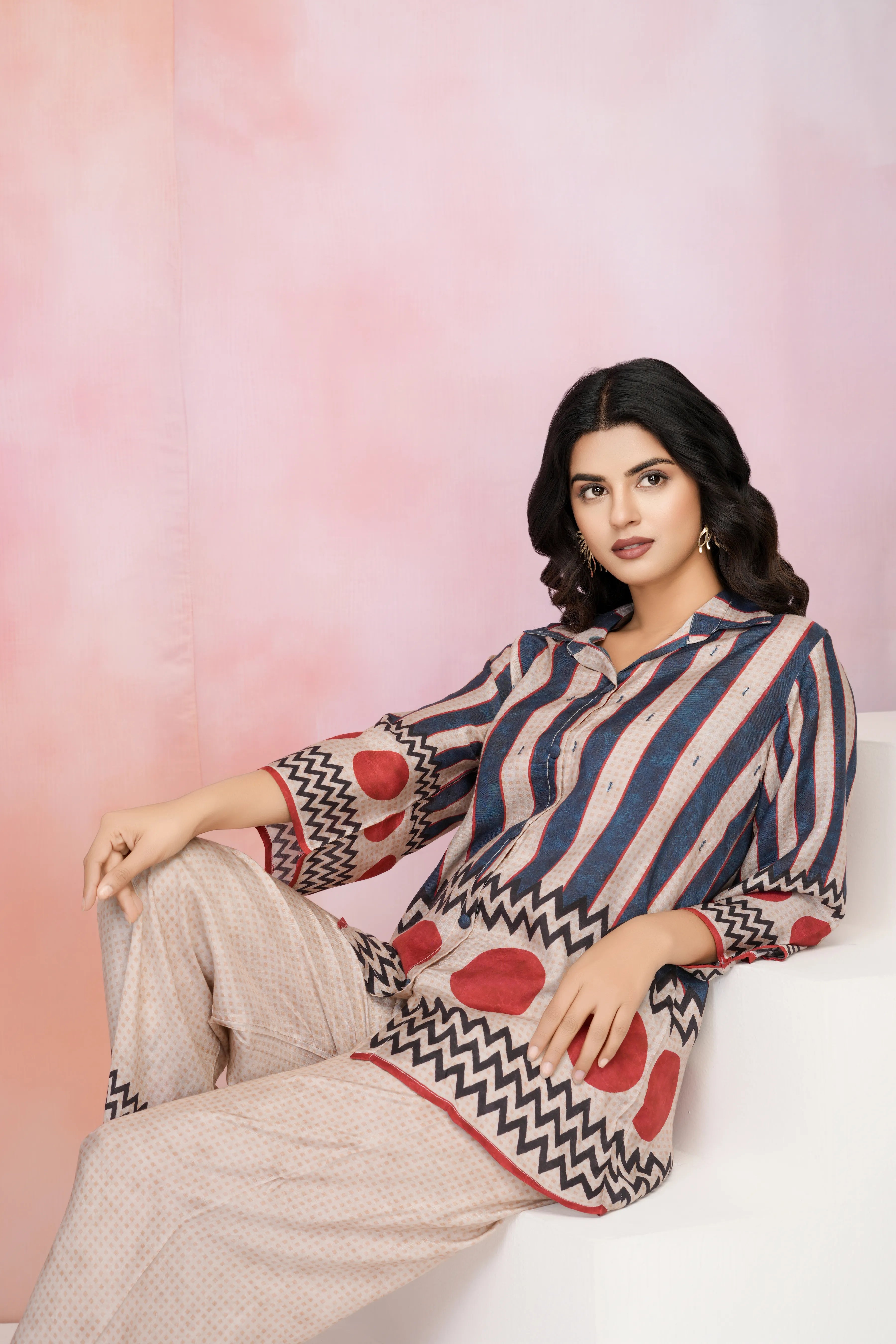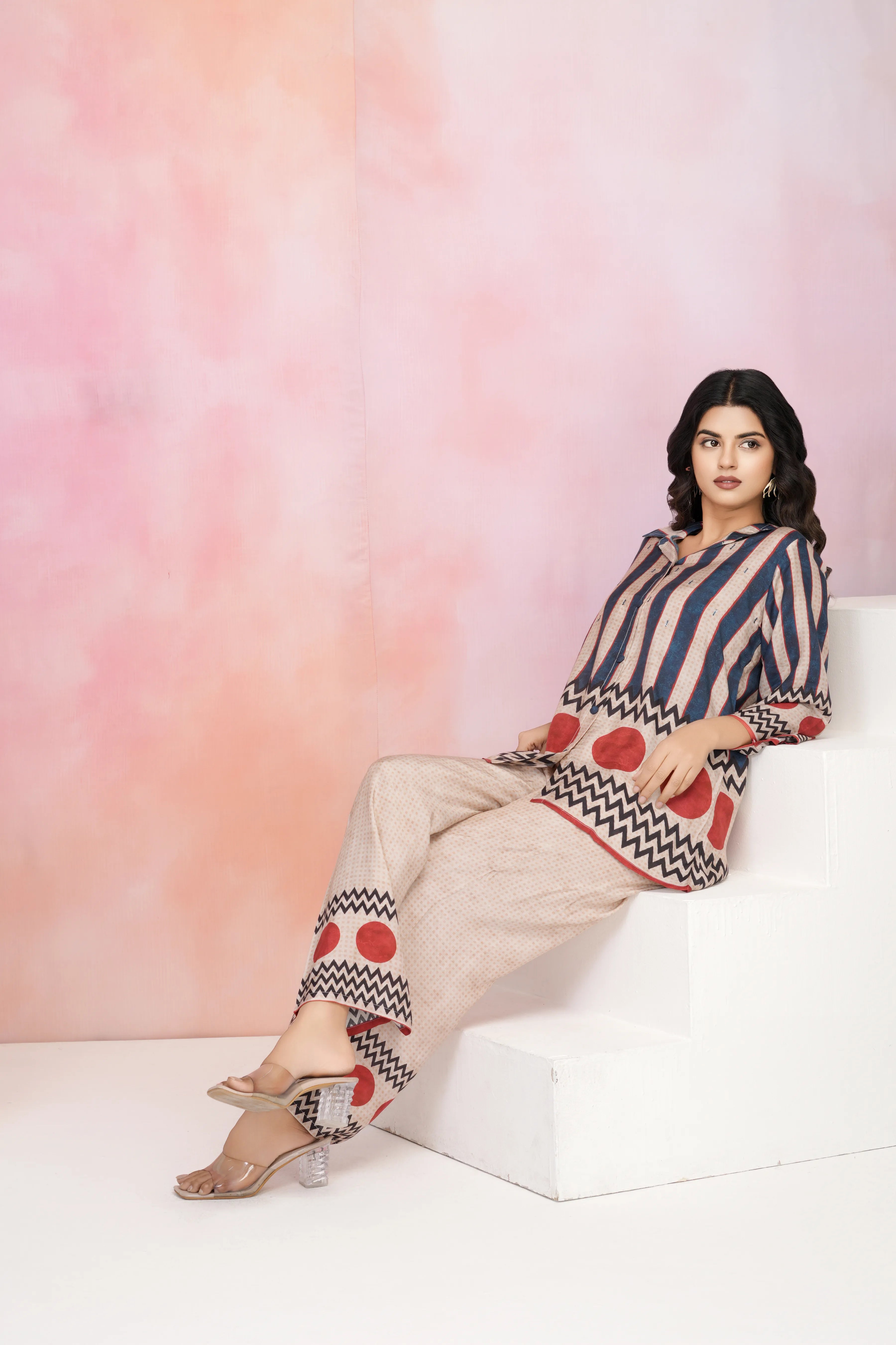 Embrace a fusion of bold prints, shimmering details, and effortless elegance with this standout muslin co-ord set—where fun meets sophistication!