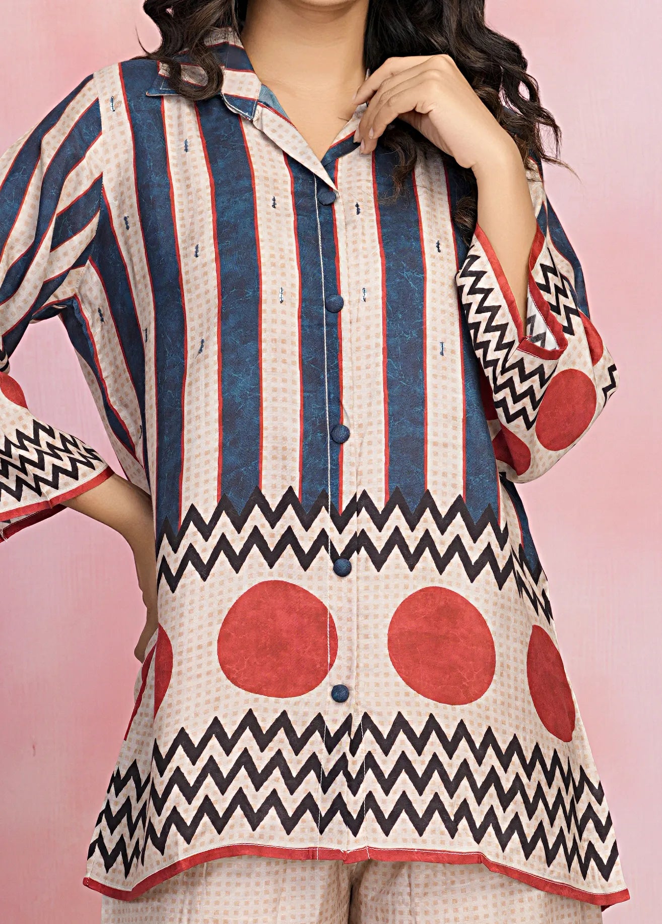 - Top: Multicolor Striped & Polka Dot Print, Shirt Collar, Sequin Detailing, Fabric-Covered Button Front, 3/4th Sleeves