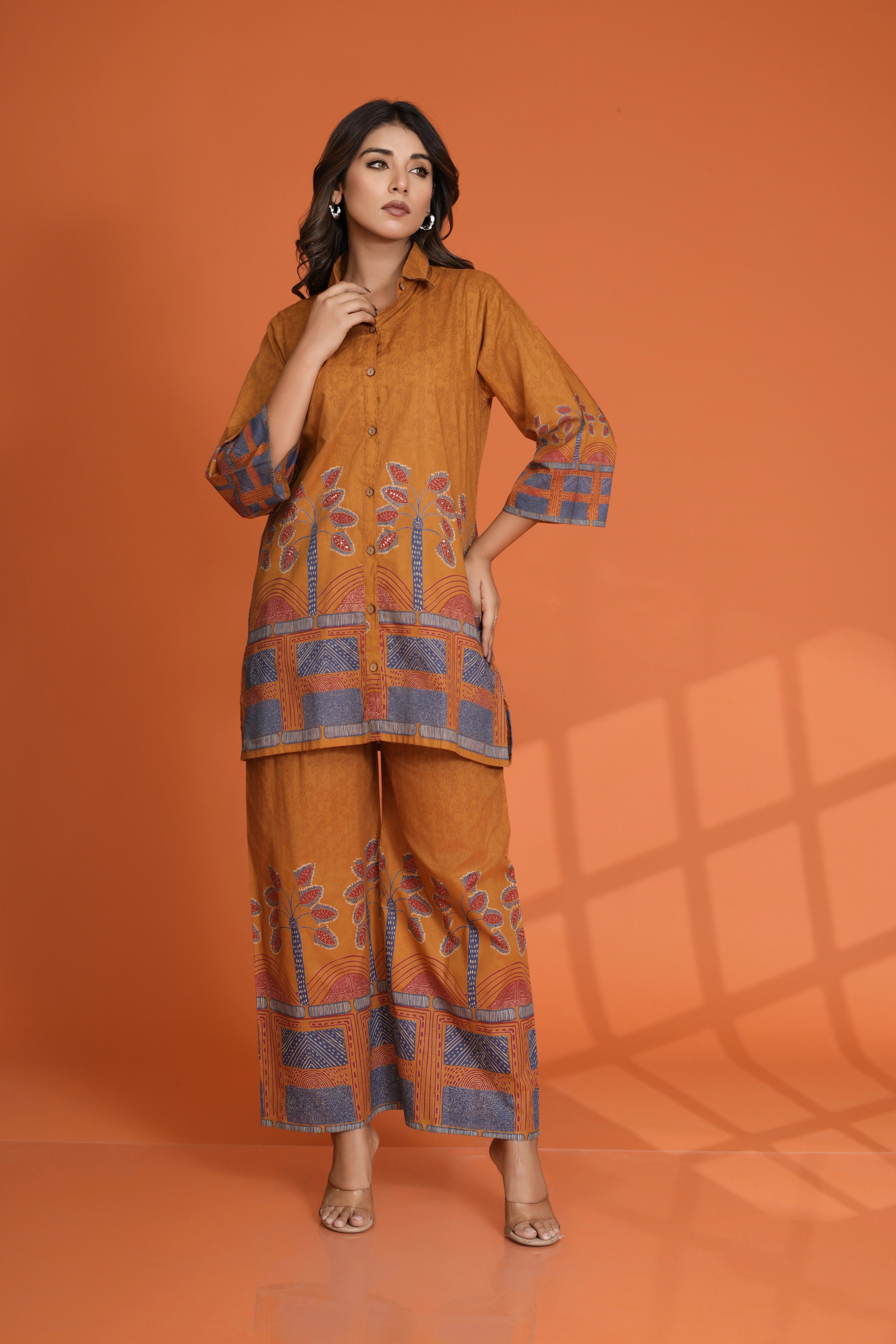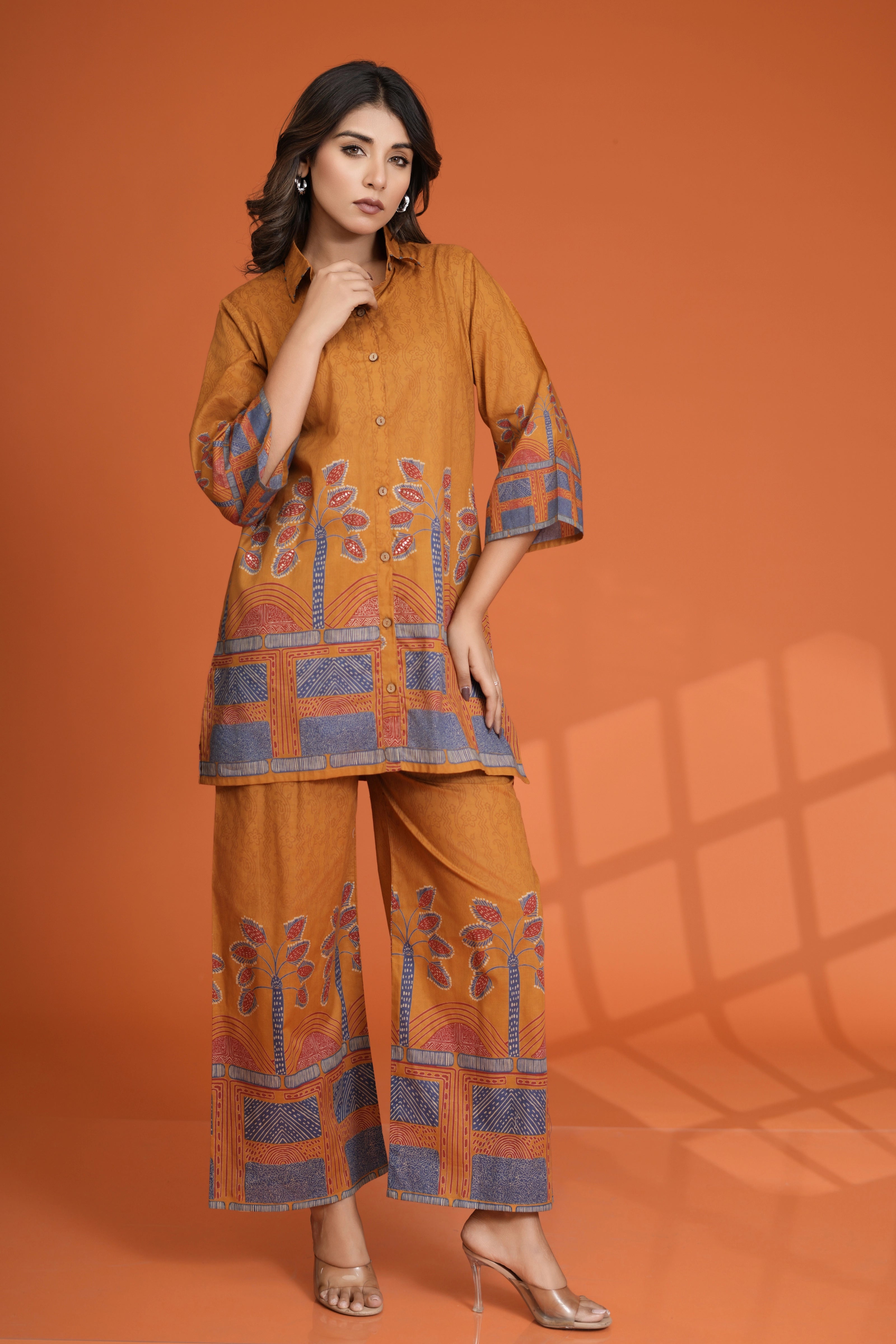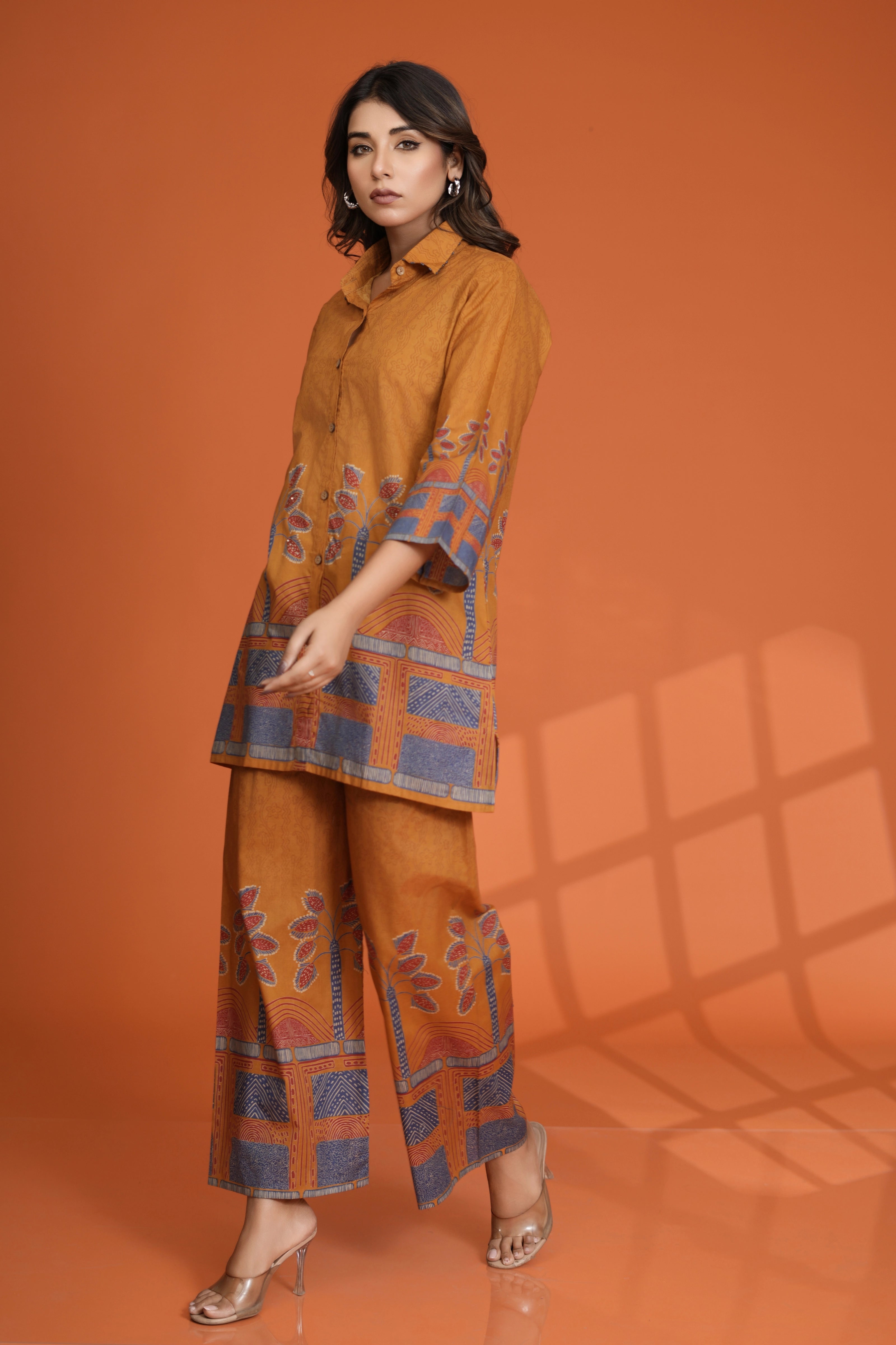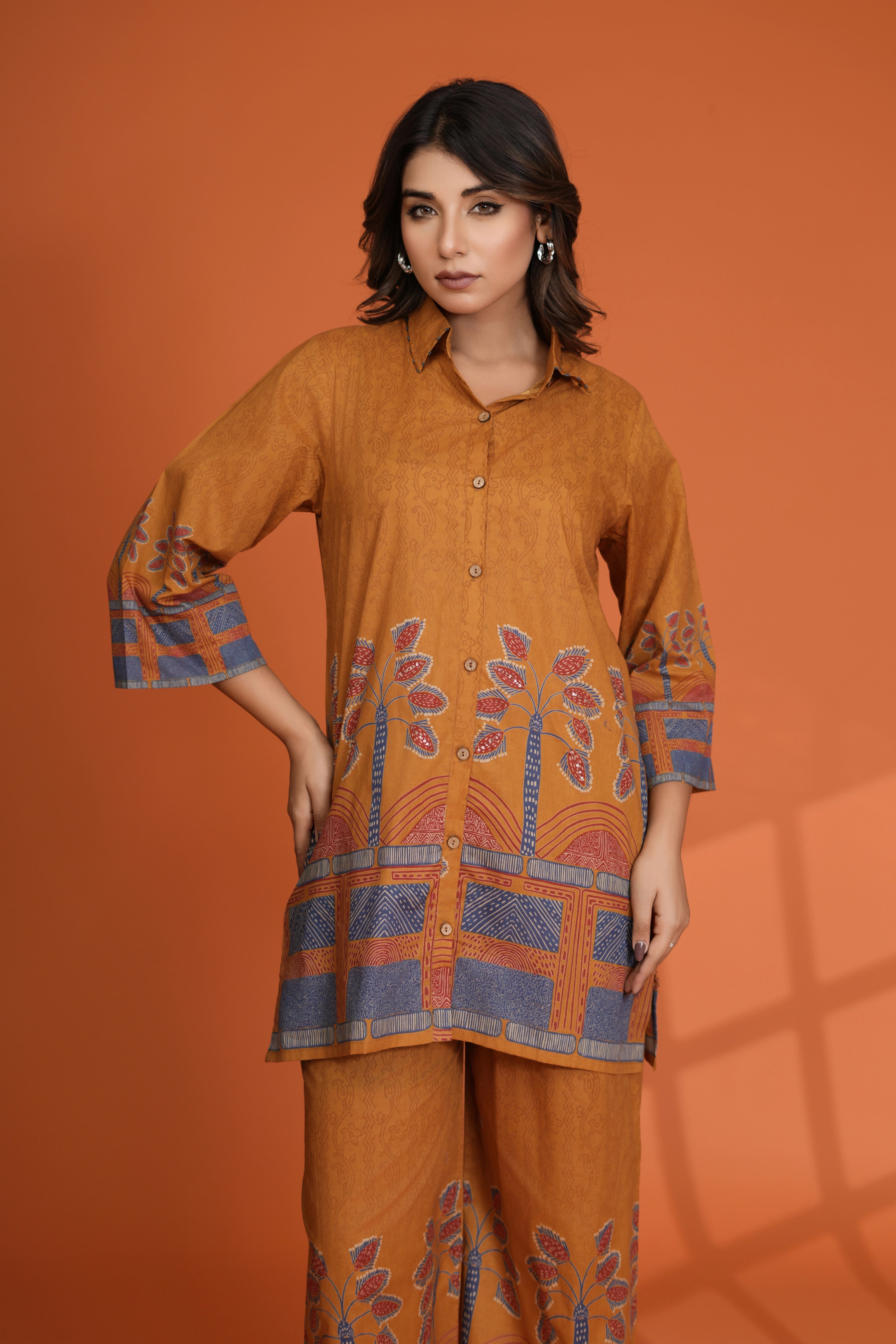 Infuse elegance into your wardrobe with this Mustard Border Printed Co-Ord Set, a perfect blend of style and comfort. Made from breathable cotton cambric, this set features a shirt collar top with intricate beadwork and a wooden button front closure. Paired with wide-leg pants, this ensemble offers a sophisticated yet relaxed look for any occasion.