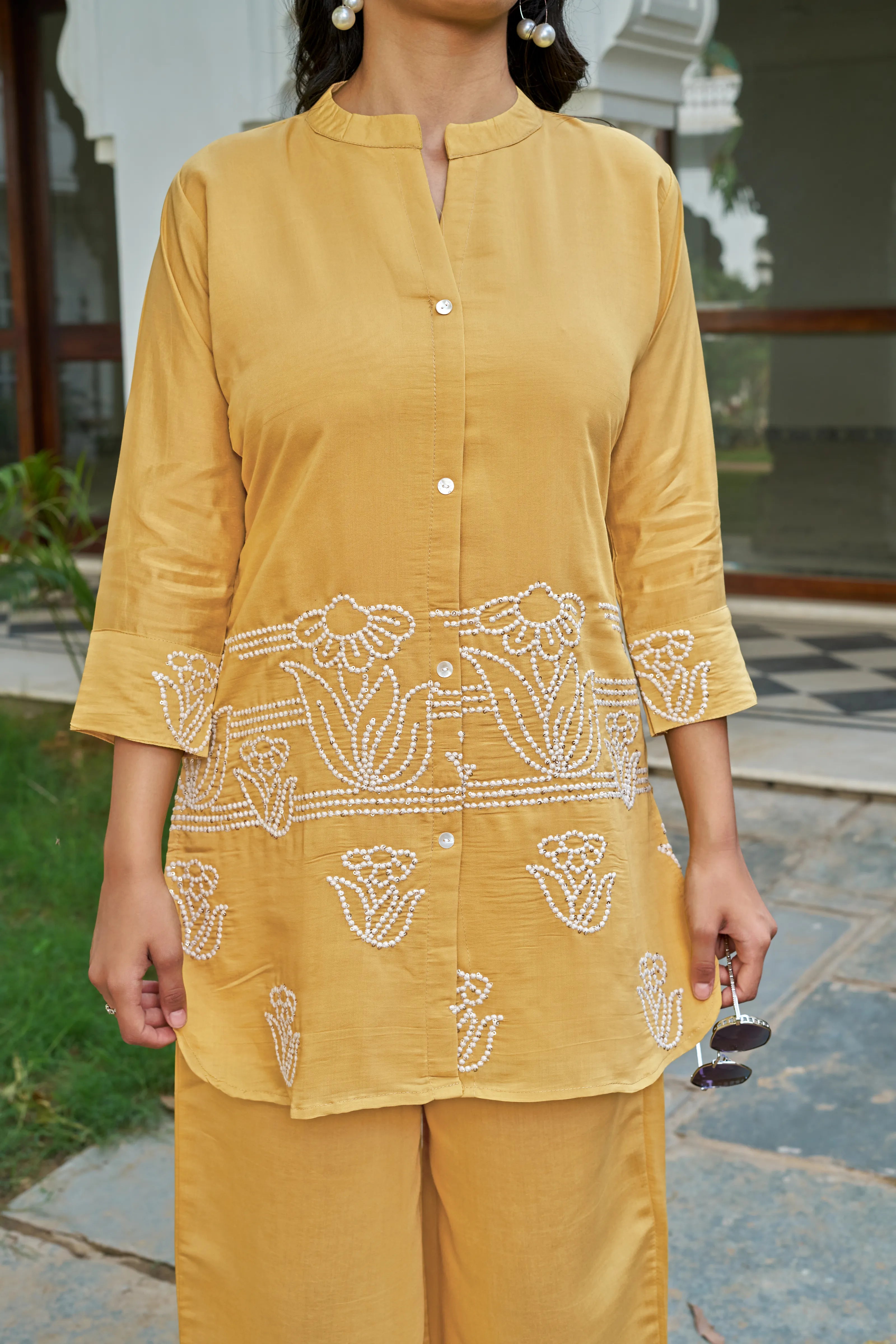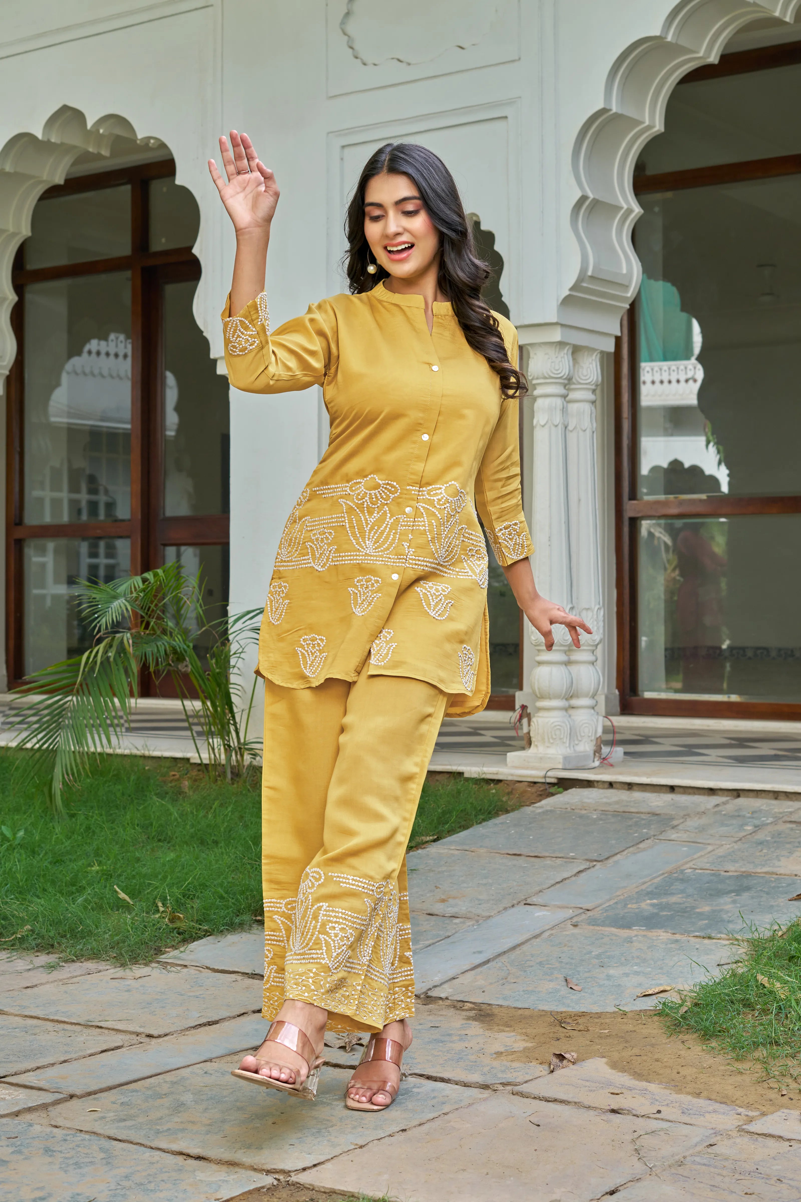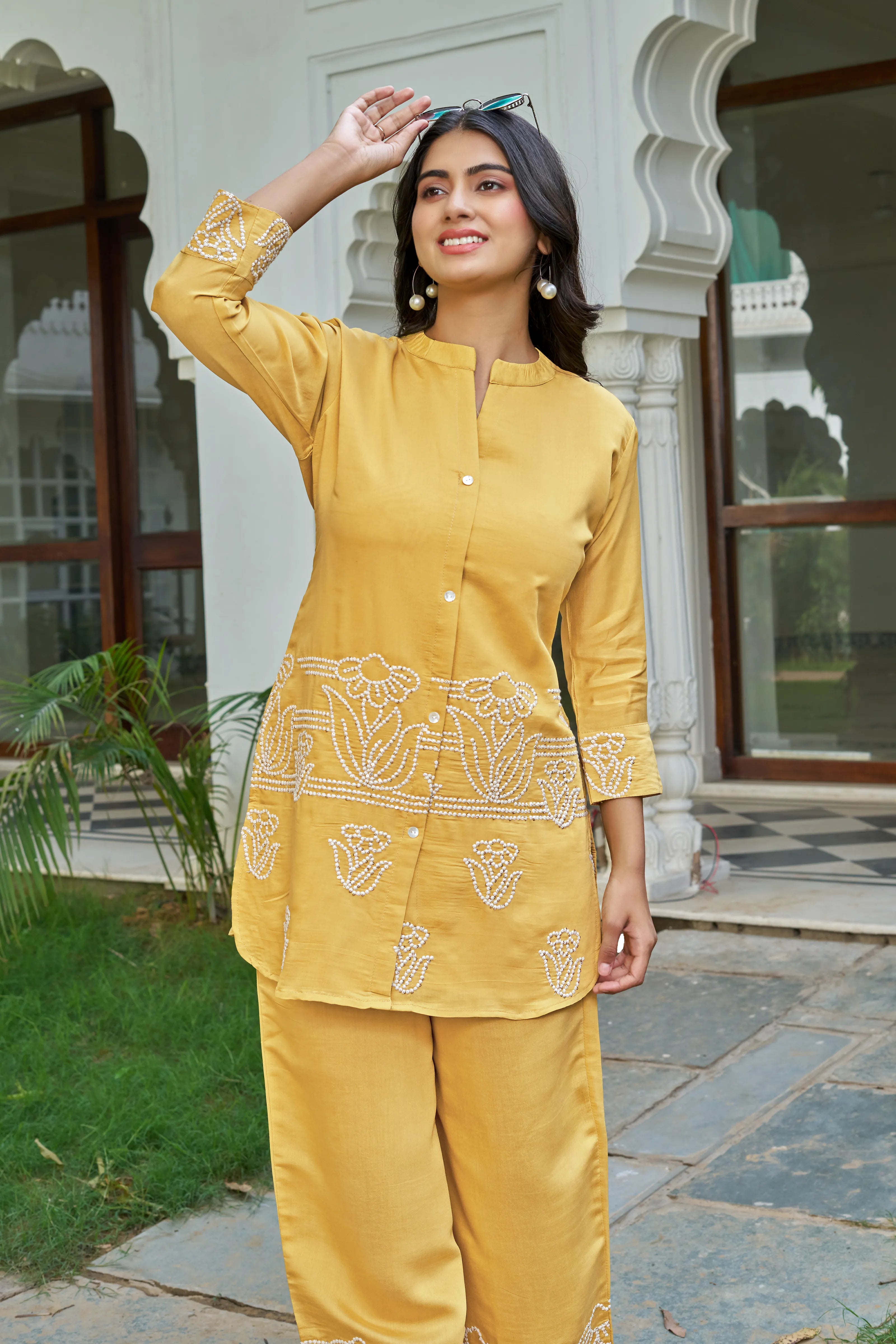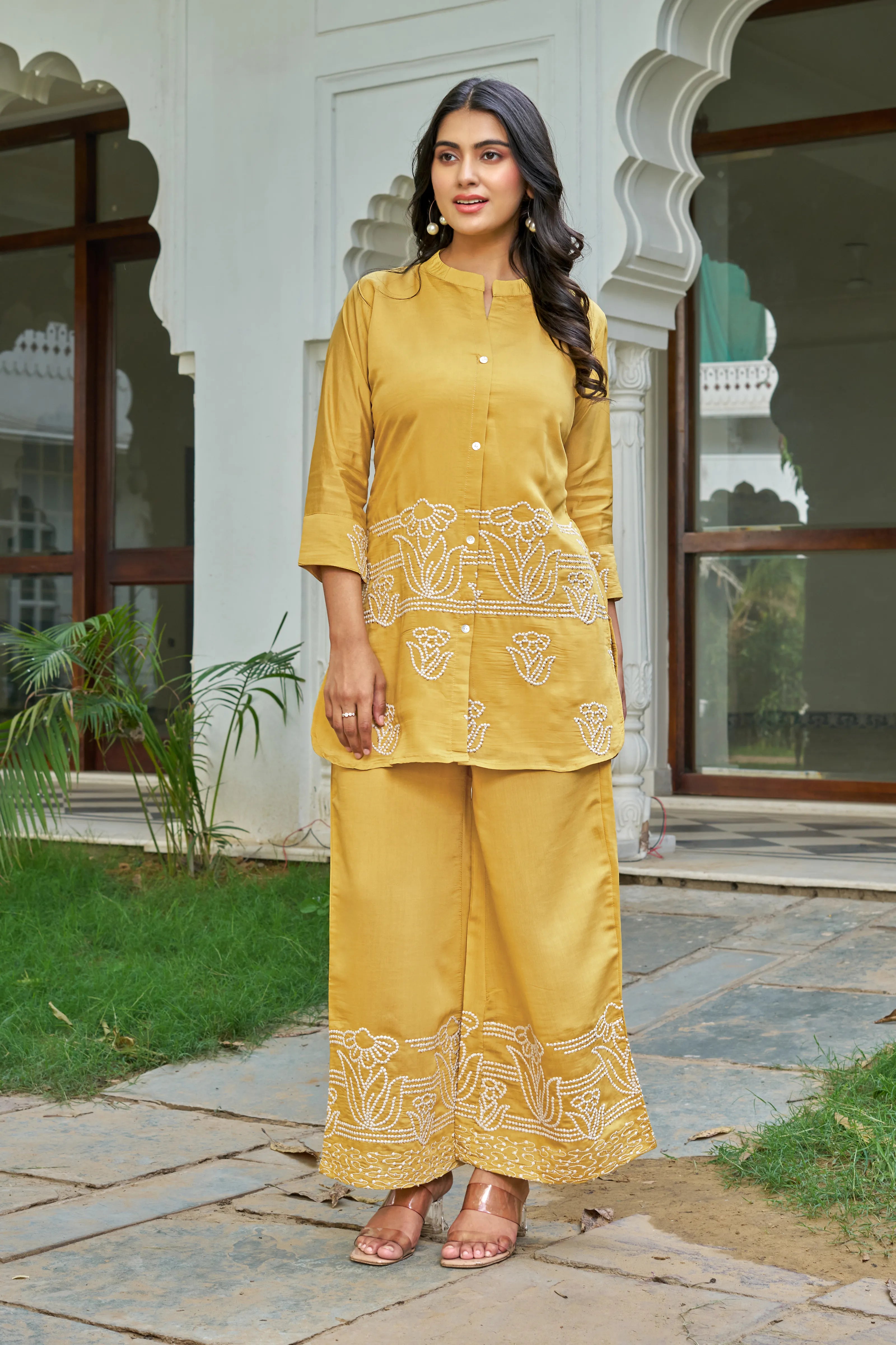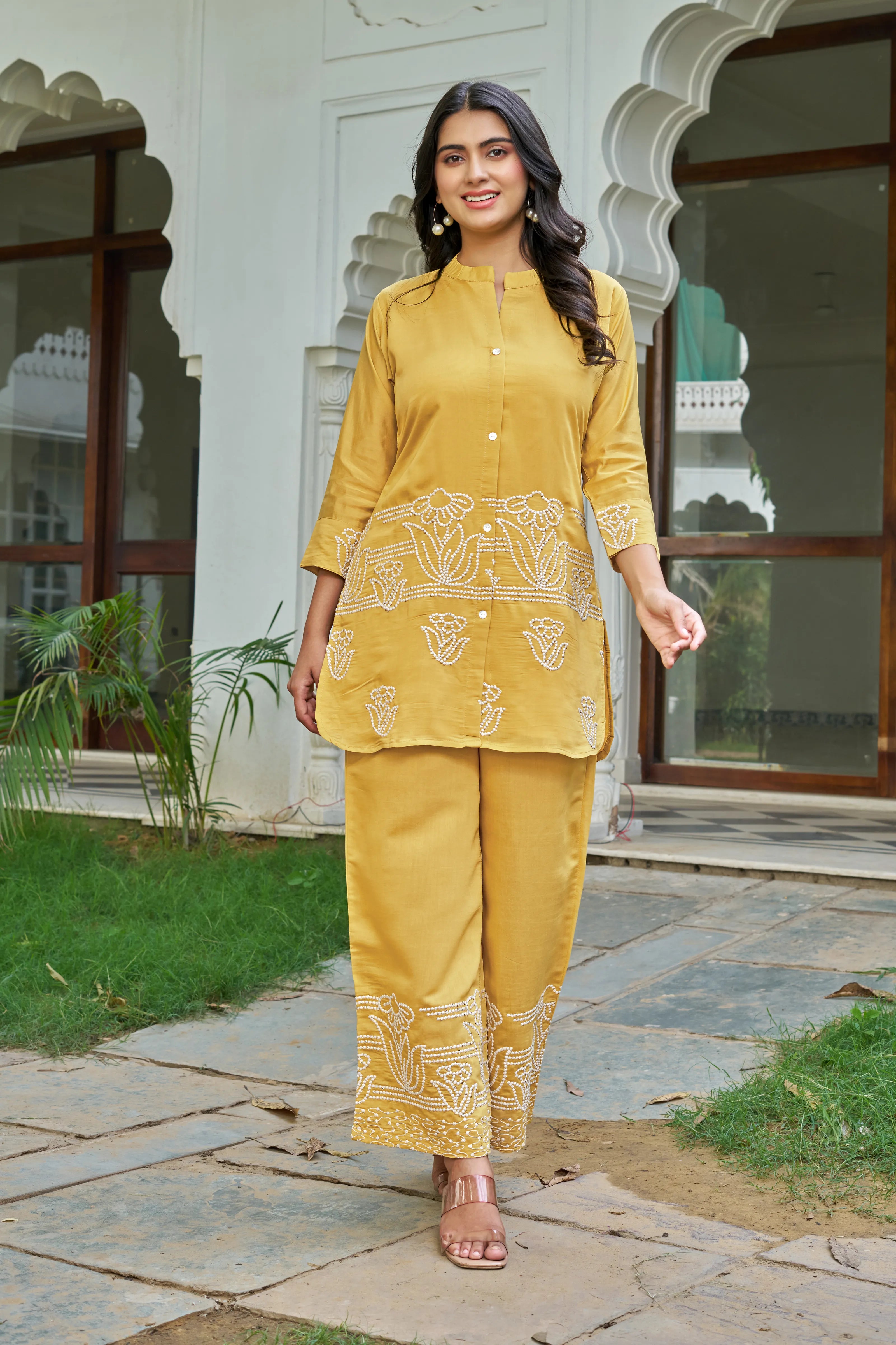 Golden Garden: Mustard Floral Embroidered Silk Co-ord Set