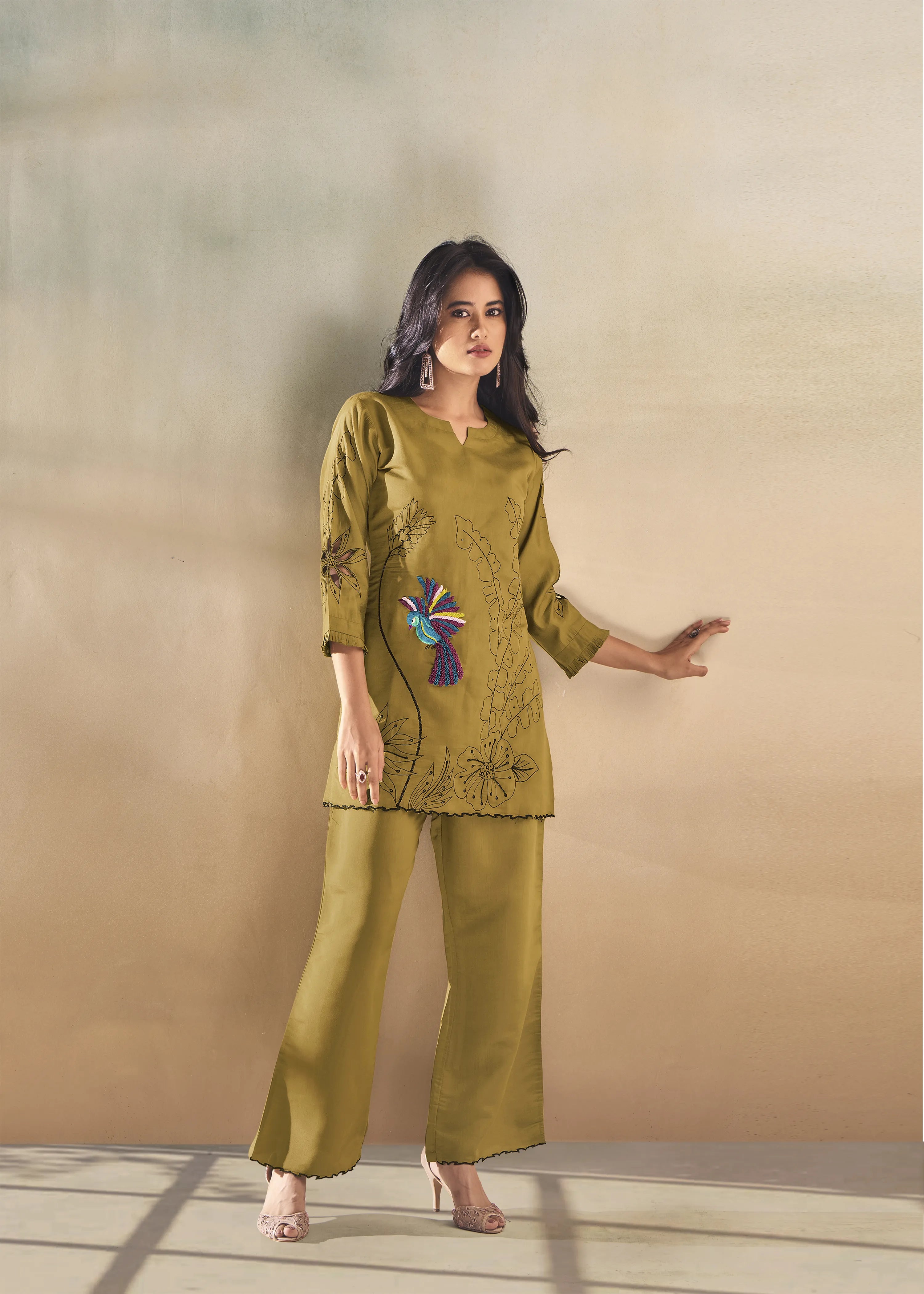 The tunic features a solid mustard green base, 3/4th relaxed sleeves, and a flowing silhouette, ensuring both elegance and ease. Paired with straight-fit trousers, this co-ord set provides a relaxed yet polished look—perfect for daytime outings and semi-formal gatherings.