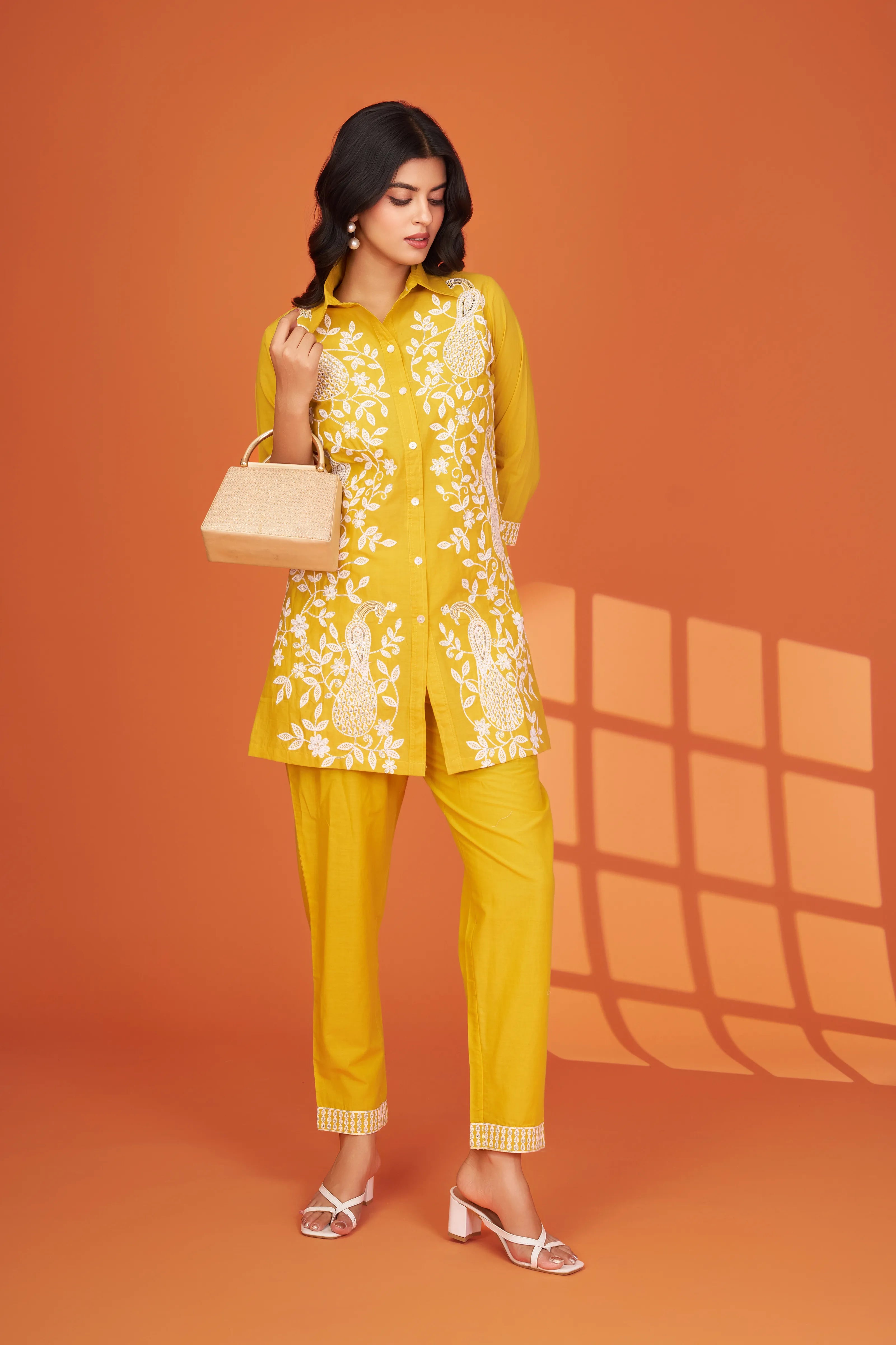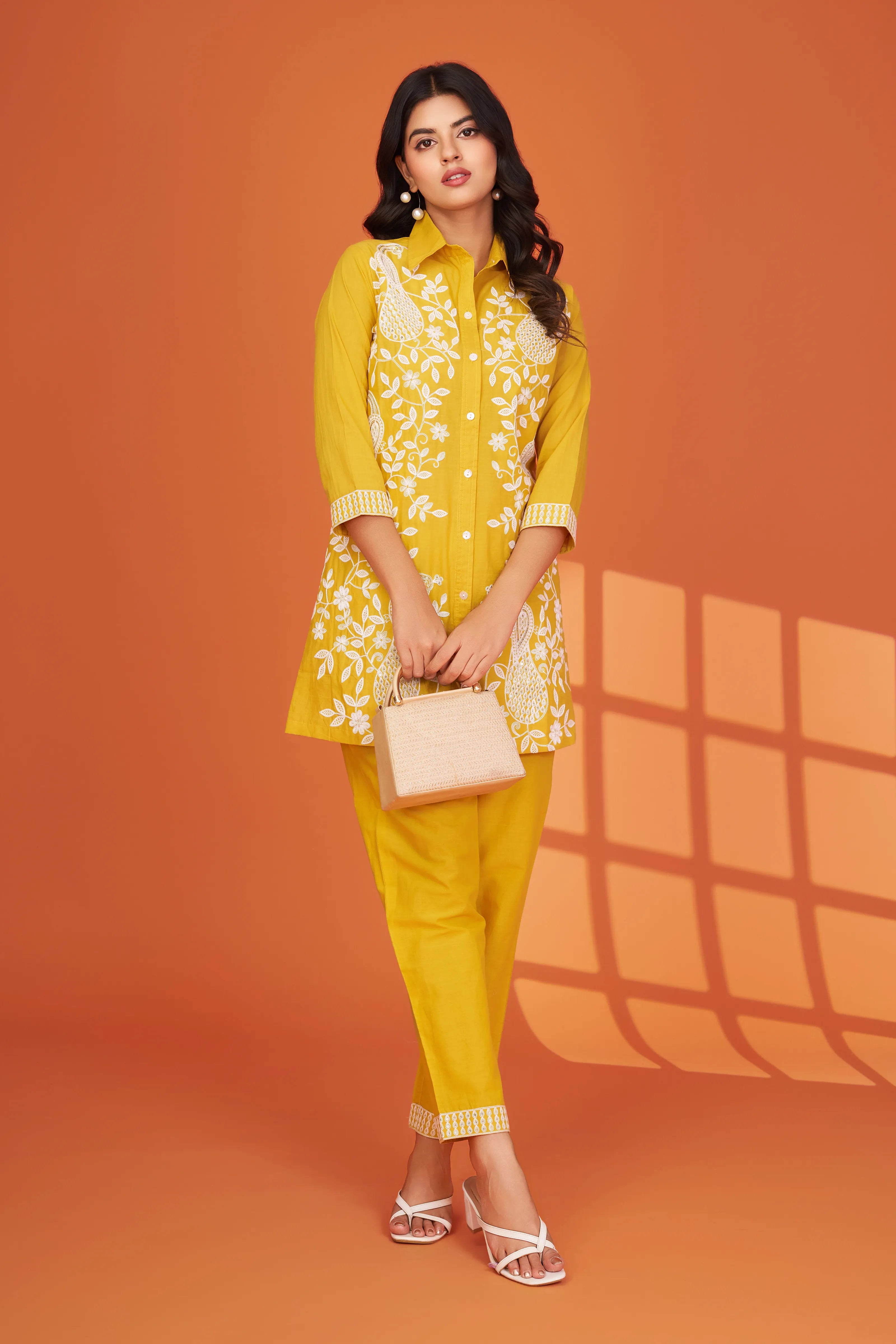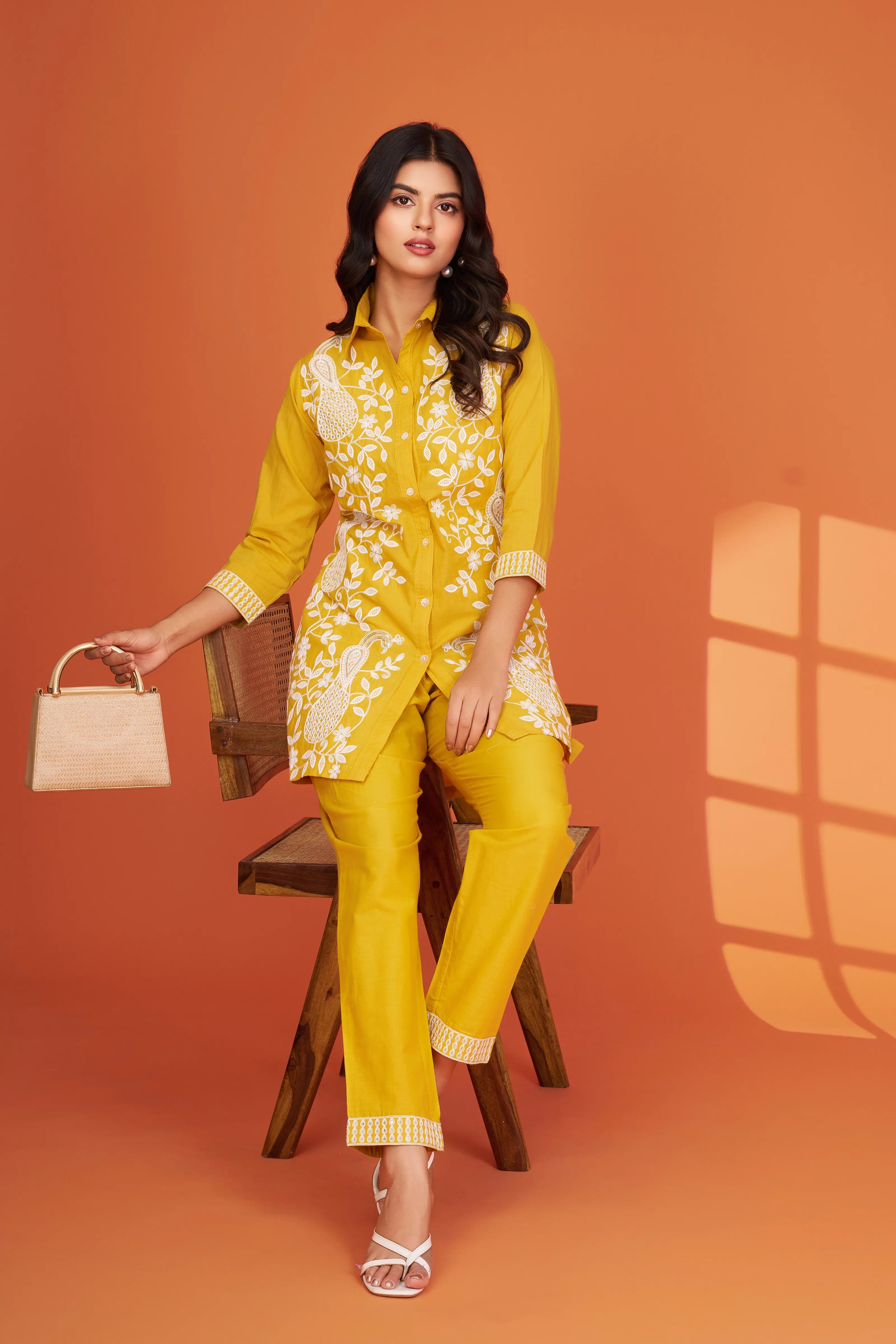 Mustard Yellow Embroidered Co-ord Set in Cotton
