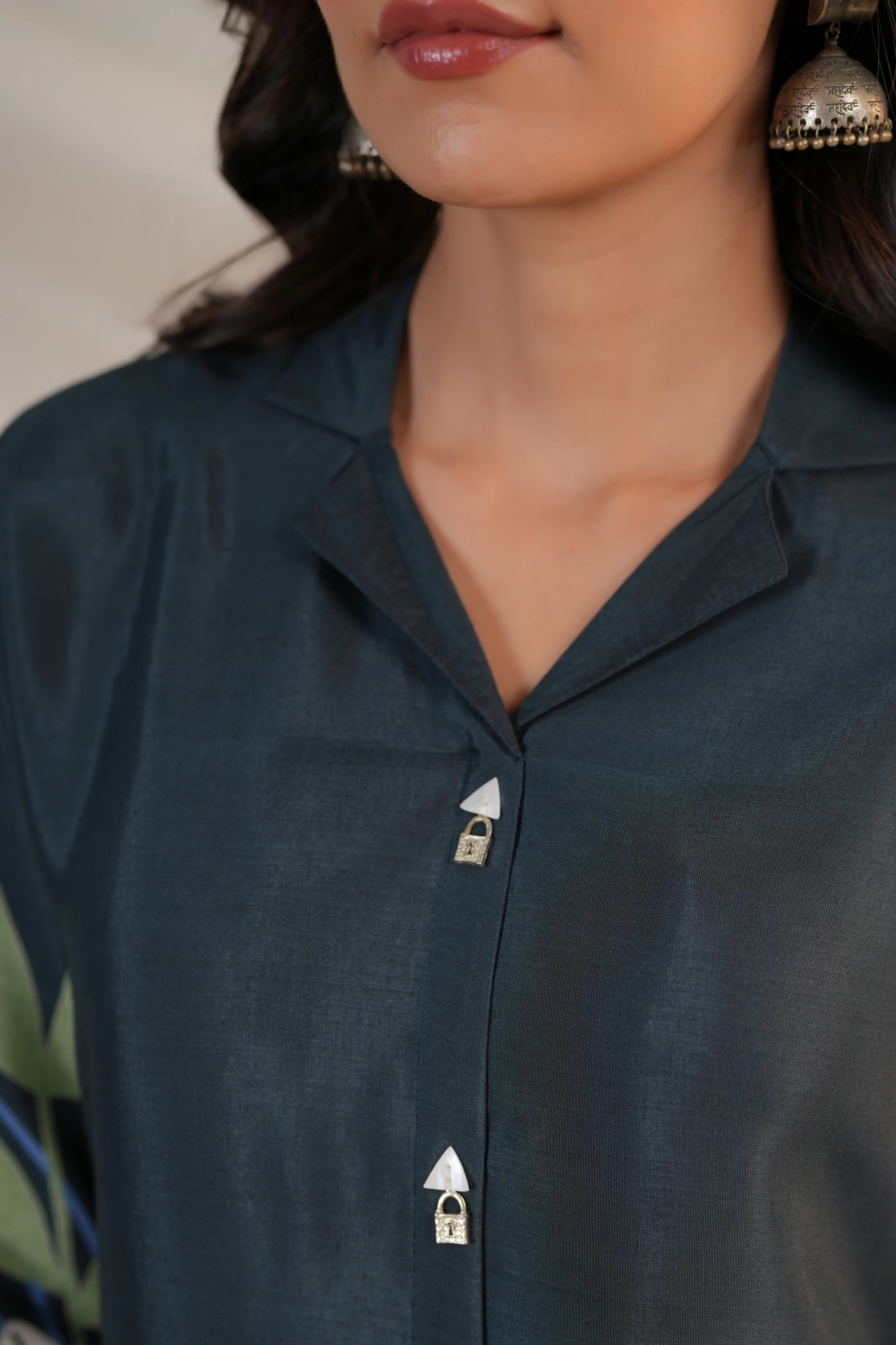 Make a striking statement with this navy blue co-ord set featuring a vibrant bold floral print and a unique triangle-shaped shell button front. Crafted in rich Russian silk, the set includes a relaxed top with 3/4th sleeves and matching wide-leg pants for a flowy, coordinated silhouette.