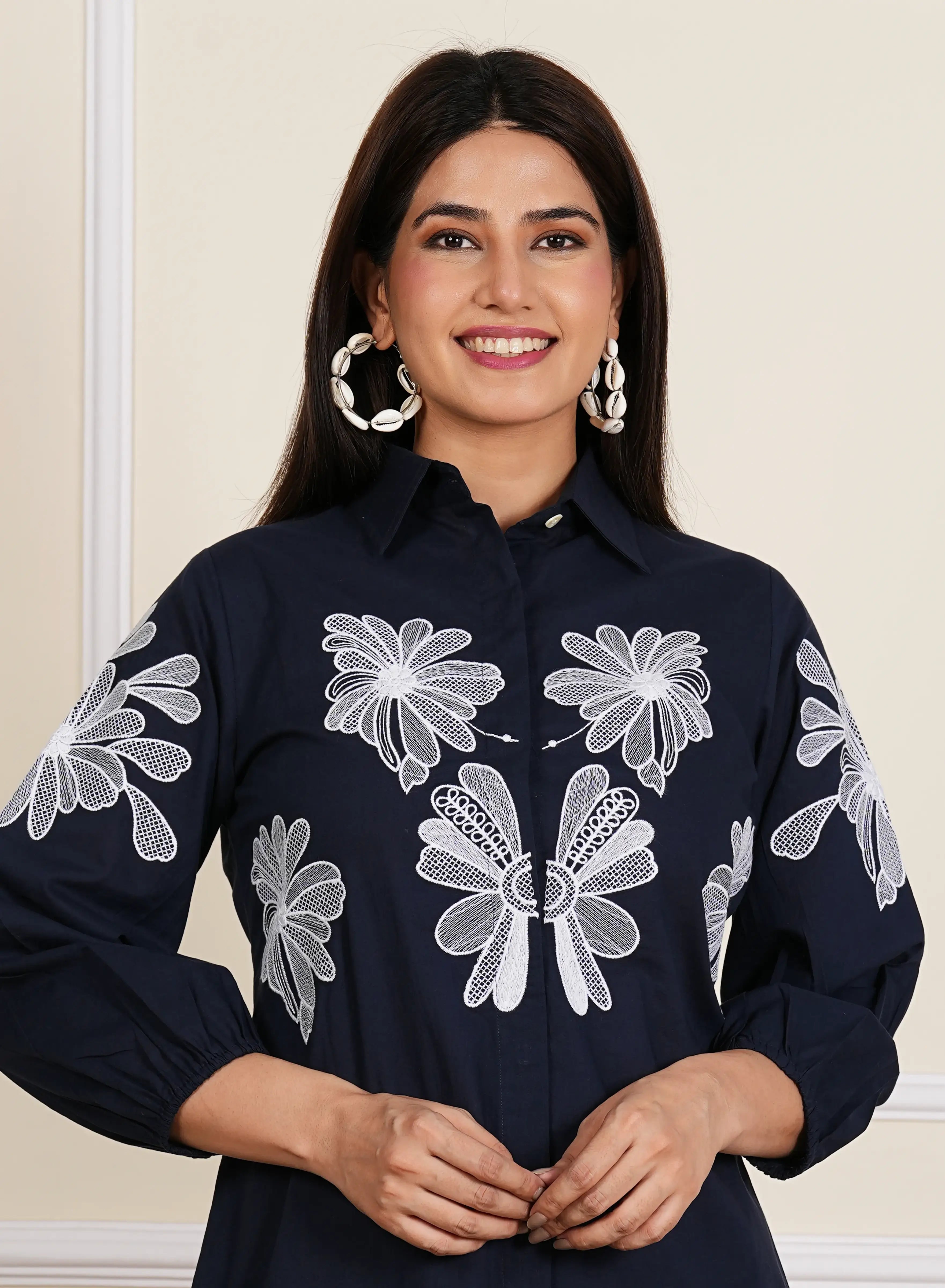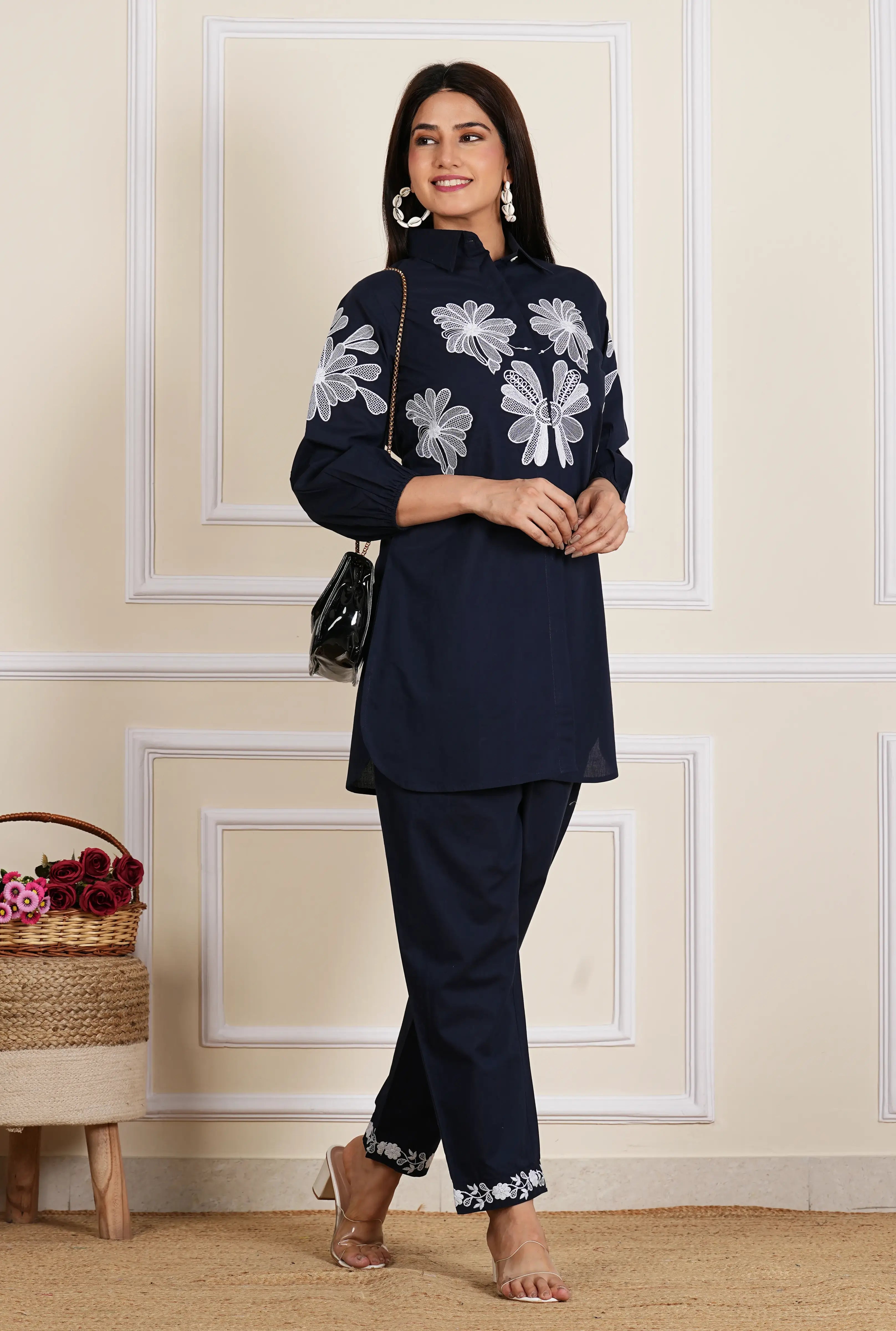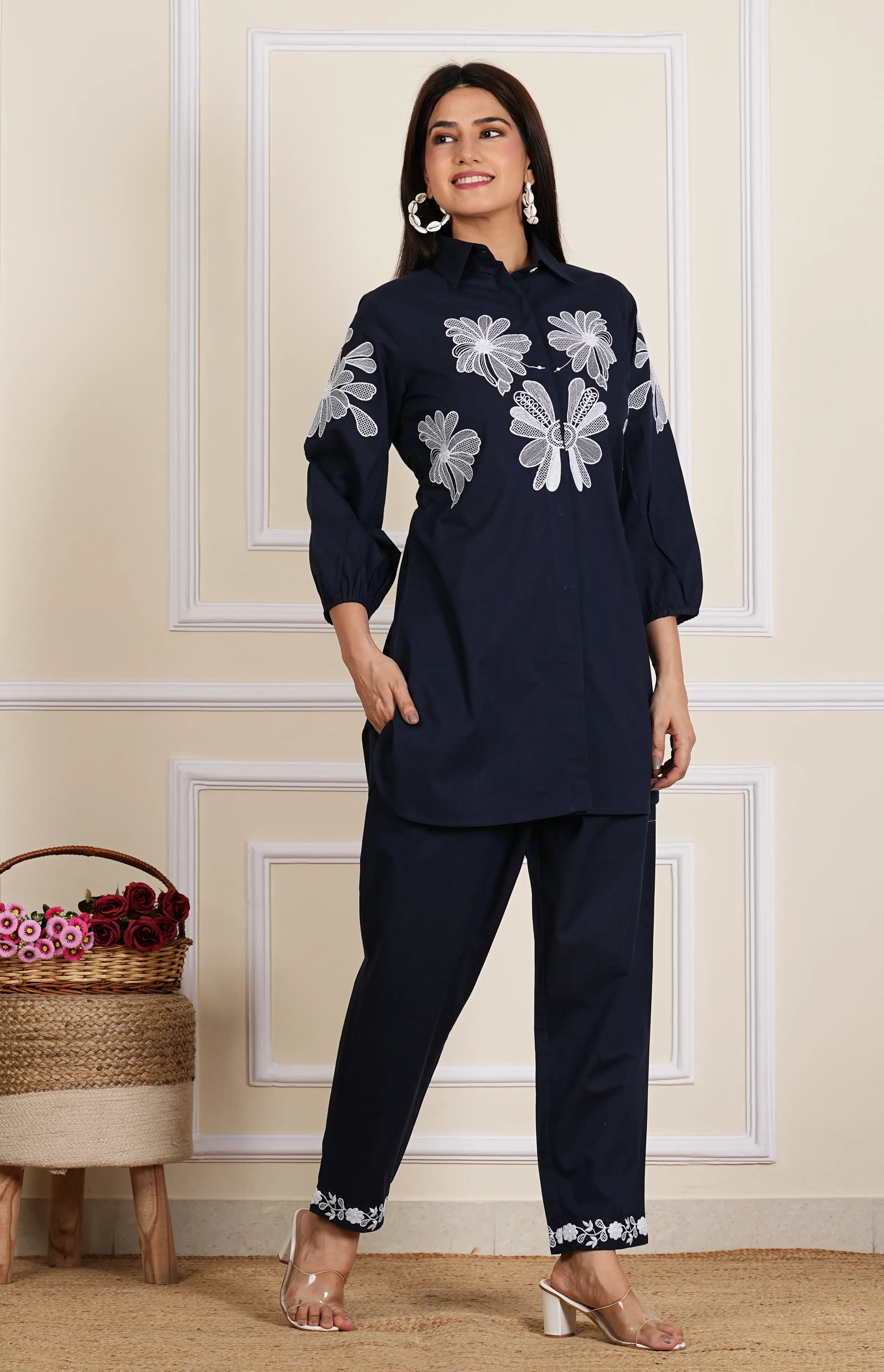 Step into effortless style with this Navy Blue Bold Placement Print Co-Ord Set. Crafted from breathable cotton, this set features a striking bold flower motif in a placement print and a concealed placket for a sophisticated touch. The elasticated sleeves add both comfort and flair, making it a versatile choice for casual outings or semi-formal occasions.
