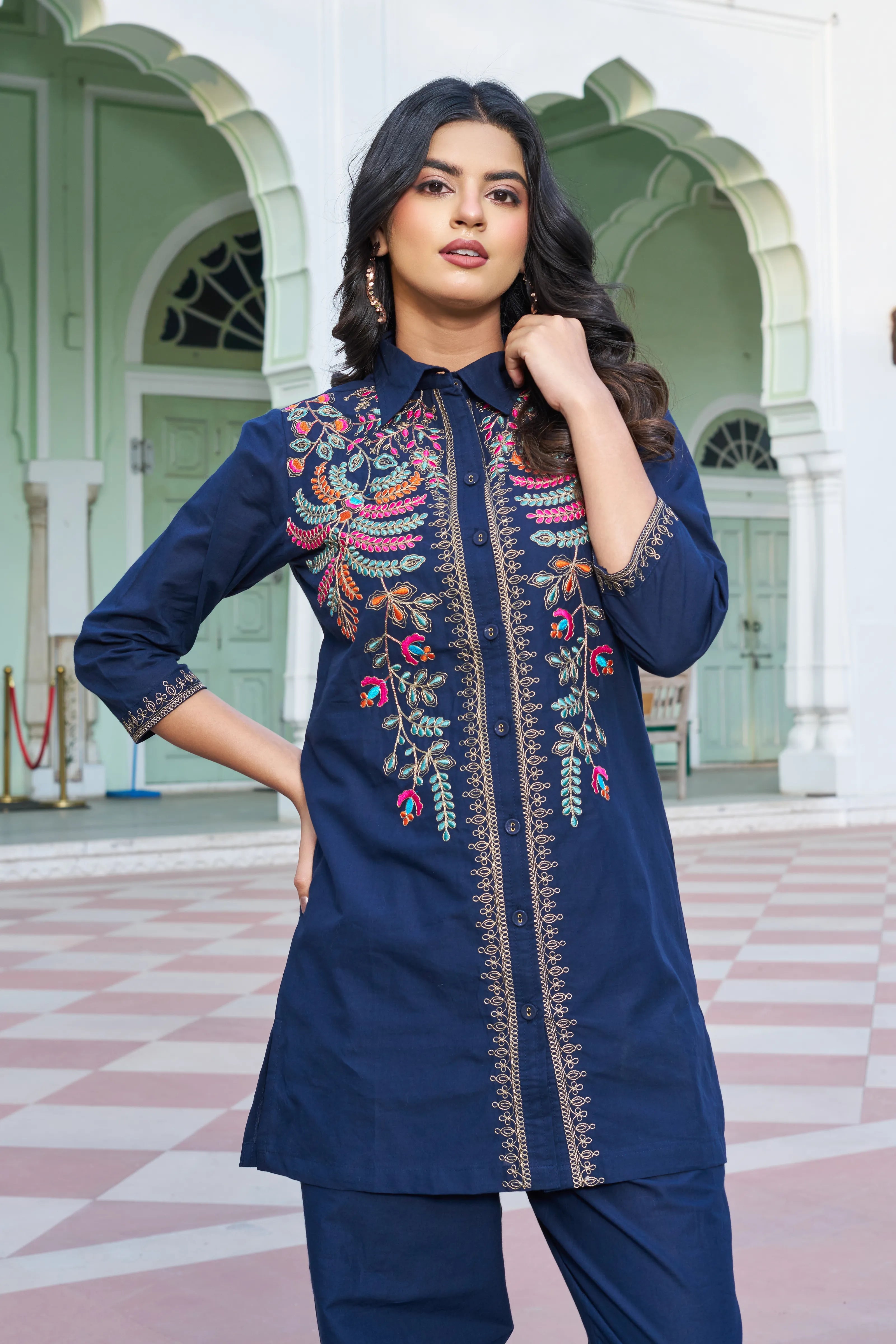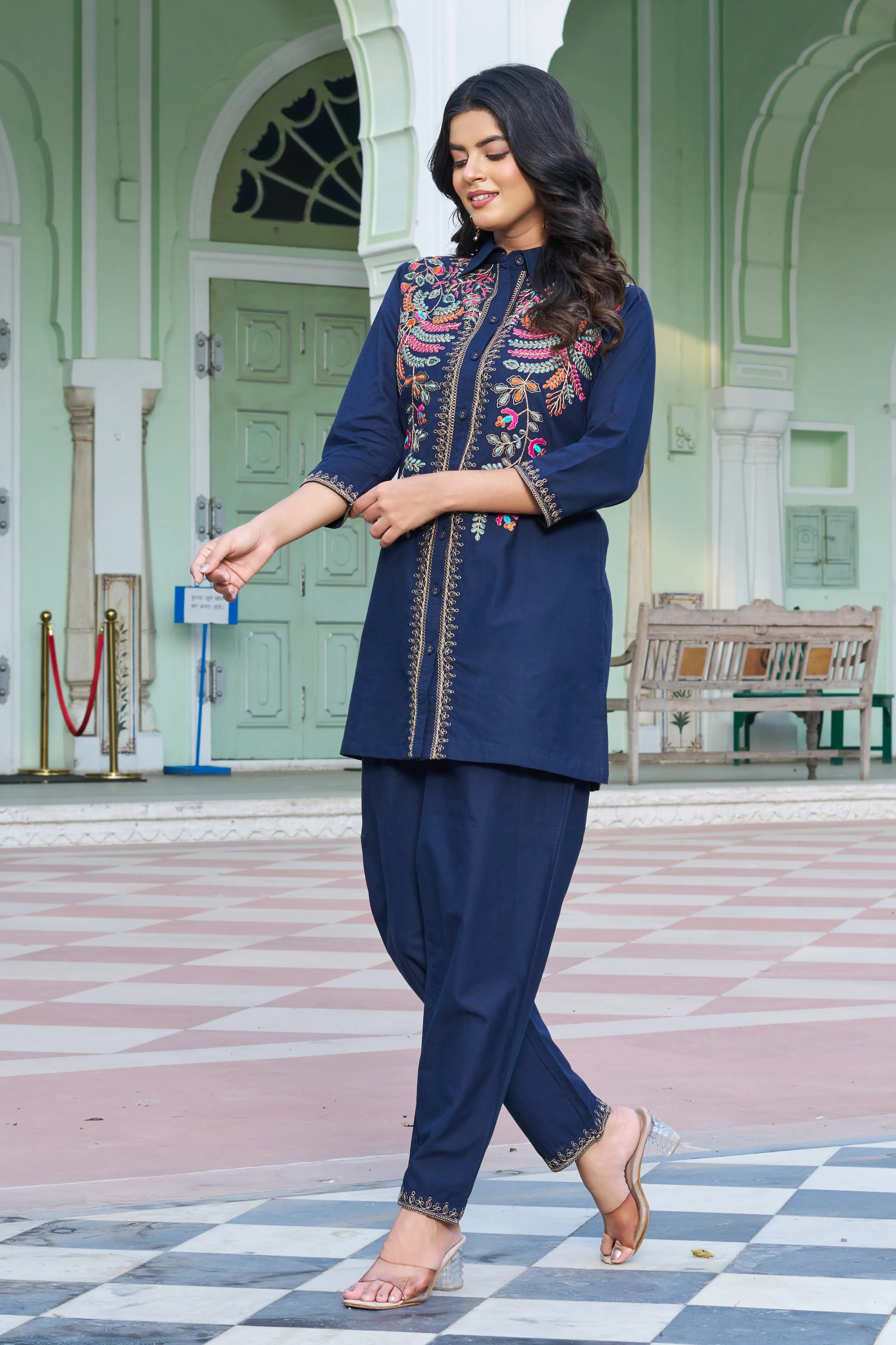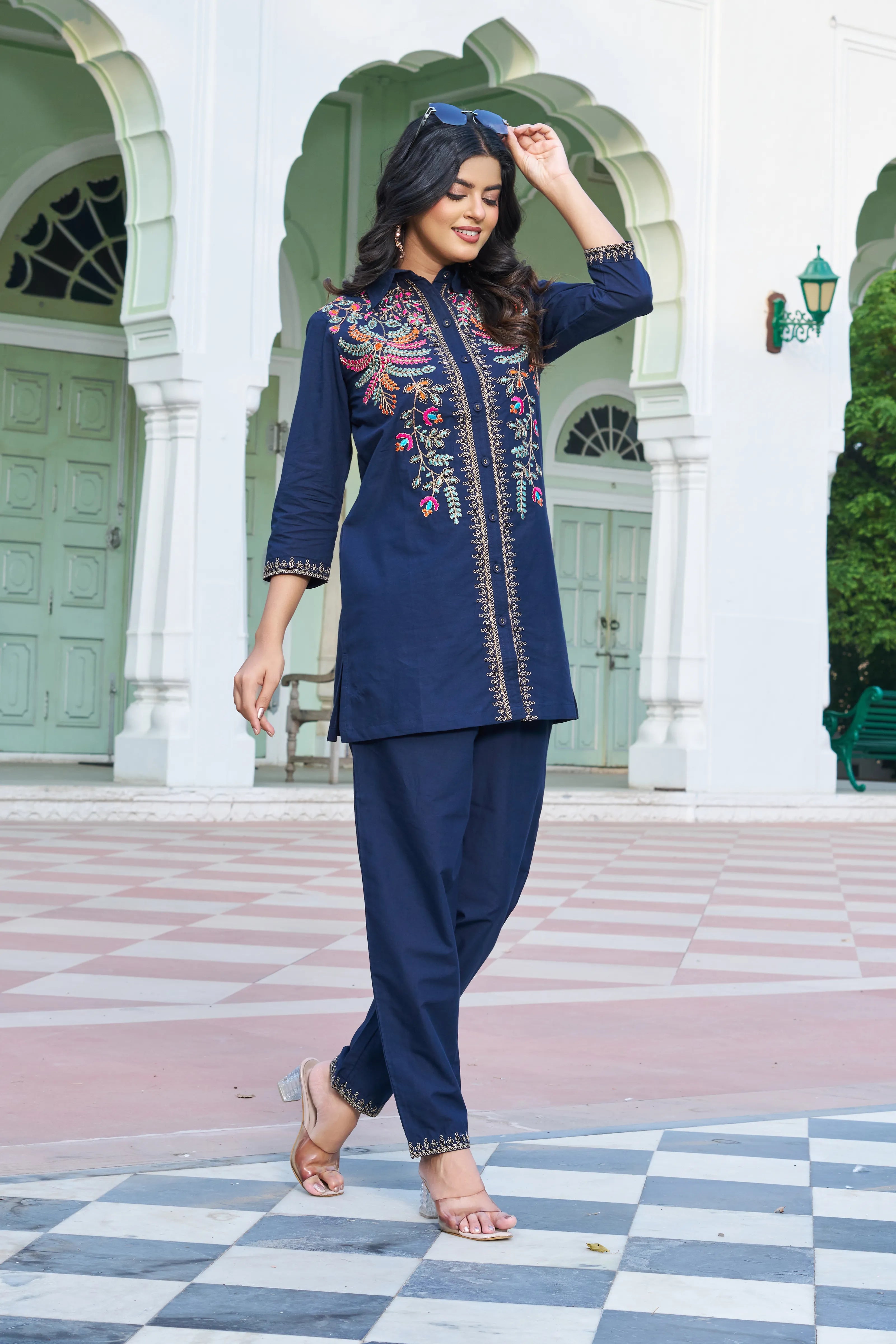 Midnight Garden: Navy Blue Embroidered Rayon Co-ord Set