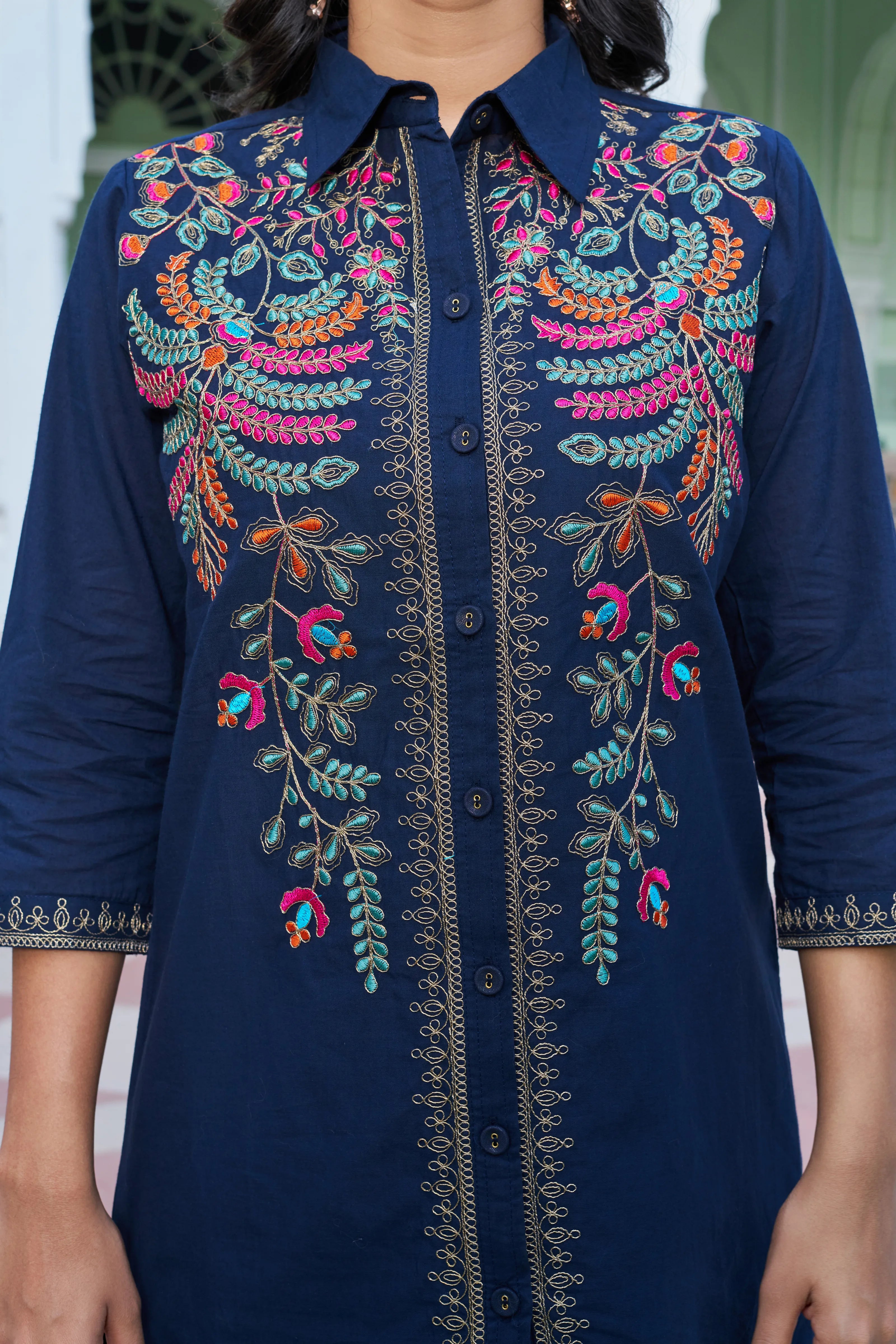 • Color: Deep navy blue with vibrant leaf motif embroidery