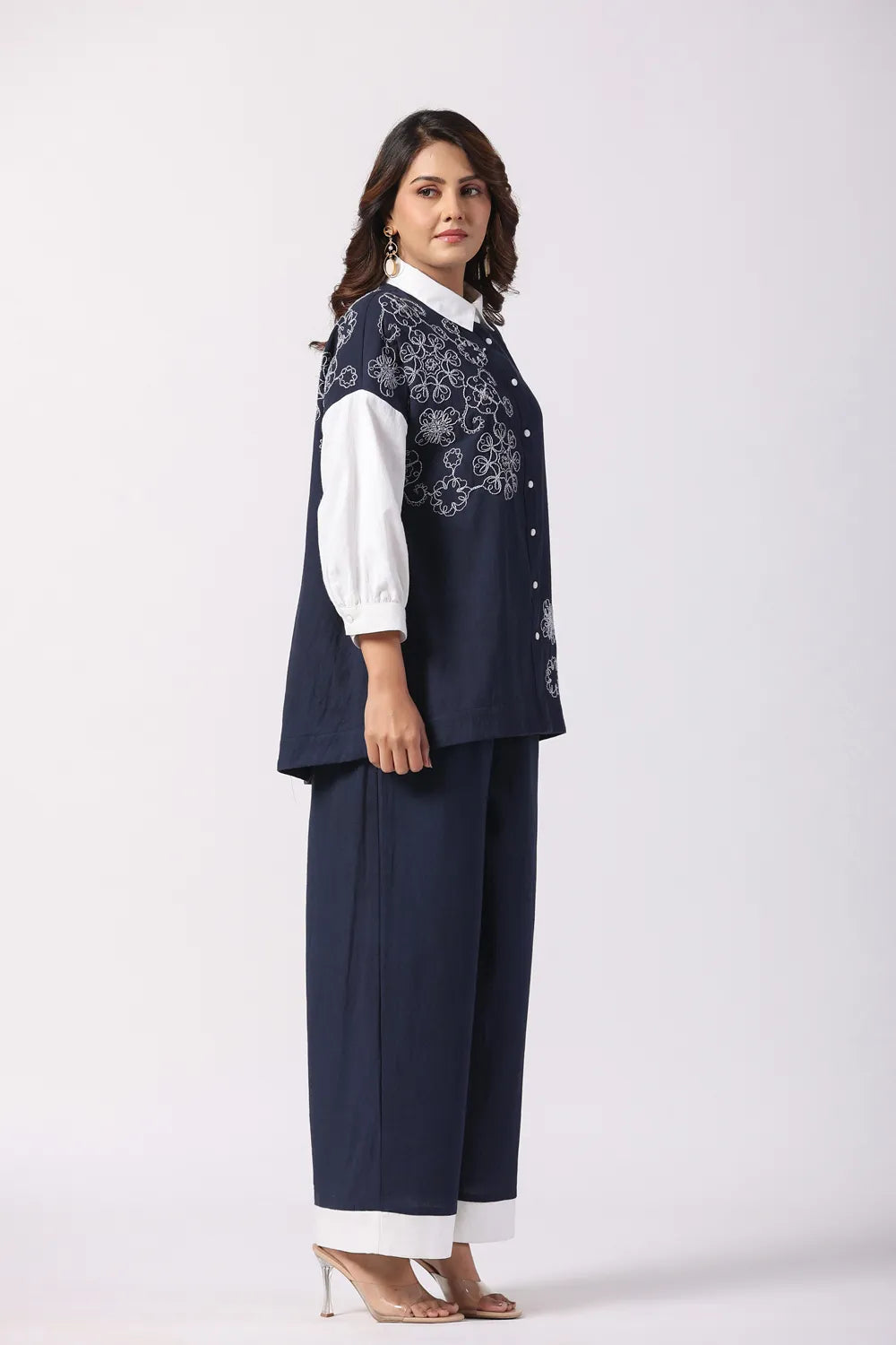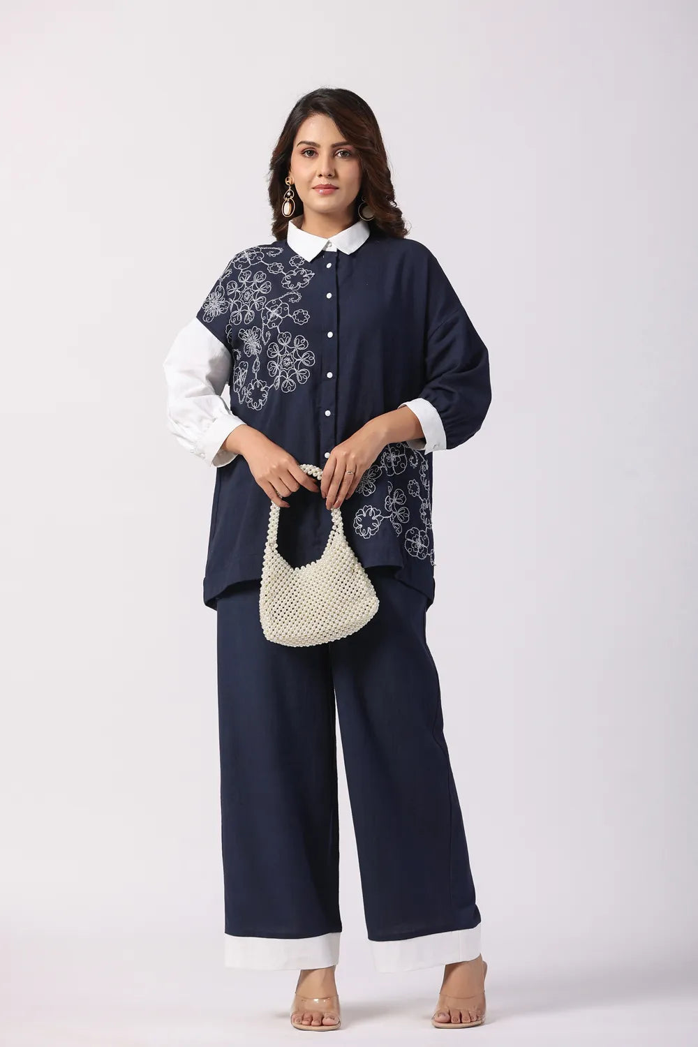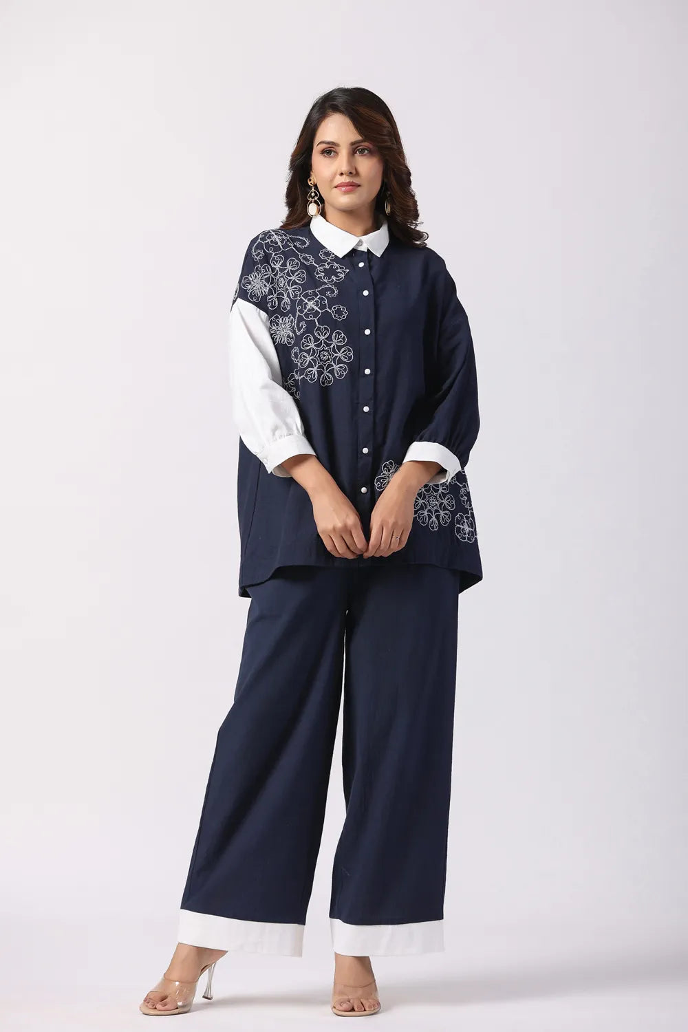 Effortlessly stylish, the Navy Blue & White Embroidered Cotton Co-Ord Set combines modern elegance with breathable comfort. Crafted from premium cotton fabric, this set features a cord-embroidered shirt and coordinated relaxed-fit trousers, making it a perfect blend of sophistication and ease.