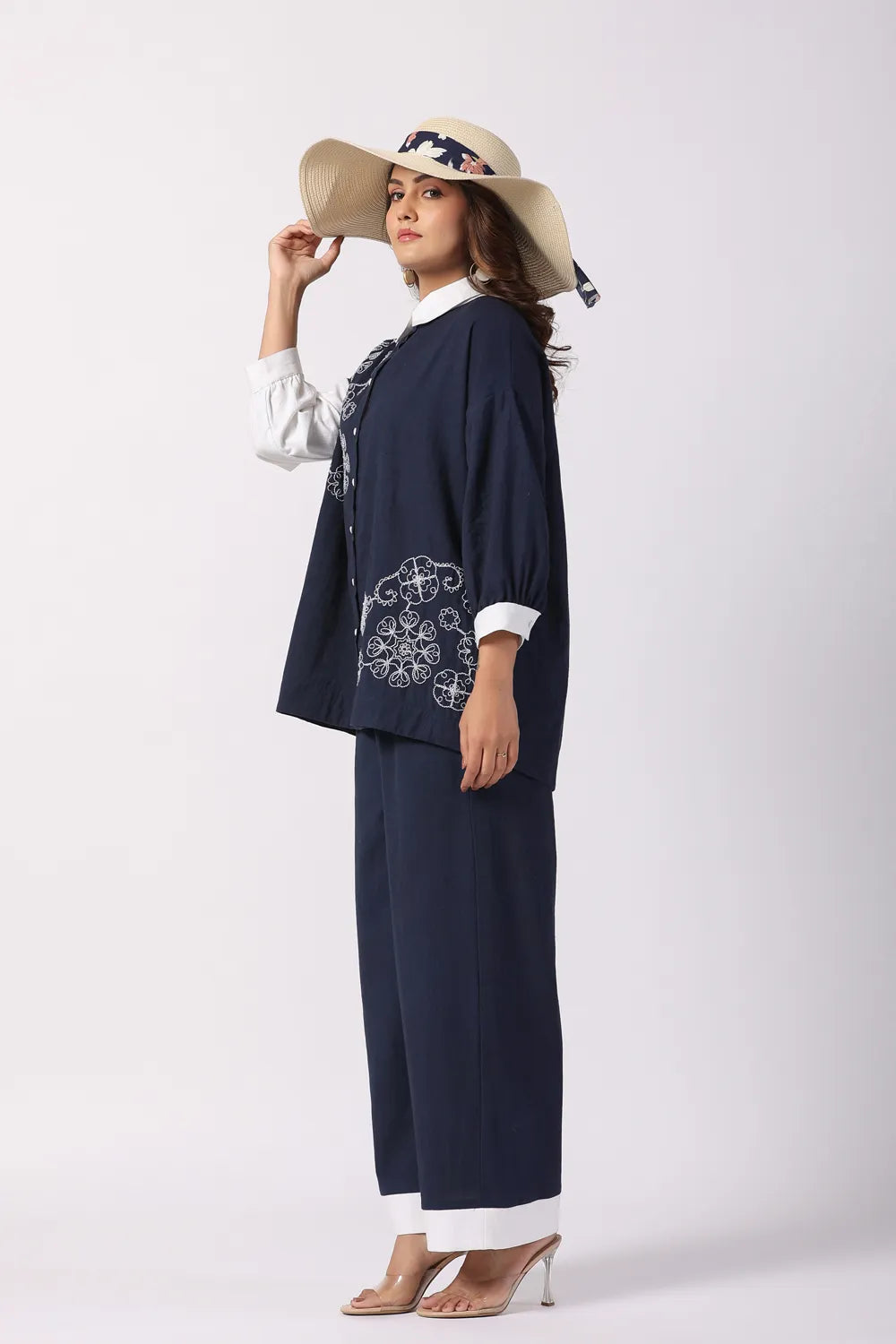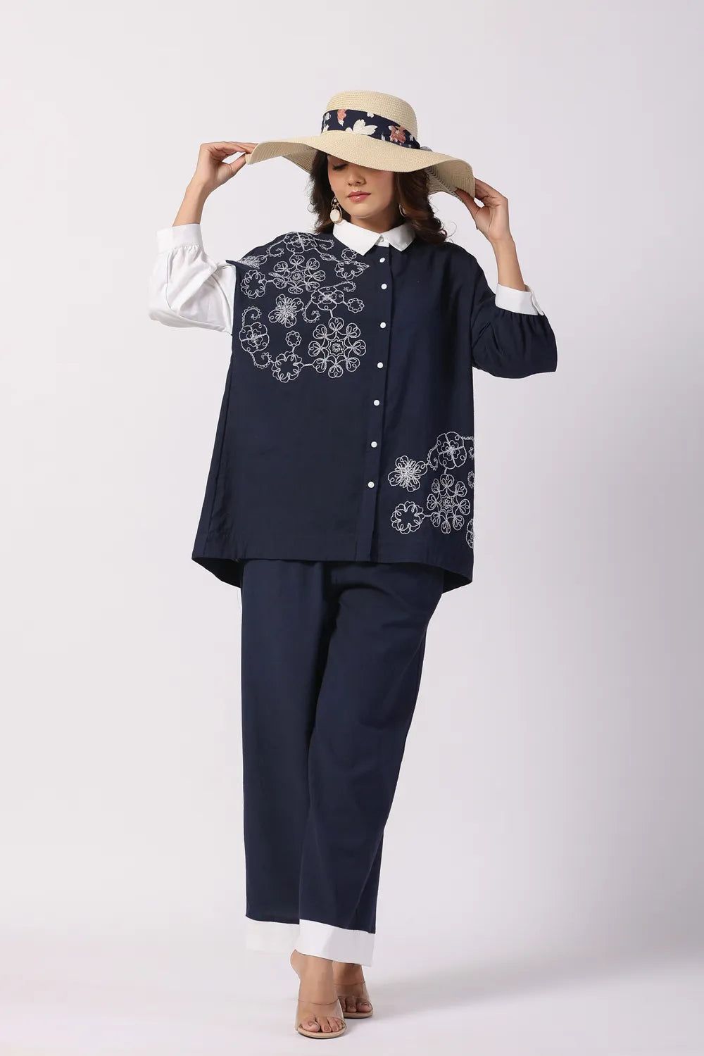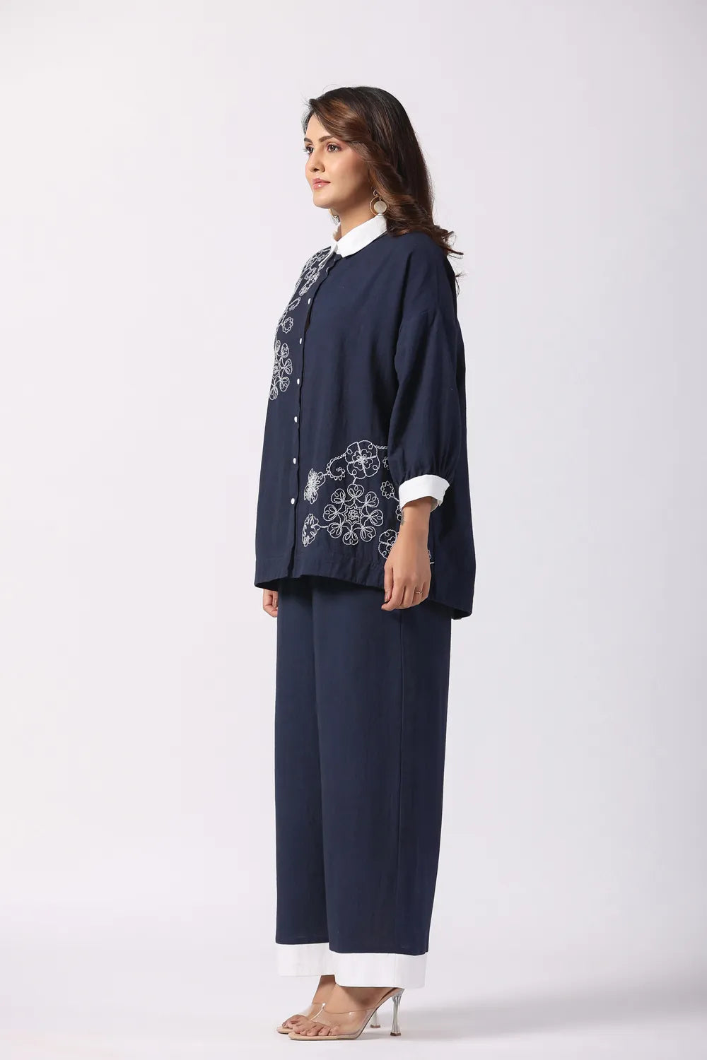 Effortlessly stylish, the Navy Blue & White Embroidered Cotton Co-Ord Set combines modern elegance with breathable comfort. Crafted from premium cotton fabric, this set features a cord-embroidered shirt and coordinated relaxed-fit trousers, making it a perfect blend of sophistication and ease.