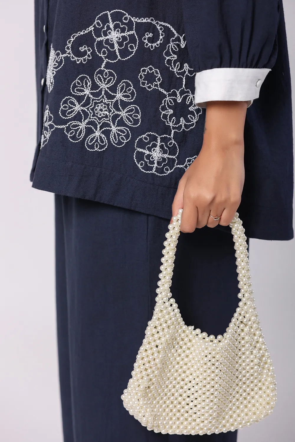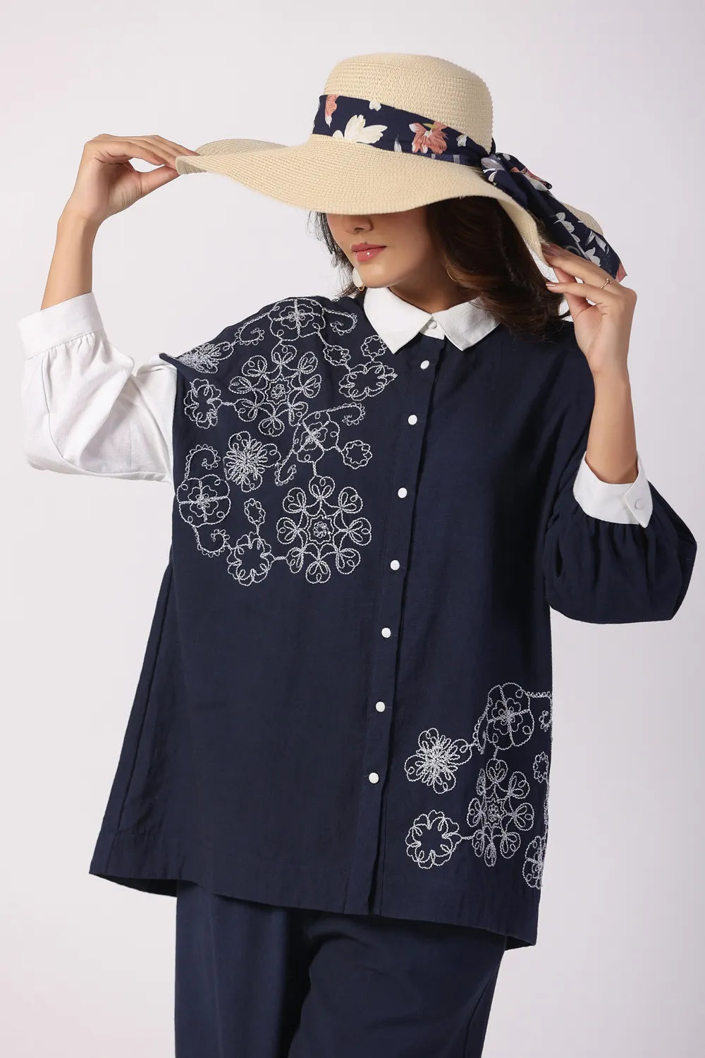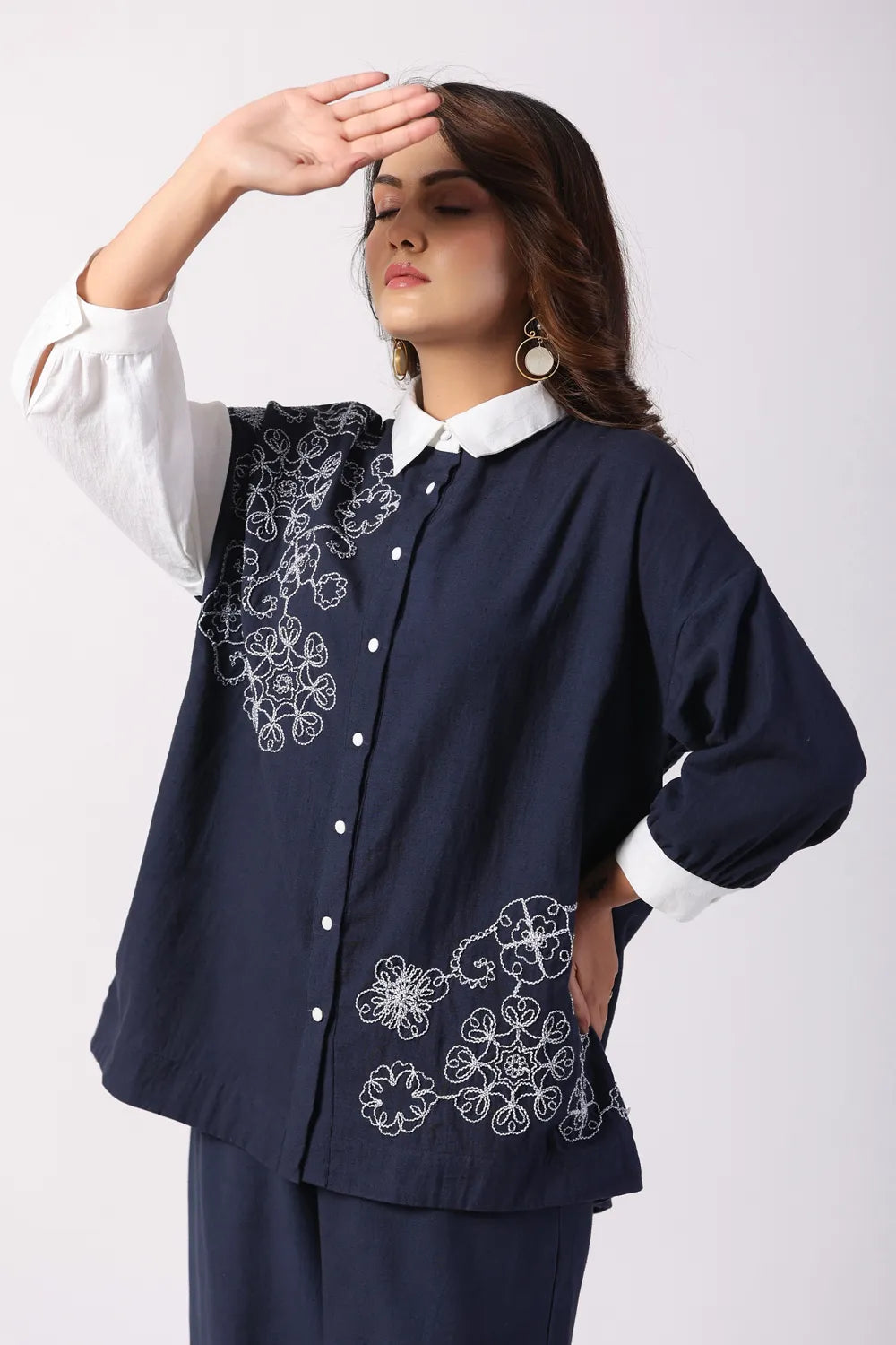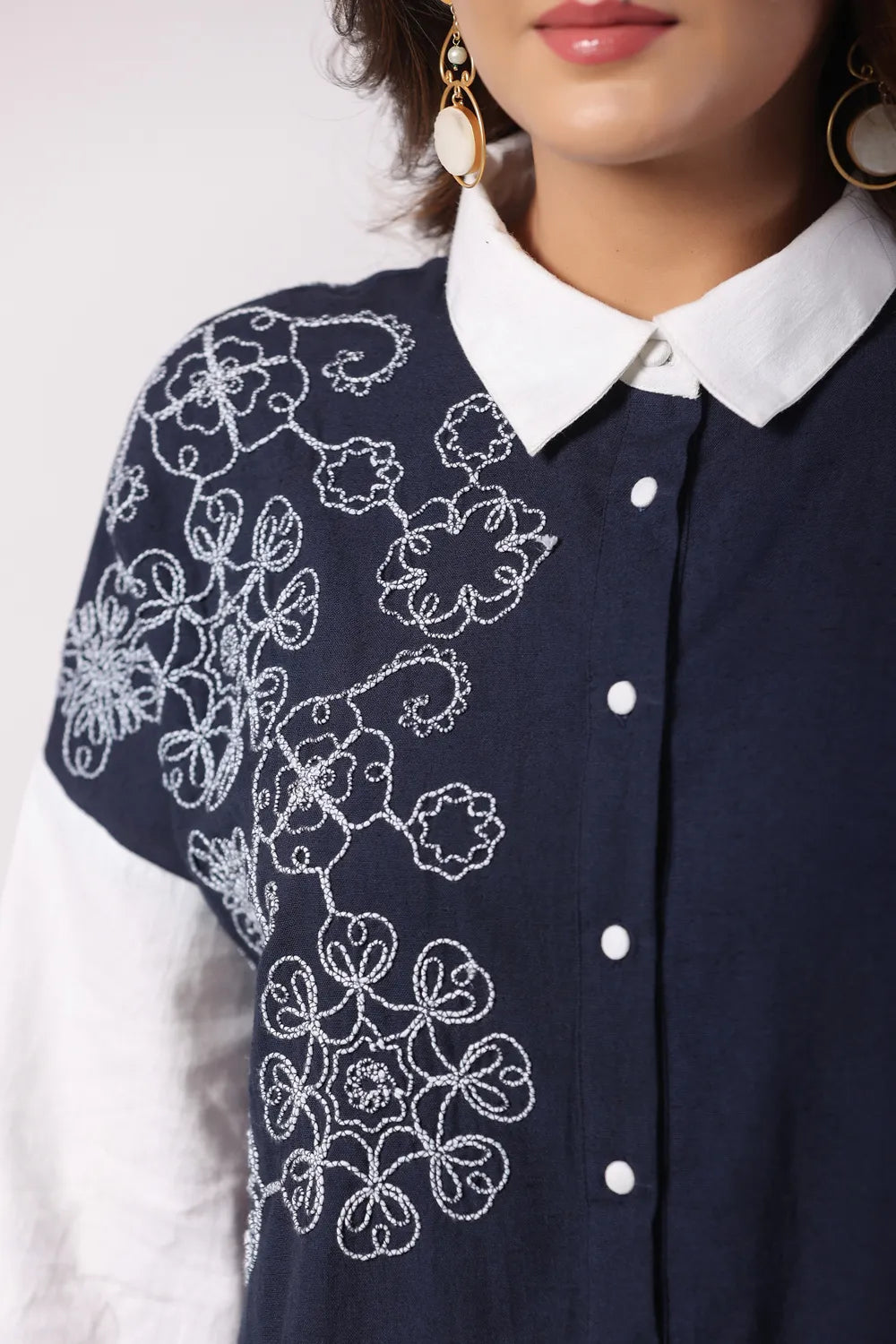 - Shirt: Navy Blue & White cord-embroidered tunic with a spread collar and three-quarter sleeves