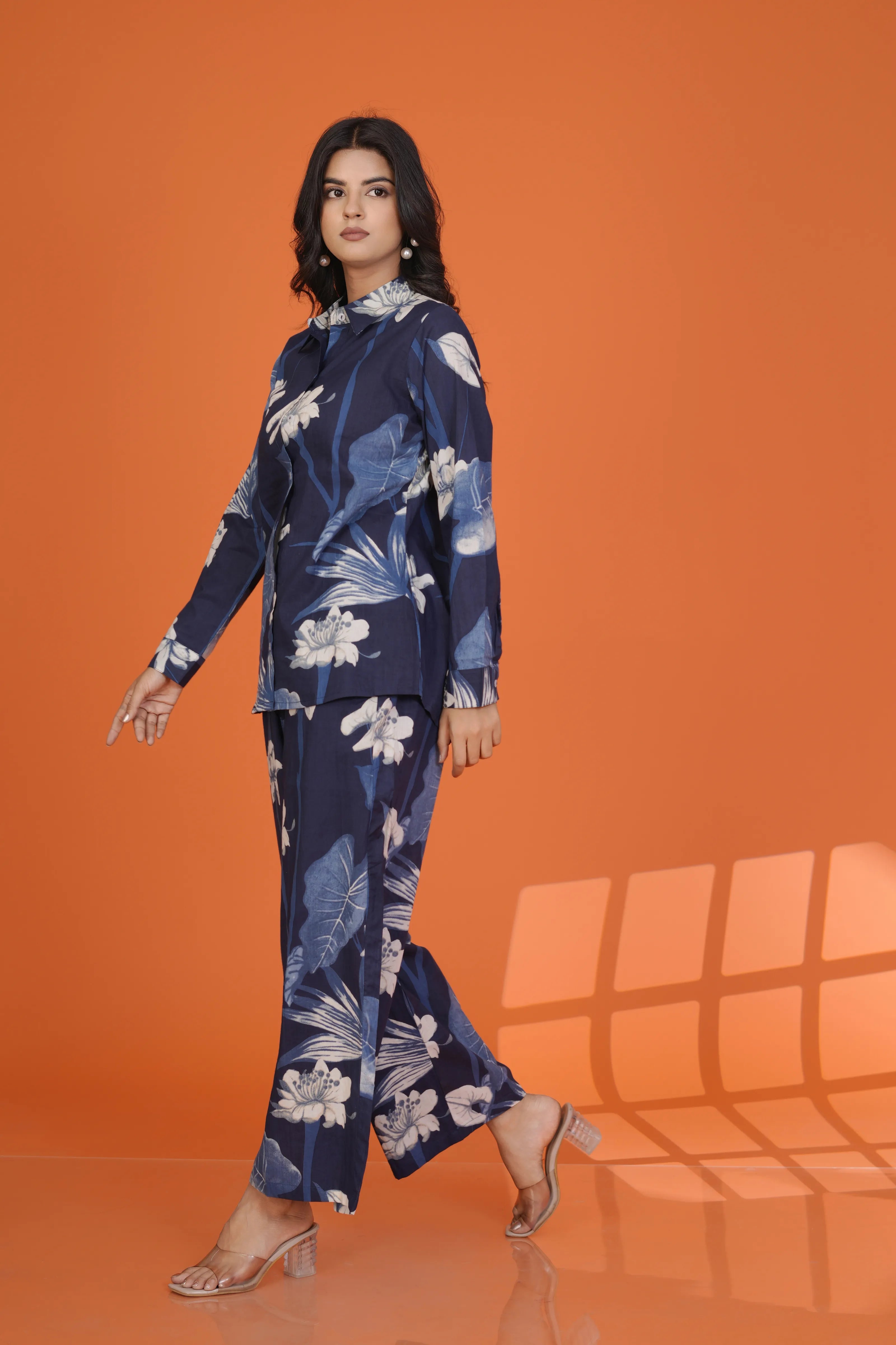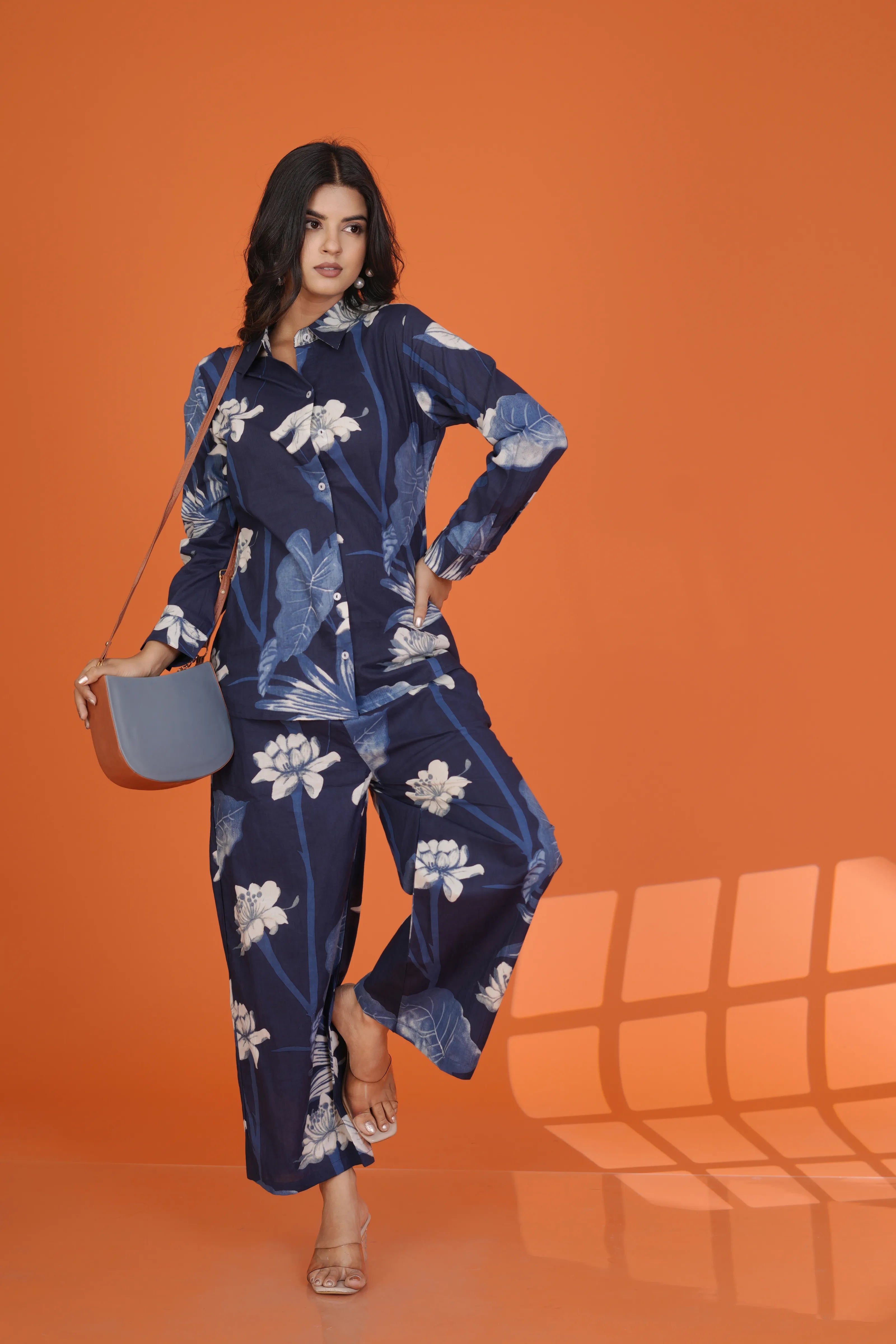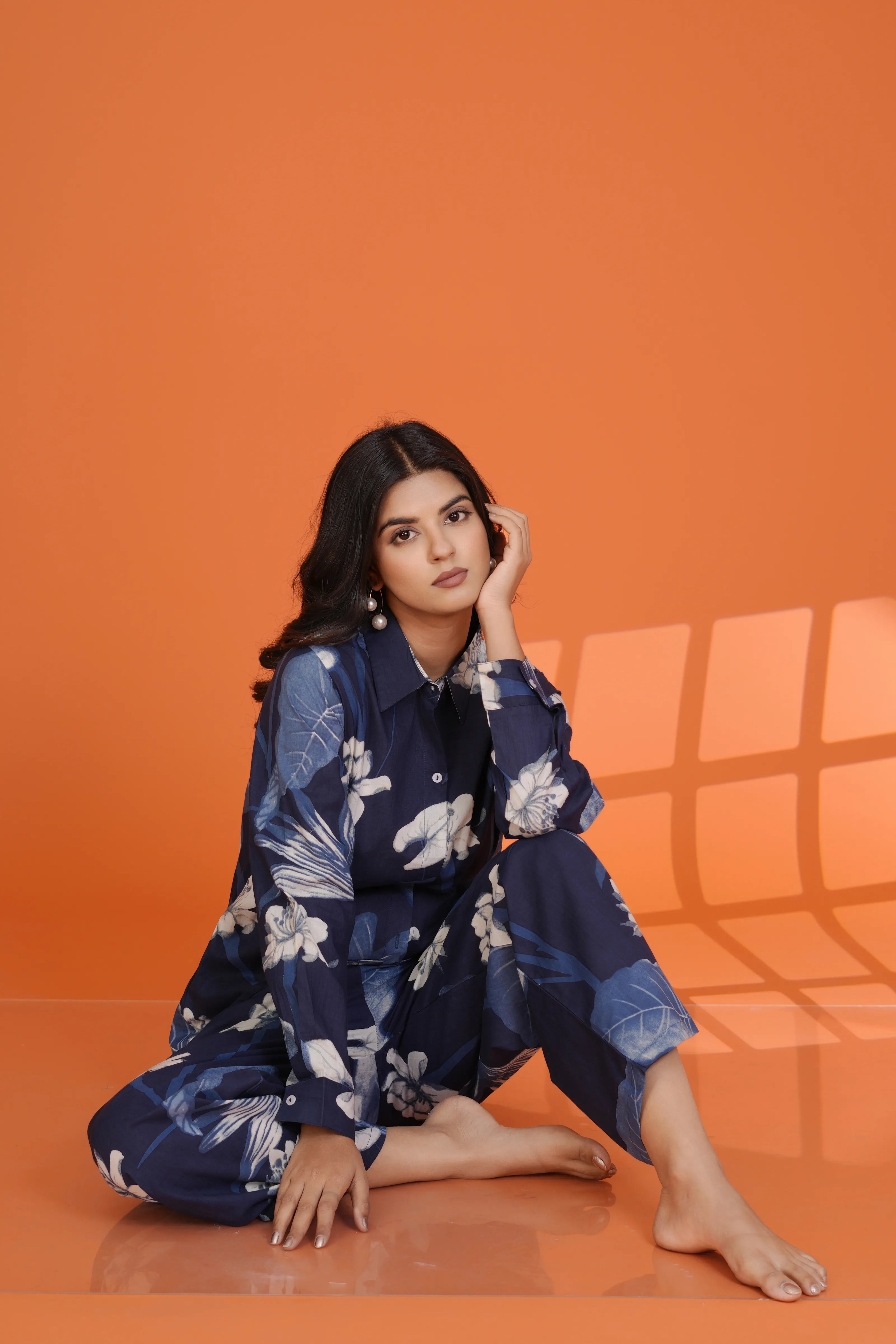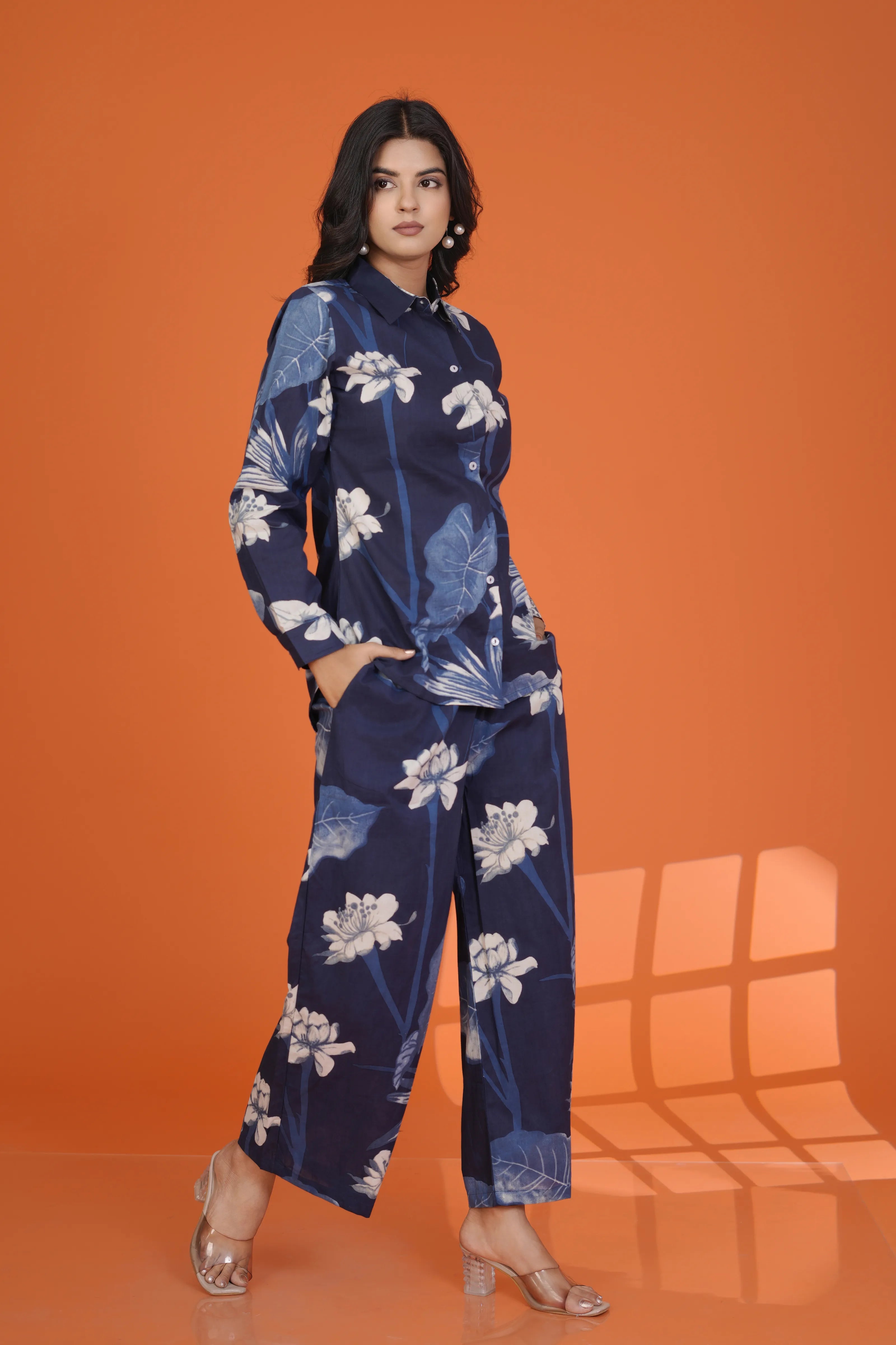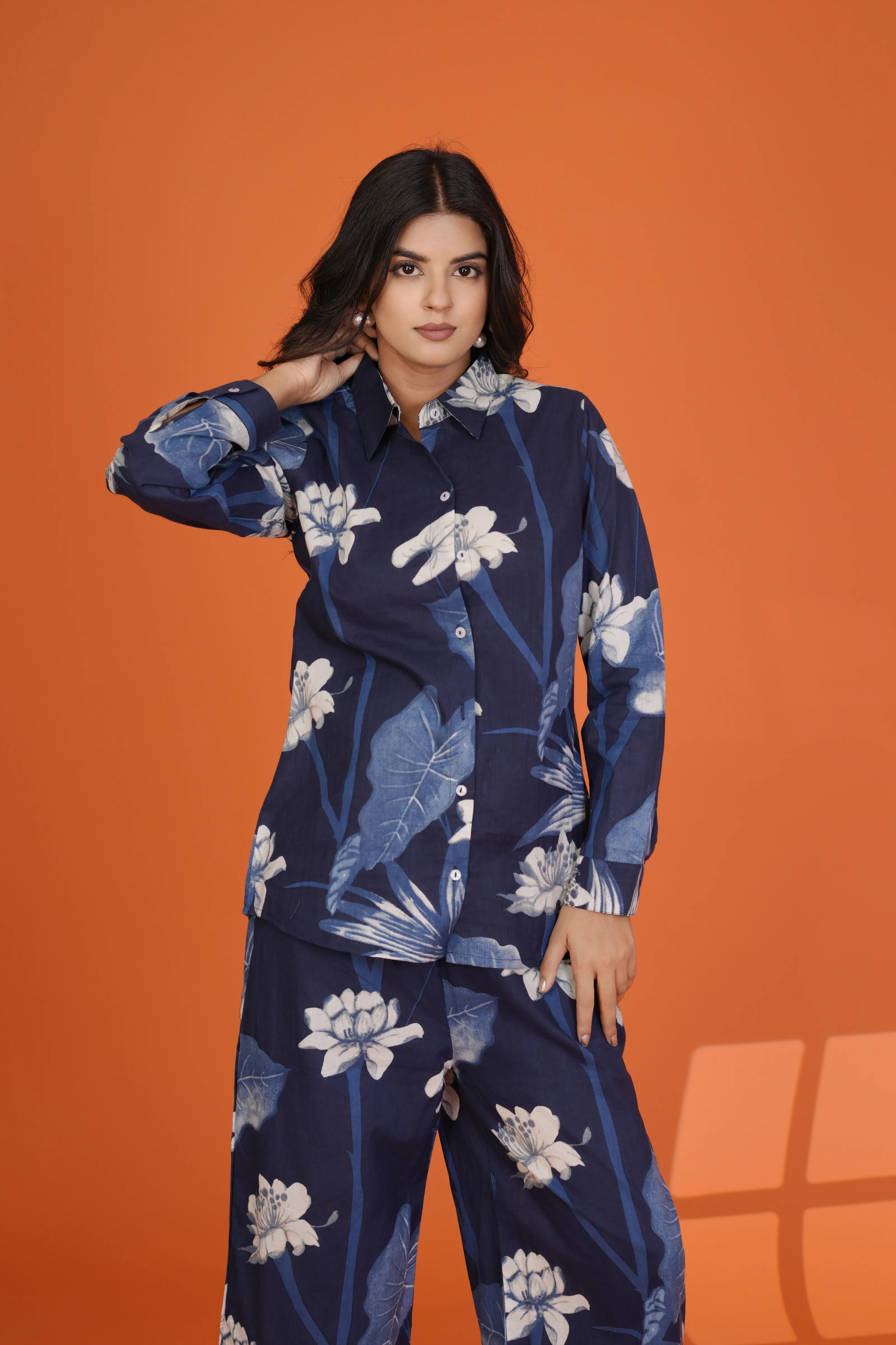 Fabric: Cotton Cambric – soft, breathable, and summer-friendly Color: Navy blue base with ivory white floral print Design Details: Shirt collar, 3/4th sleeves, button-down front, coordinated wide-leg trousers Print: All-over large floral pattern with organic flow Fit: Relaxed yet structured for all-day comfort