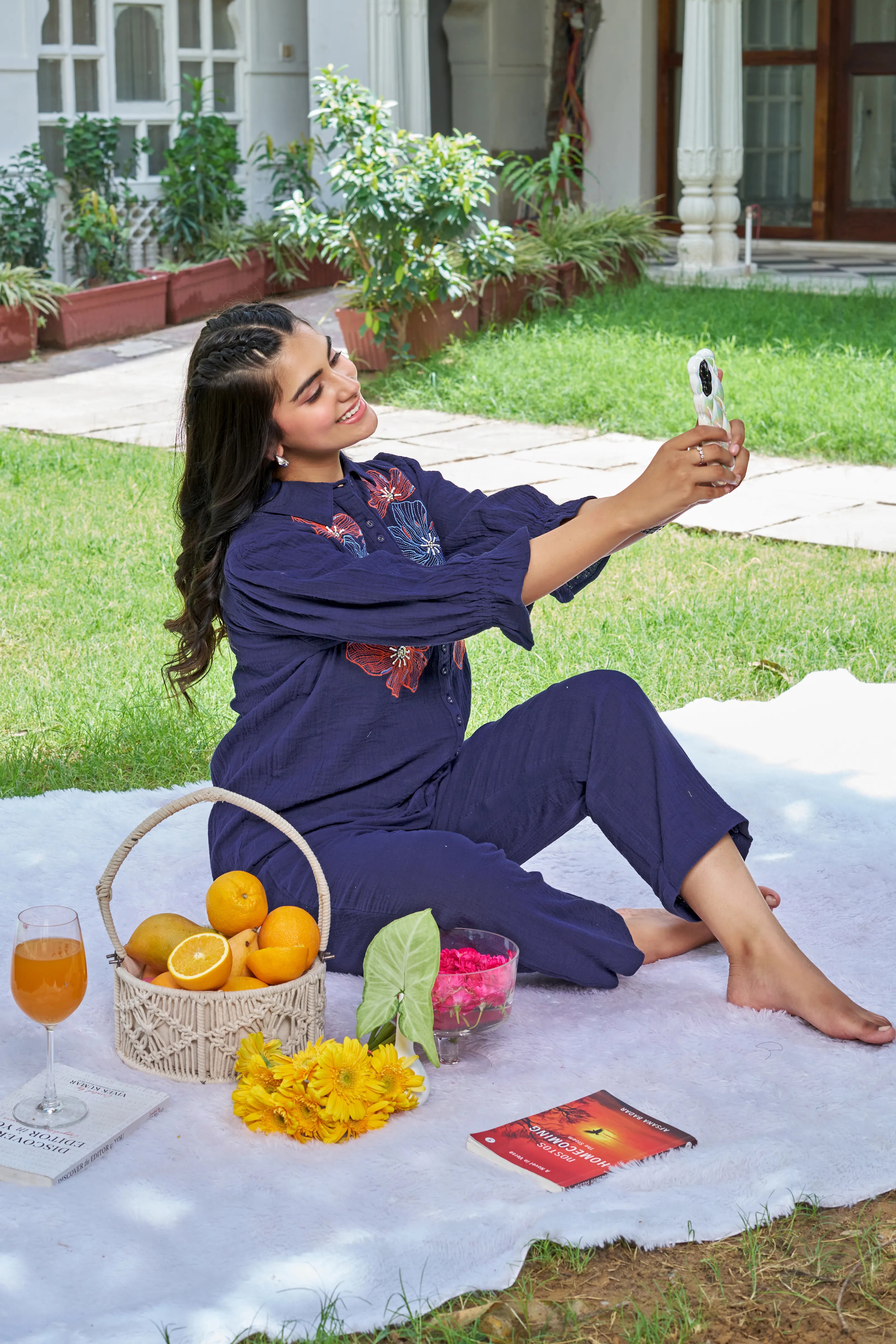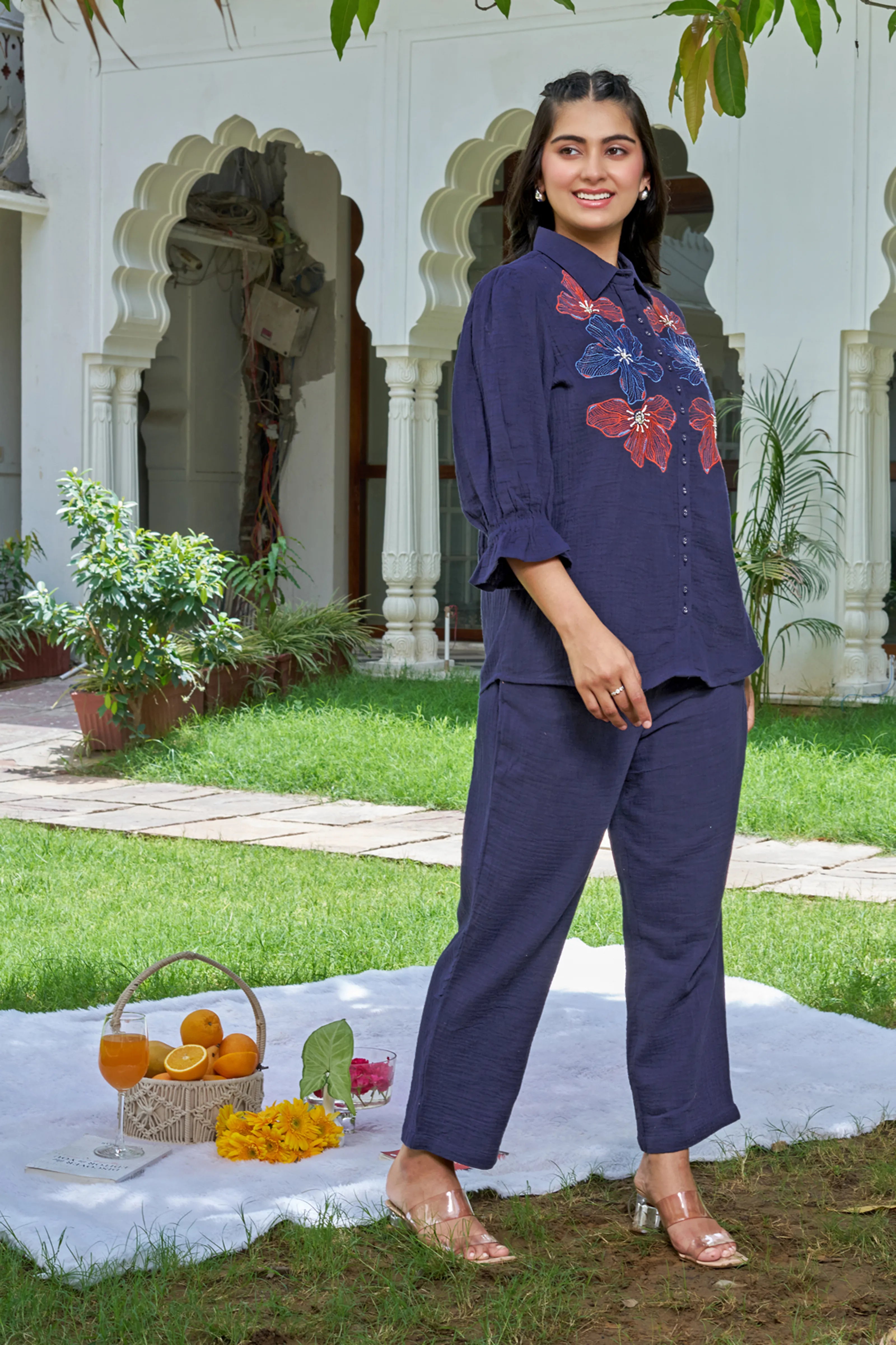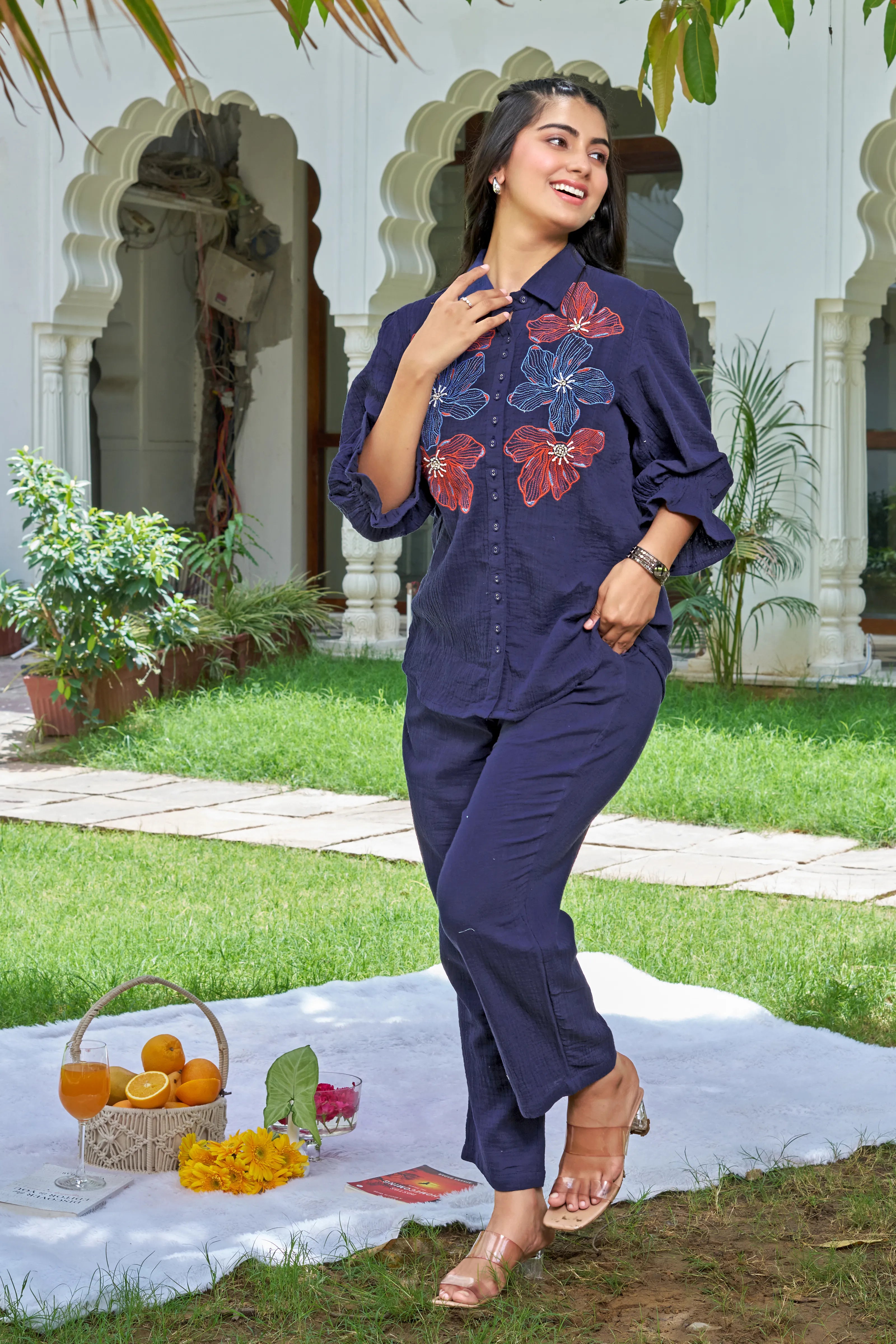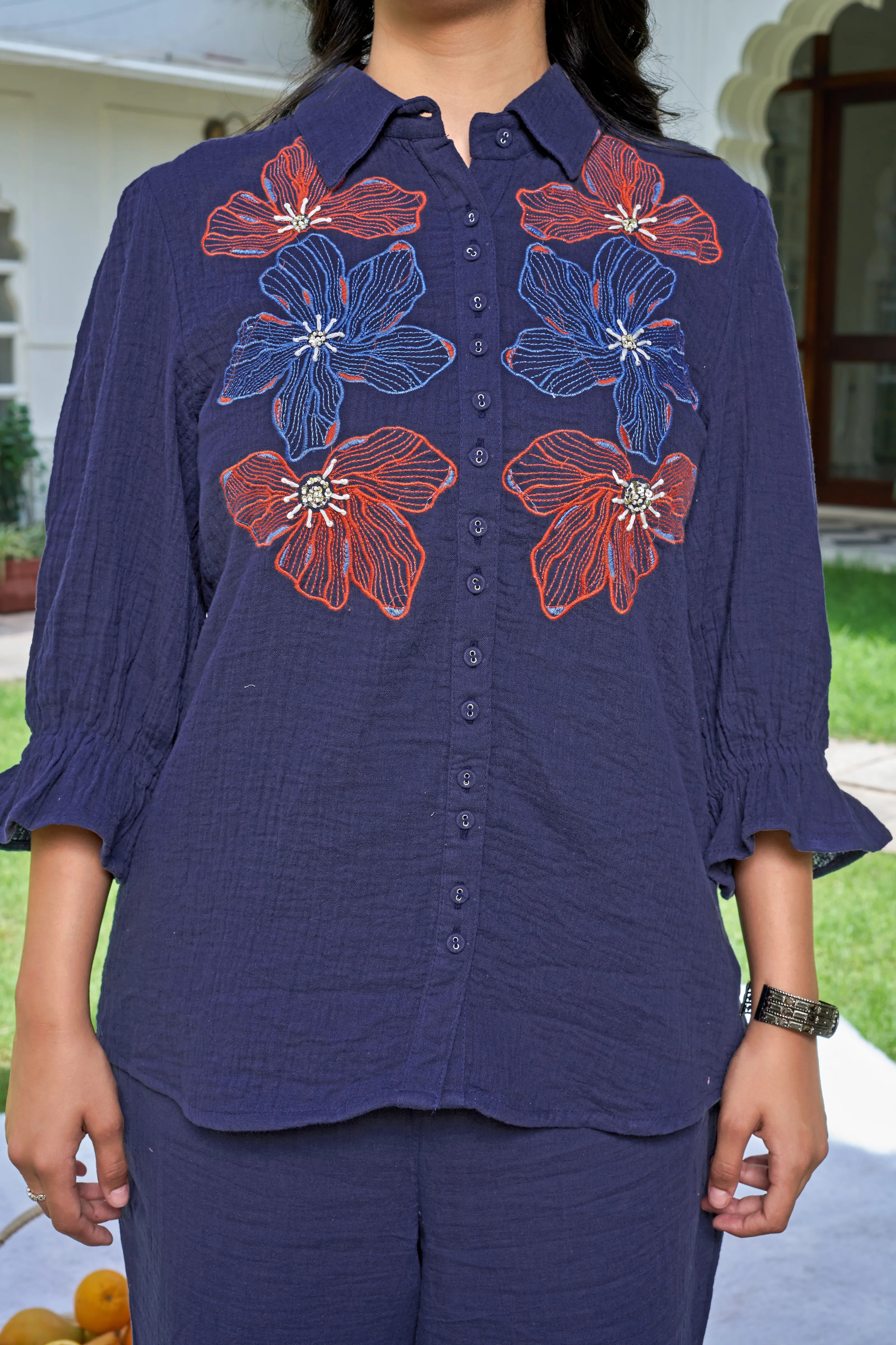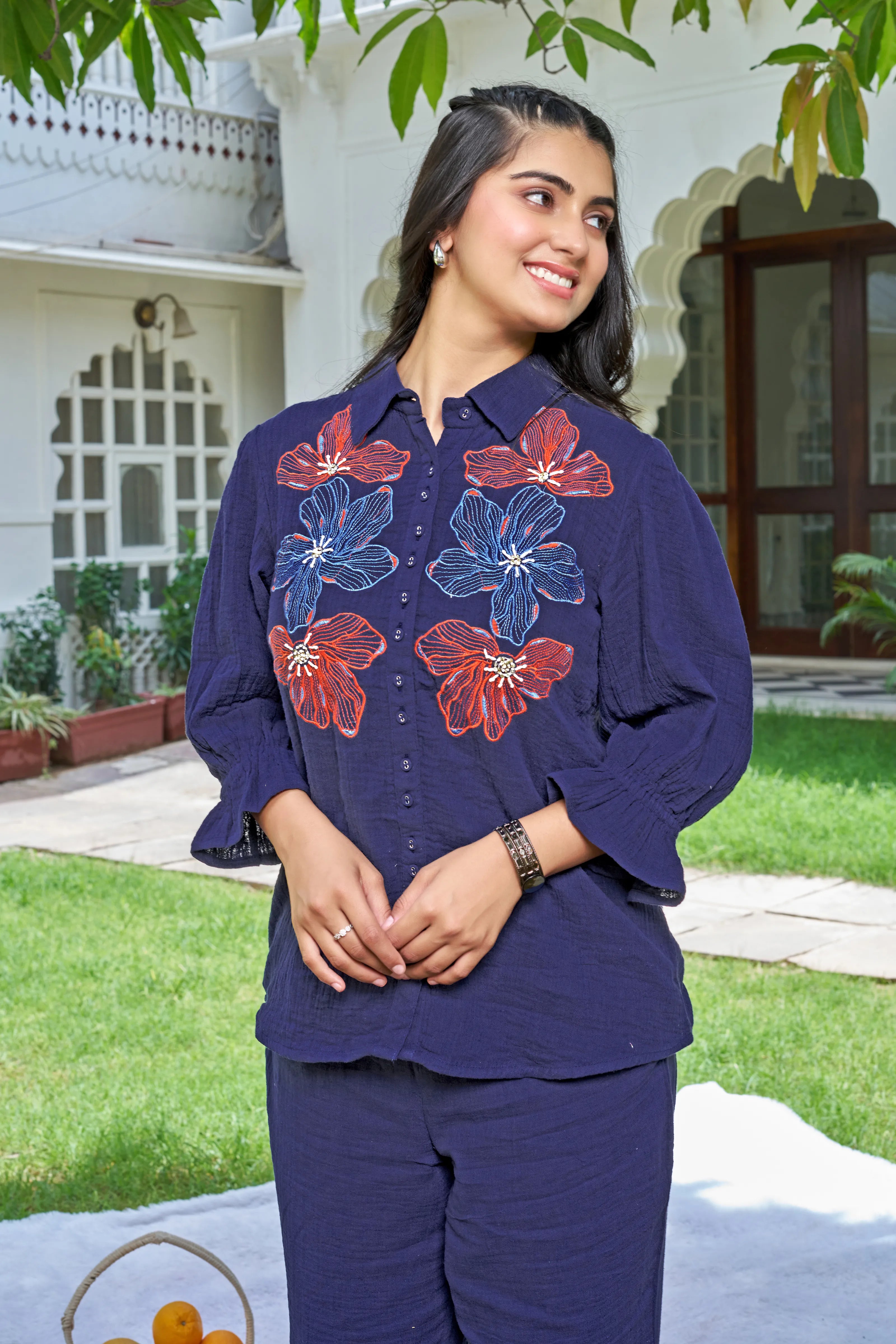 Celebrate the bloom of confidence with Botanic Muse — a navy cotton co-ord set designed to bring comfort and charm into effortless alignment. The front-open shirt features bold, intricately embroidered floral motifs in vibrant contrast hues, adding a dash of artistry to its minimal elegance.