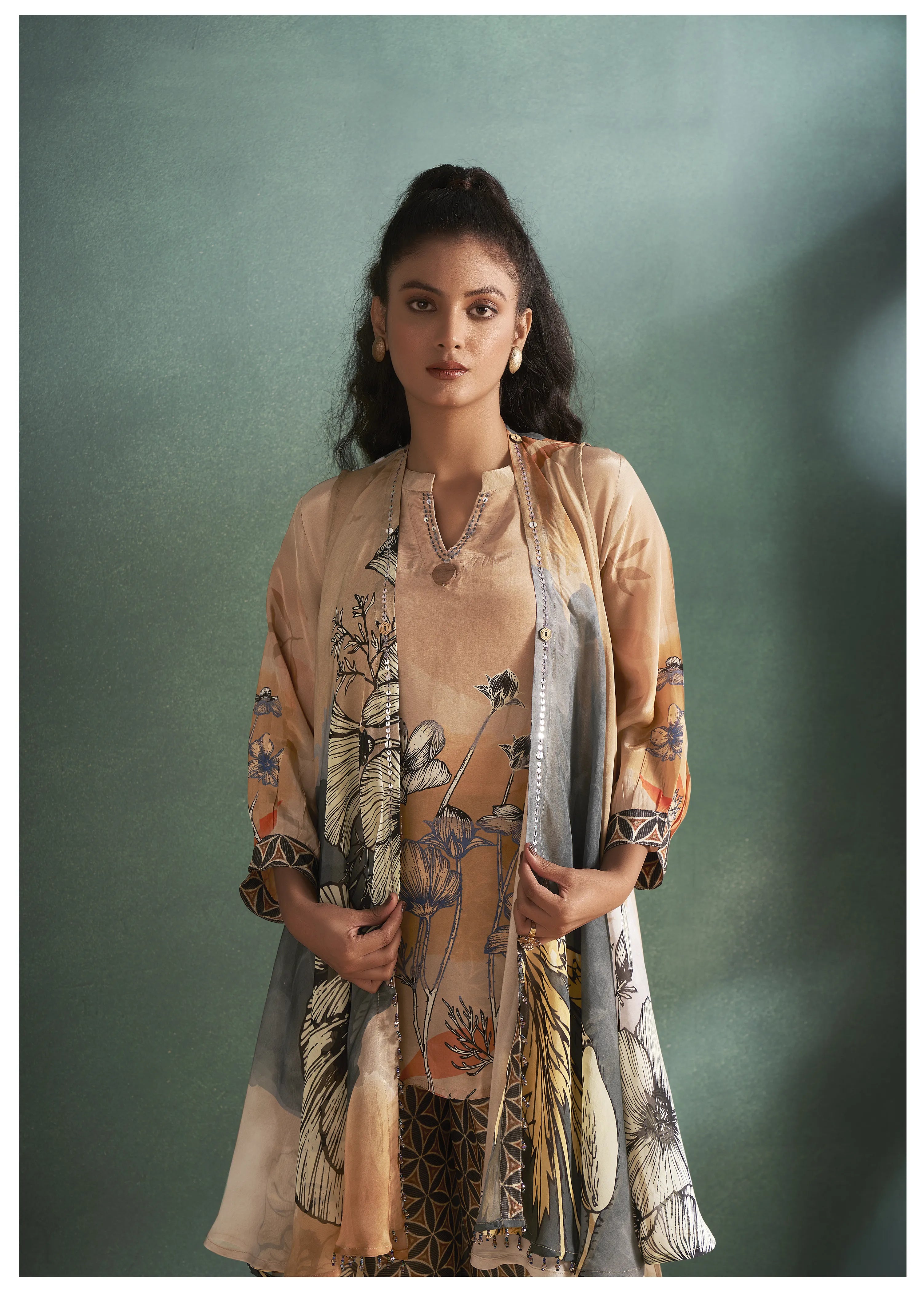 This Ochre Floral Muslin Diamond Detailed Shrug 3-Piece Set is an effortlessly stylish and comfortable outfit that combines bold design with delicate embellishments, making it a standout choice for any occasion.