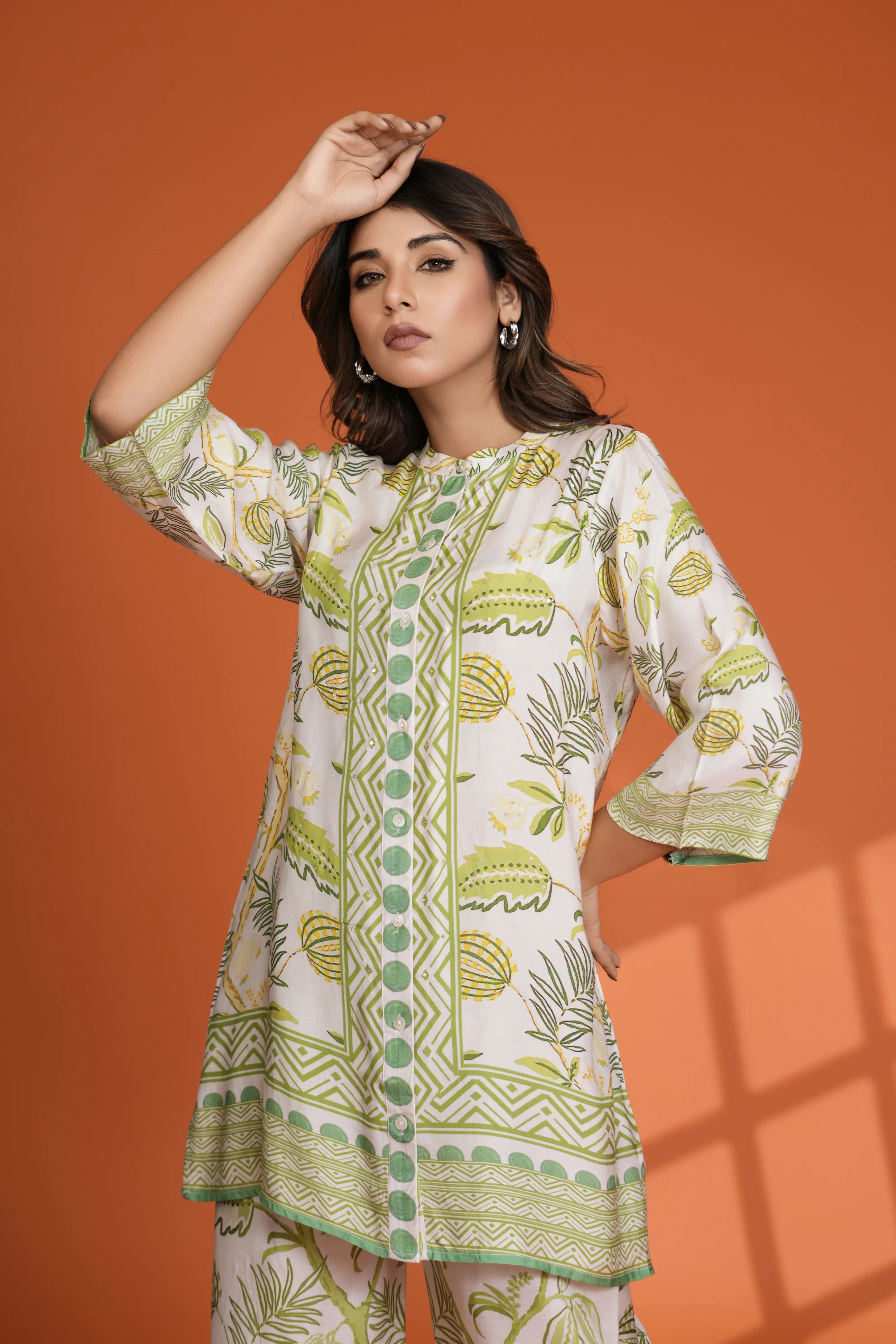 Brighten up your wardrobe with this Off-White Base Co-Ord Set, featuring green and yellow abstract floral prints that exude a refreshing yet elegant vibe. Made in soft, breathable viscose muslin, the set is designed with a Mandarin collar, button-down front, and shimmering sequin work detailing on the 3/4th sleeves, adding a hint of festive sparkle.