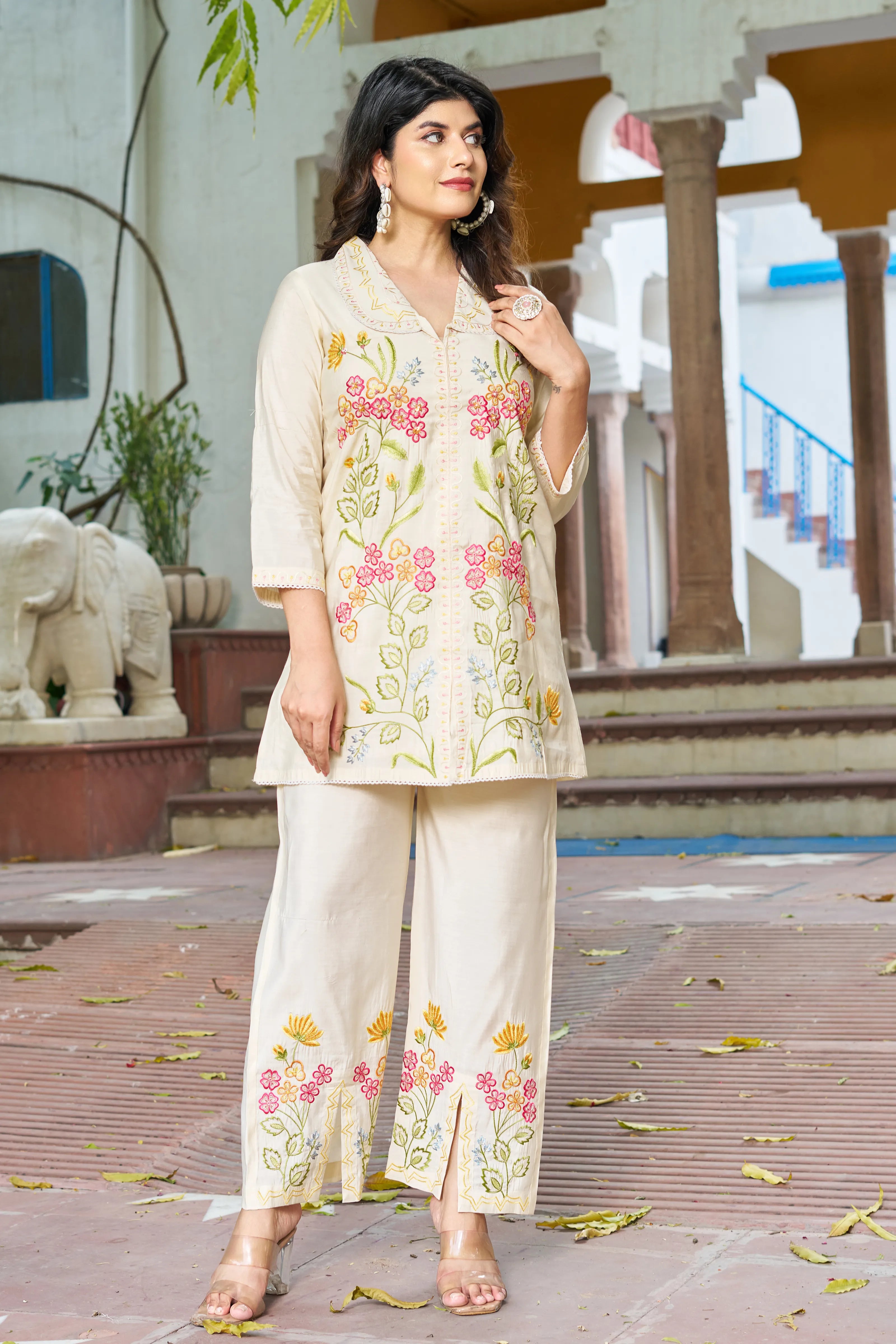 Meadow Muse: Off-White Embroidered Roman Silk Co-ord Set