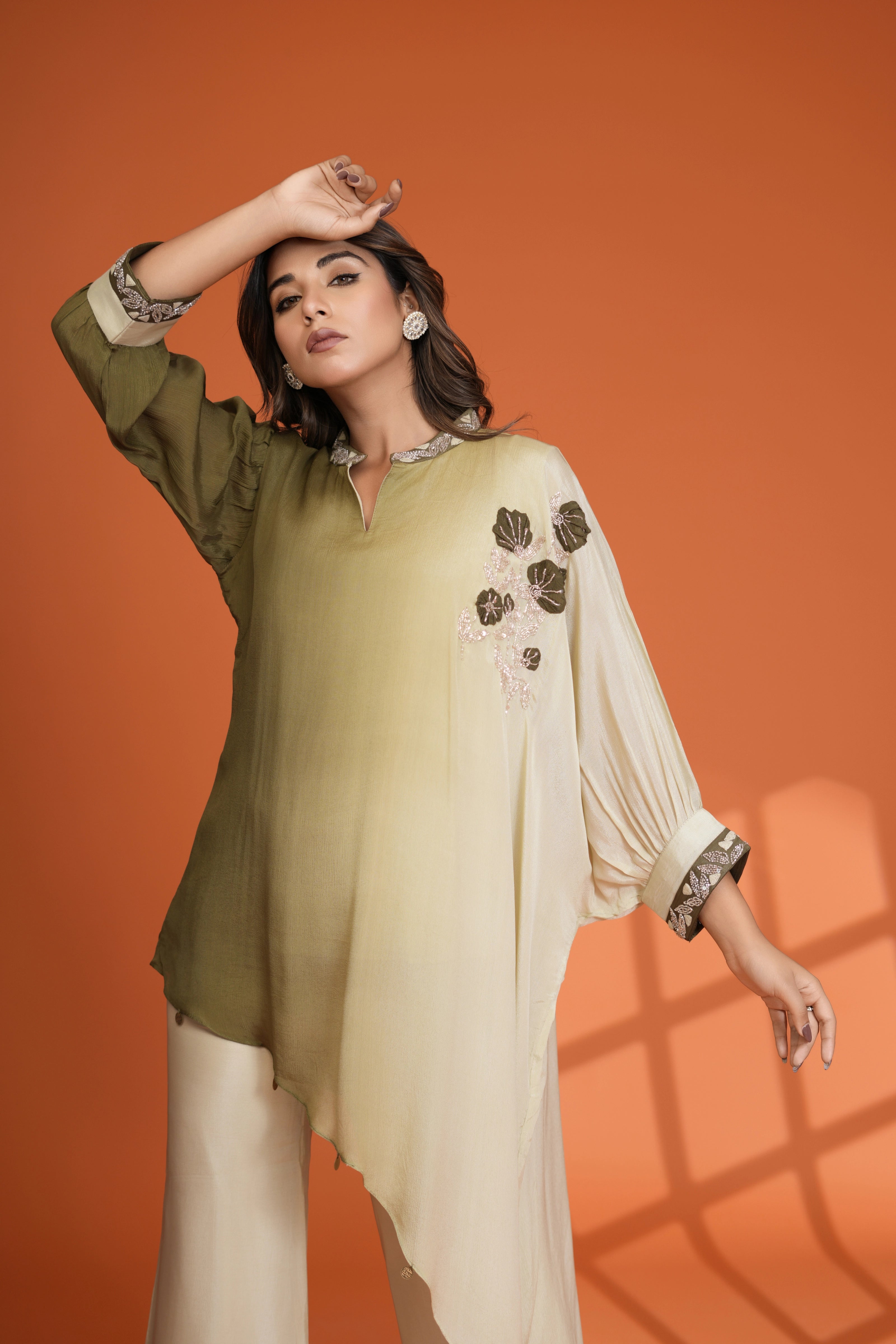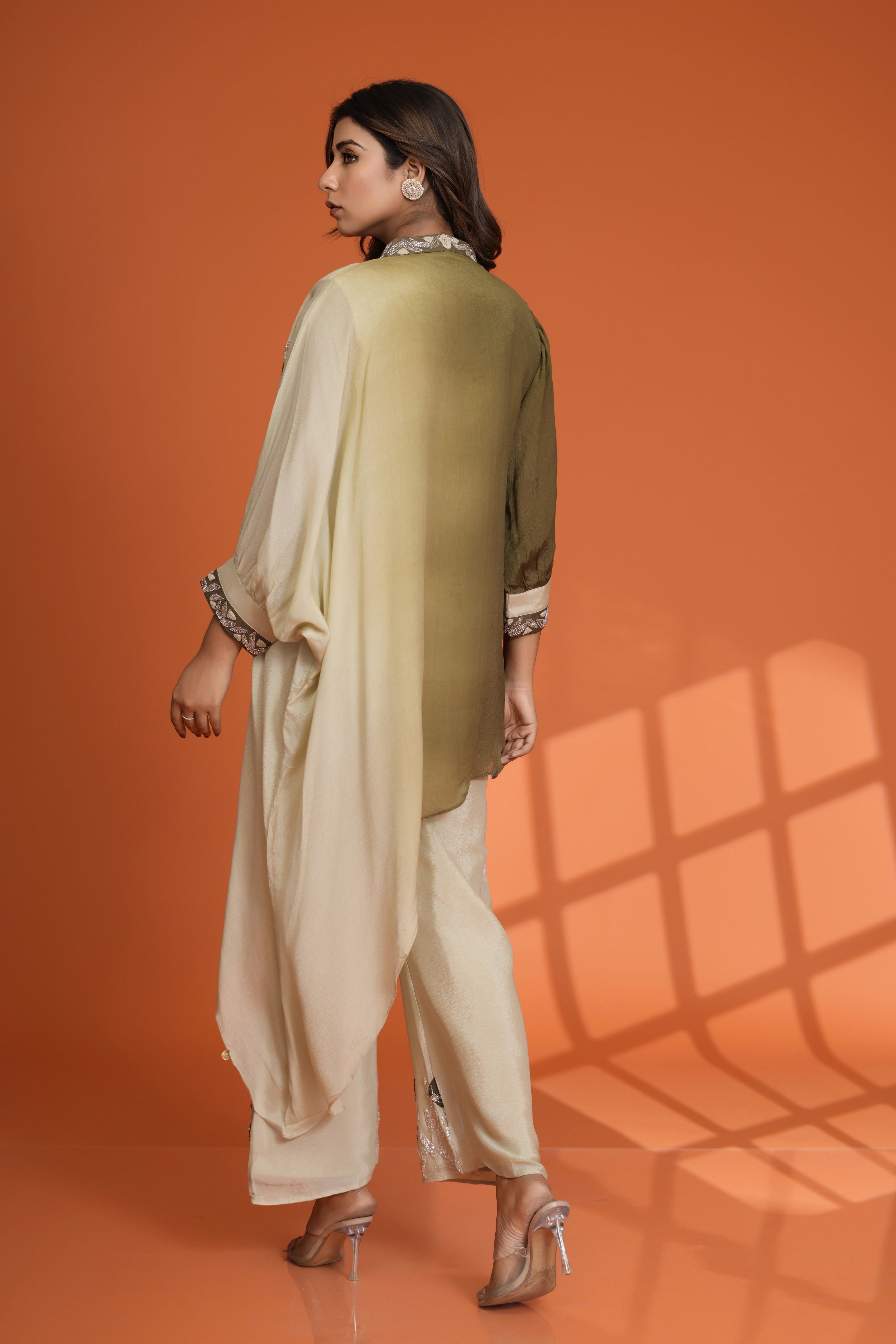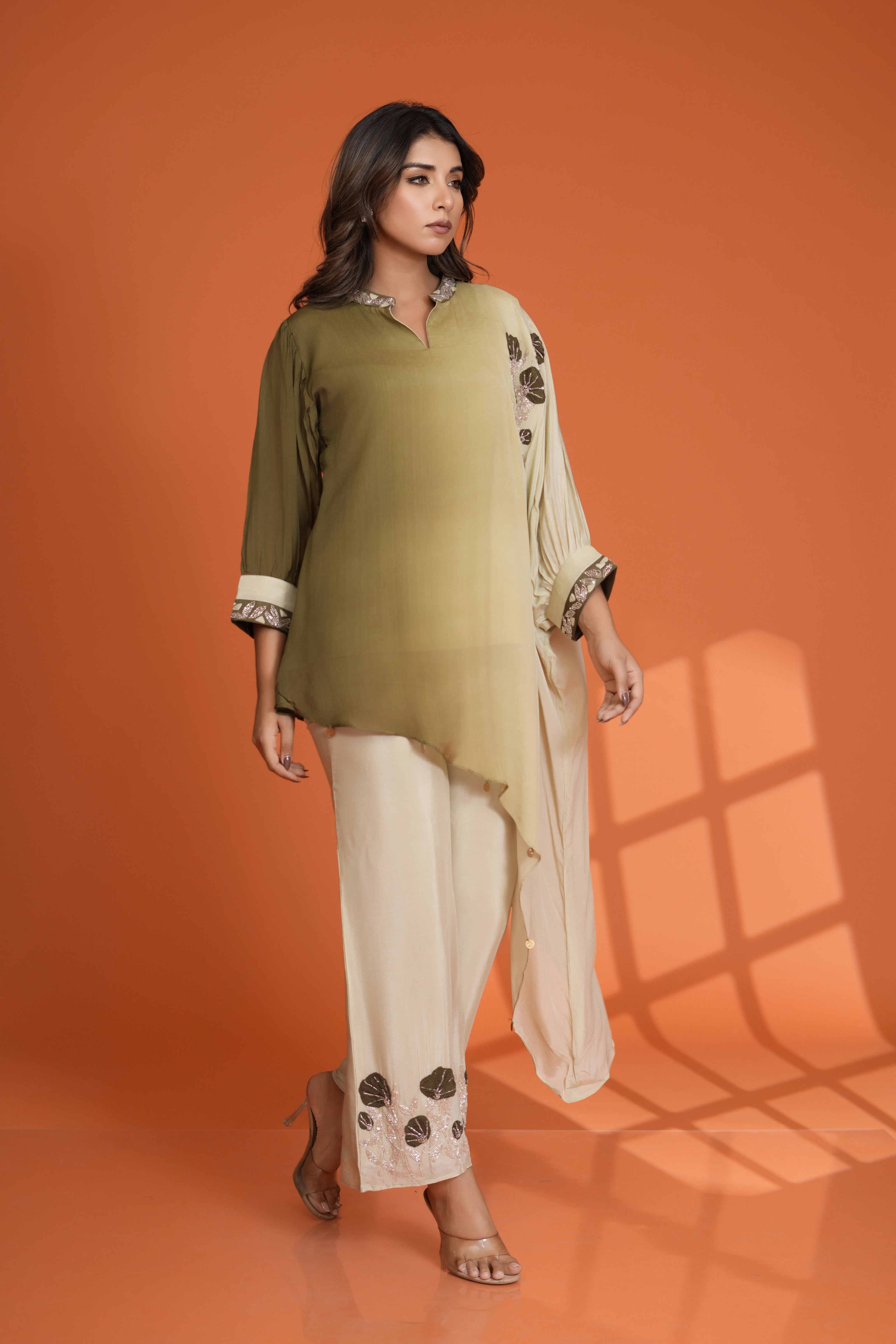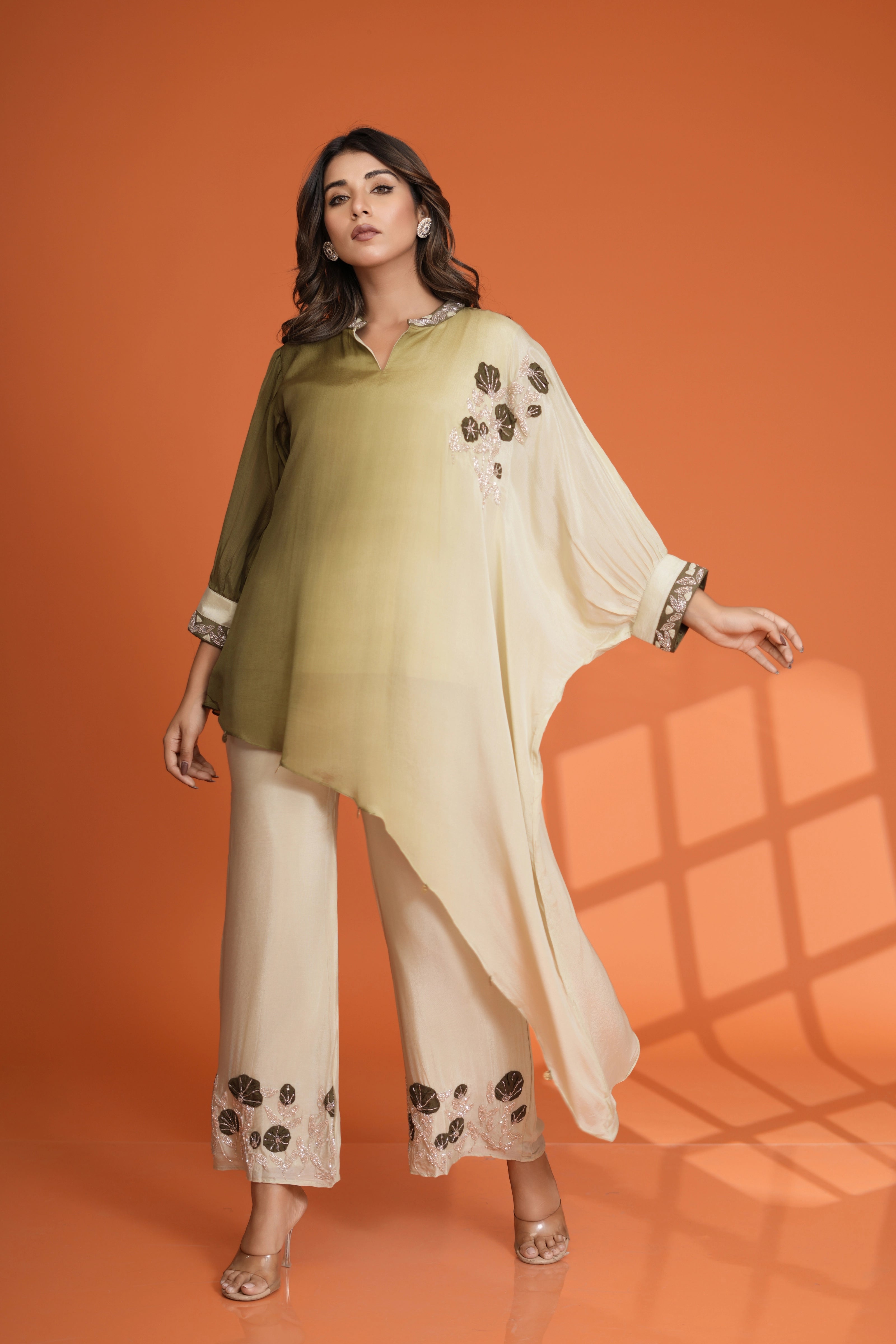 Embrace effortless elegance with this Olive Green Dip Dye Co-Ord Set, designed with a round-neck embroidered top featuring delicate sequin detailing, paired with flowy wide-leg pants for a sophisticated and graceful silhouette. Crafted from luxurious Chinon fabric, this set is perfect for festive occasions and evening soirées, adding a touch of glamour to your wardrobe.