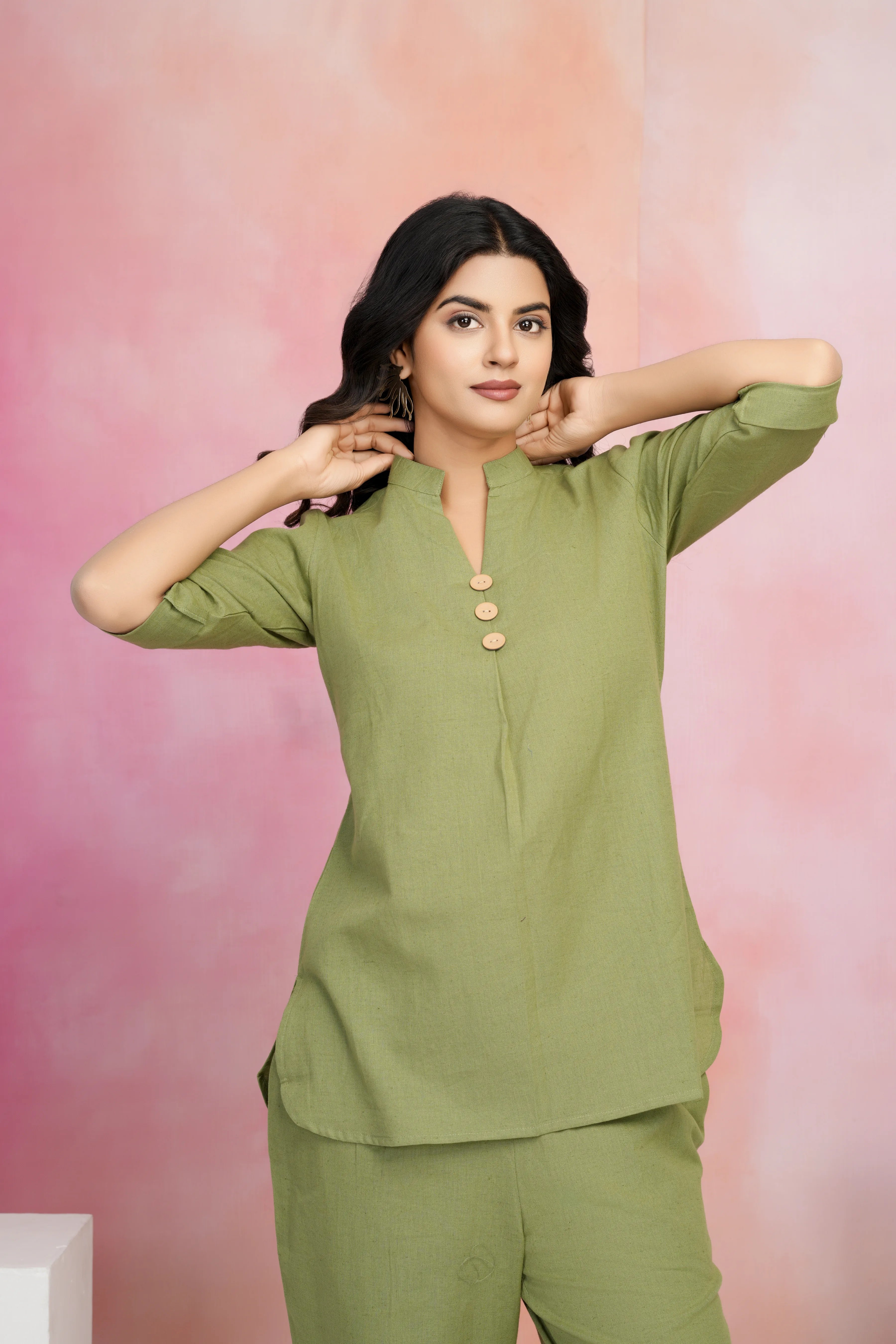 Brighten up your wardrobe with this Parrot Green Co-Ord Set, crafted from breathable cotton flex for all-day comfort. Featuring a Mandarin collar with a V-neckline and big stitched button details, this set blends elegance with modern minimalism.