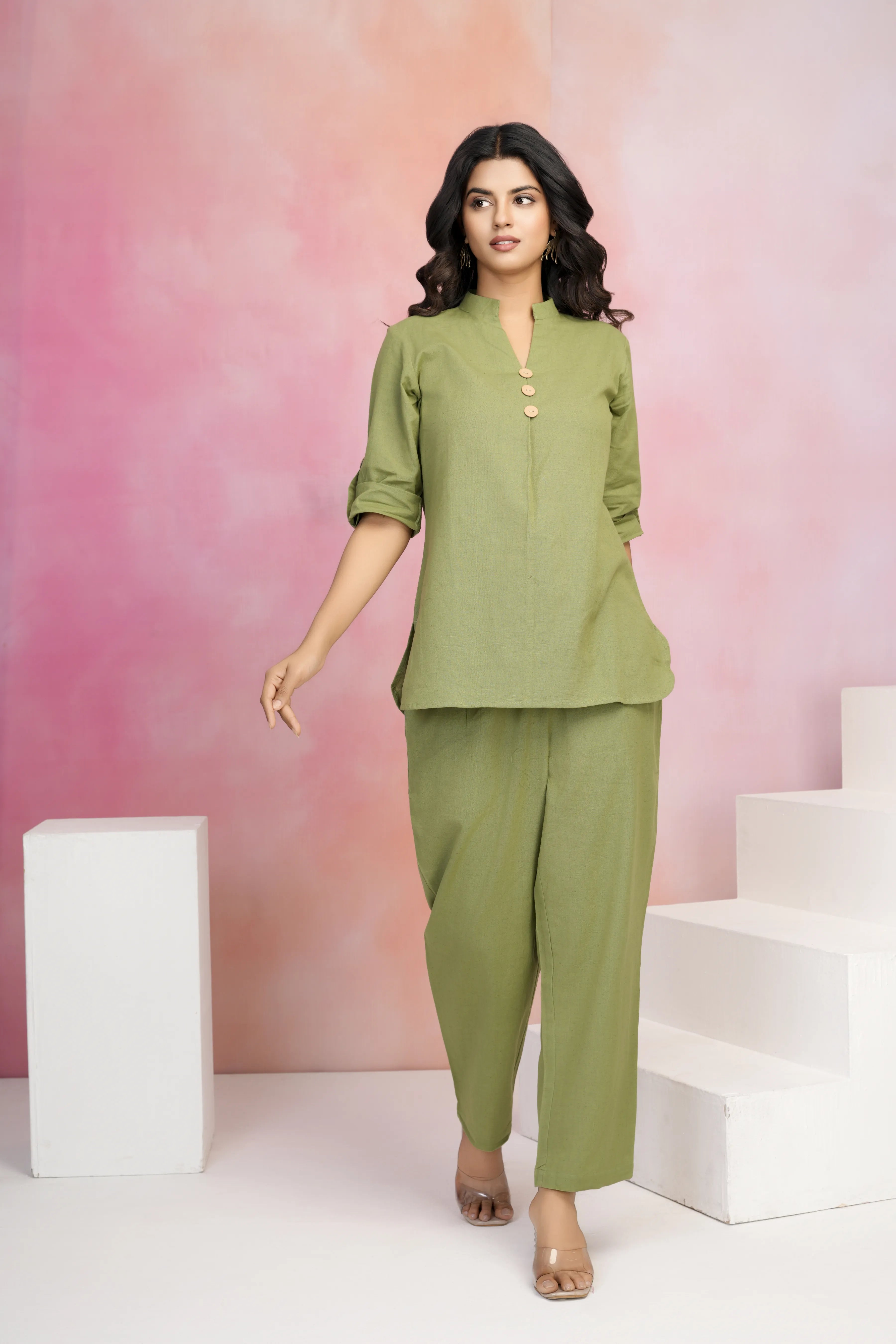 Parrot Green Cotton Flex Co-Ord Set with Mandarin Collar & Stitched Button Details