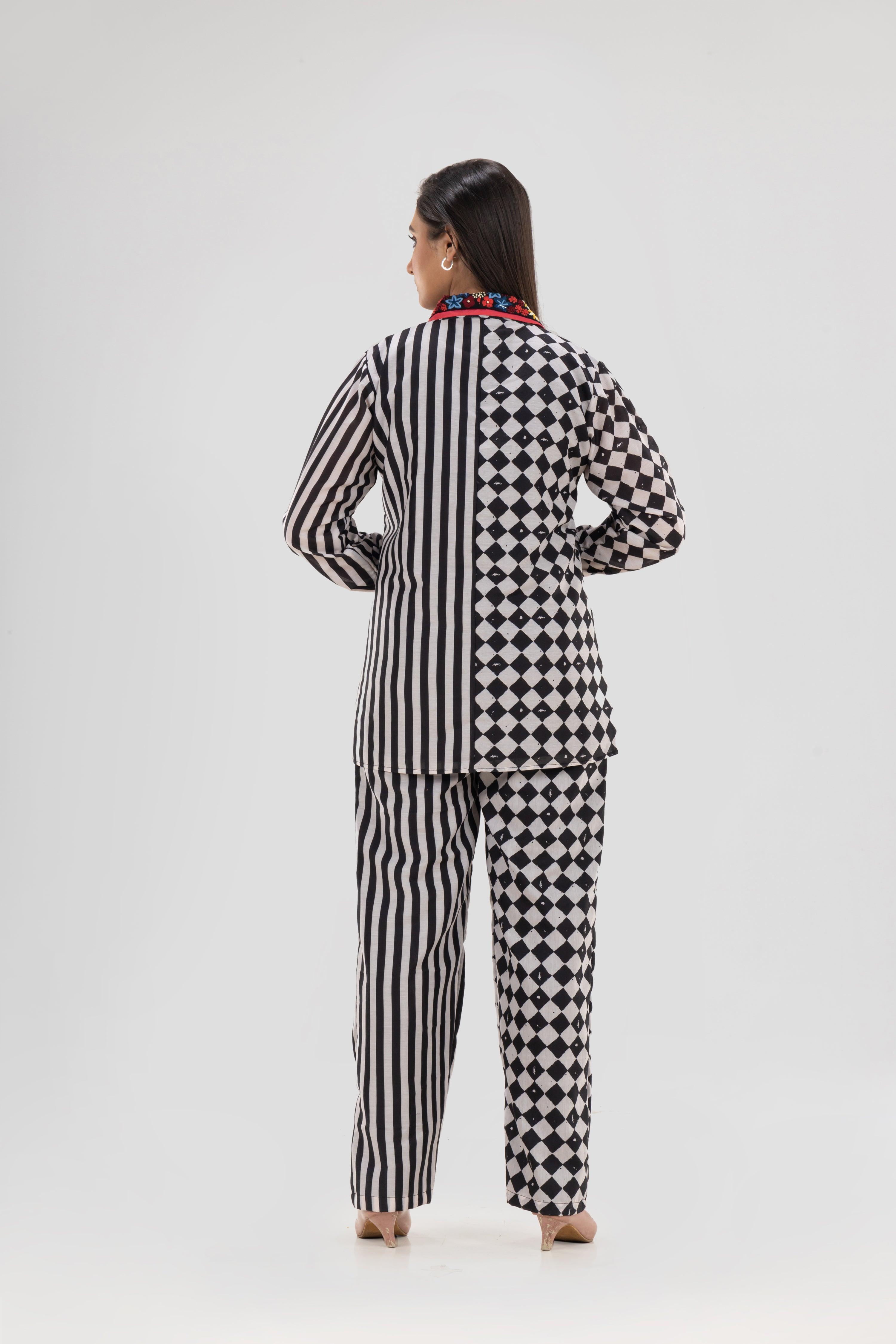 Discover a chic fusion of bold stripes and timeless chessboard patterns with the Partial Stripes and Chess Black & White Muslin Co-Ord Set. This stylish co-ord set is designed with a shirt collar, relaxed sleeves, and embroidery work, making it a versatile choice for both casual outings and relaxed day wear. The solid colors combined with the striking pattern make it a standout piece in your wardrobe.