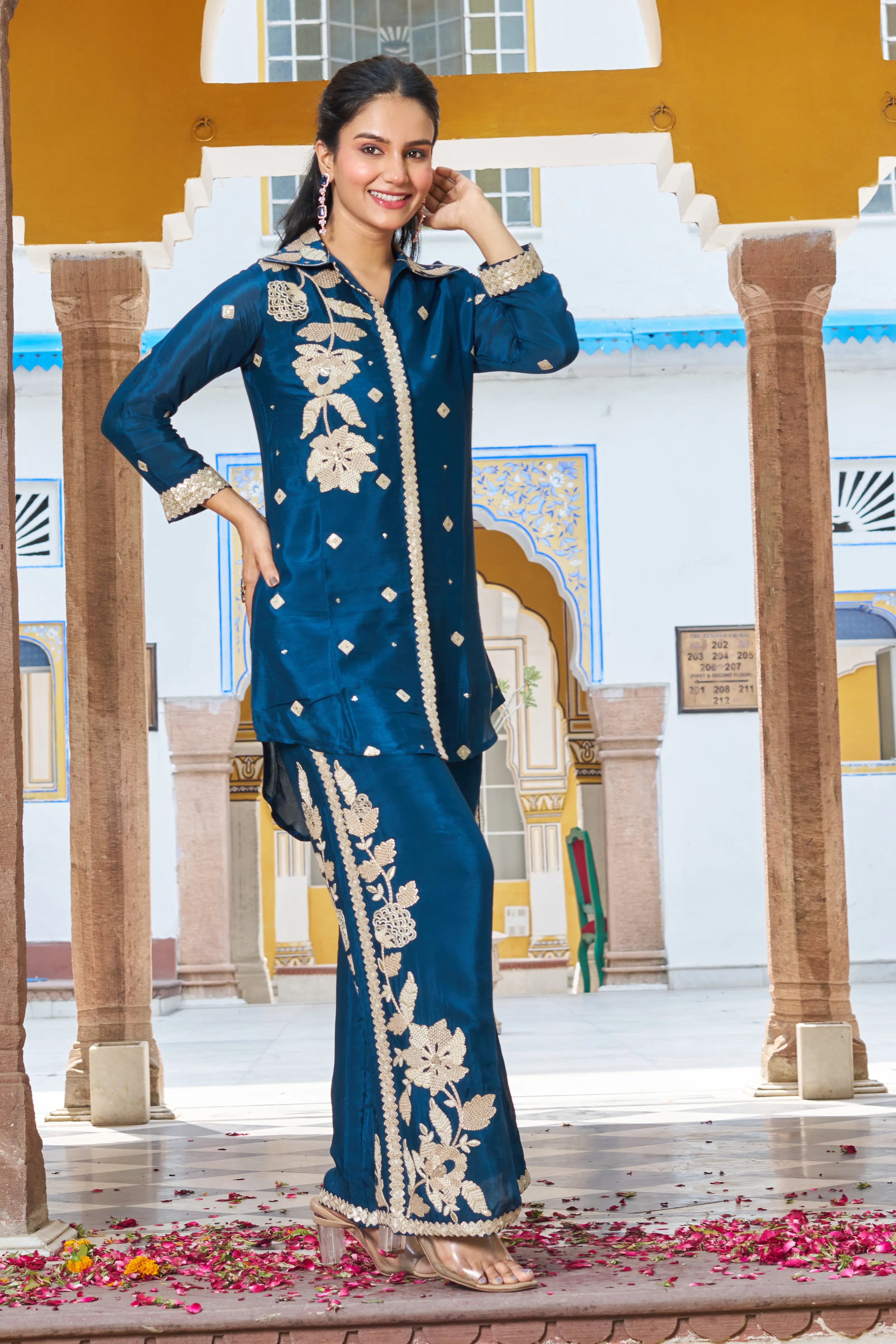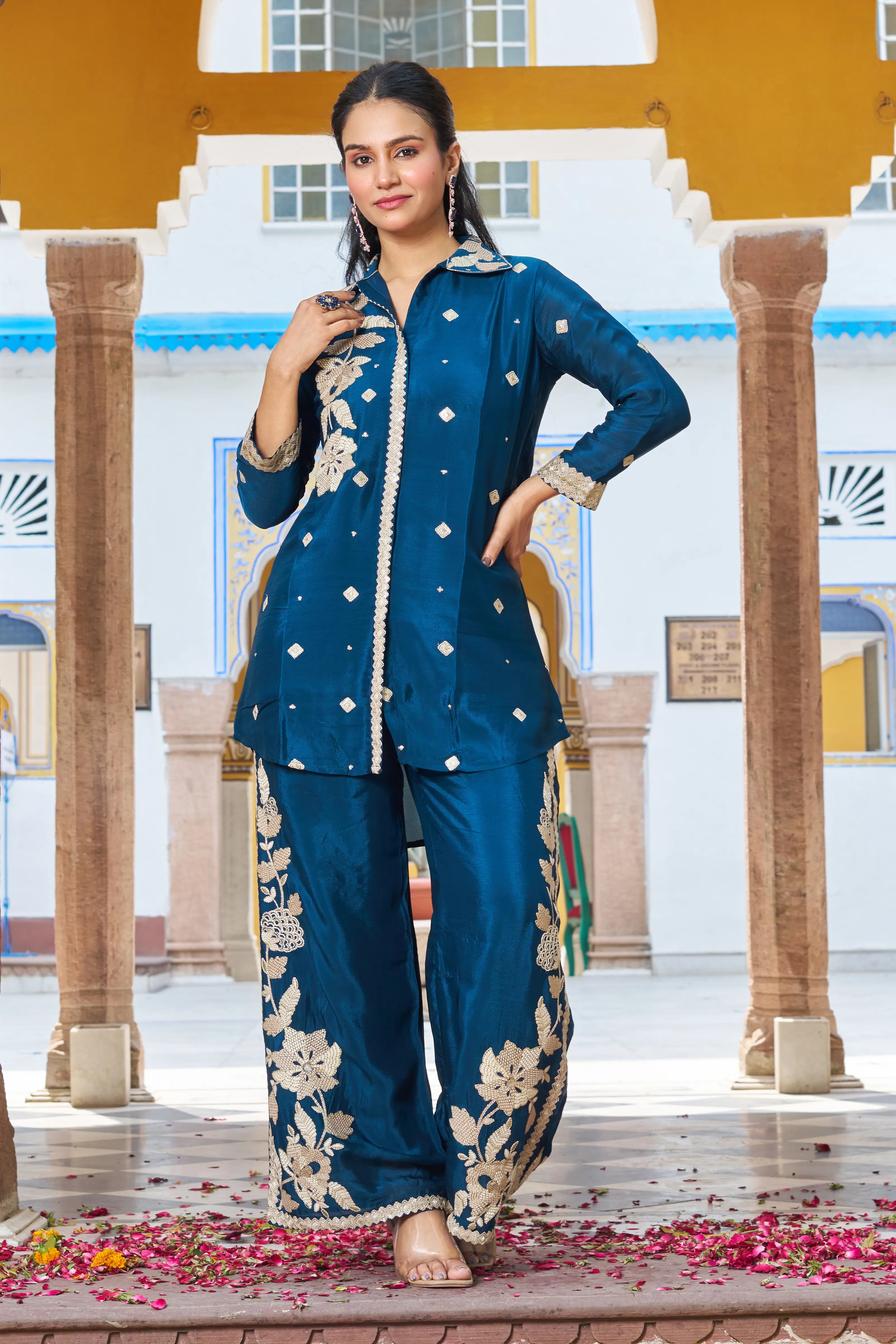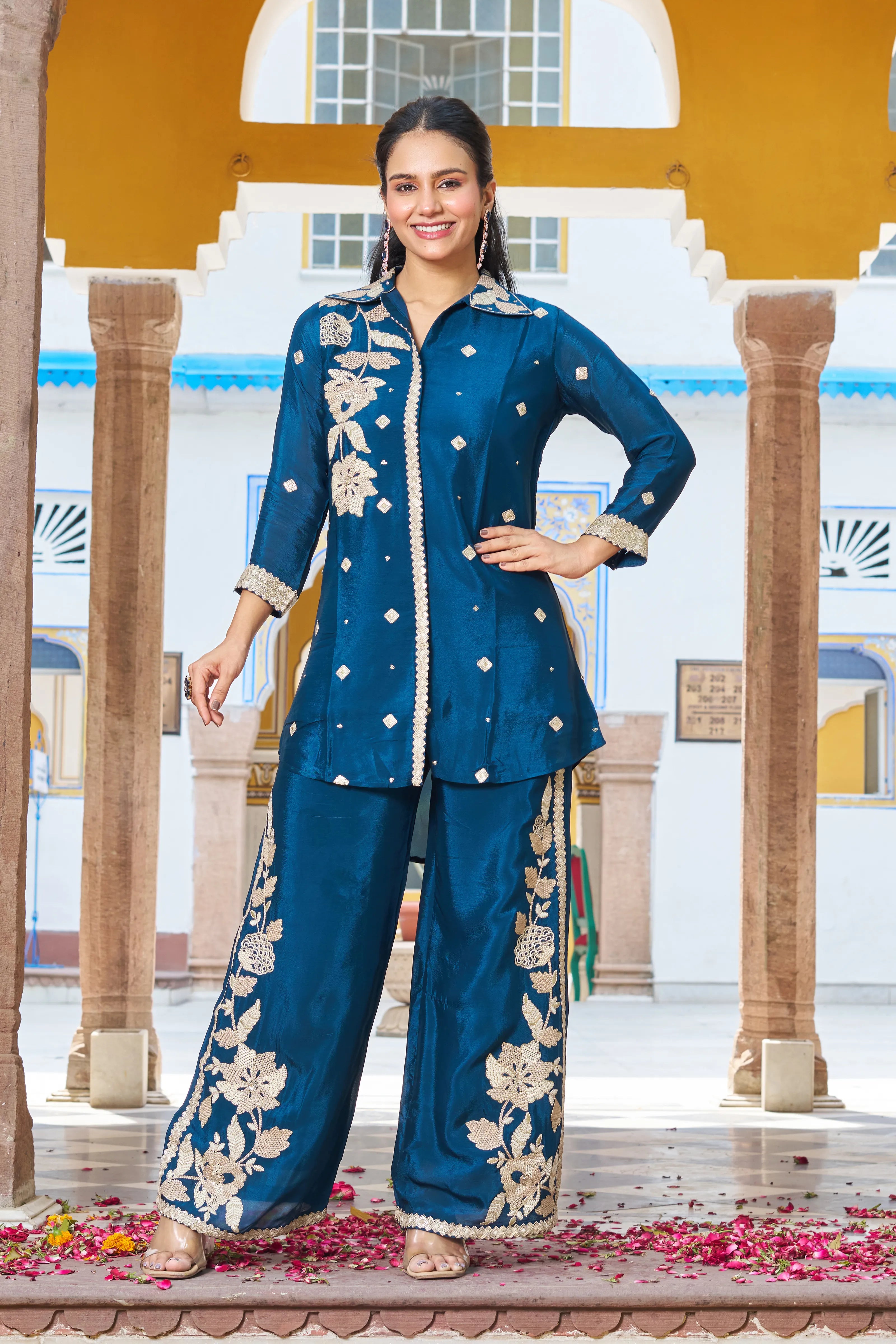 Regal Bloom: Peacock Blue Floral Embroidered Chinon Co-ord Set