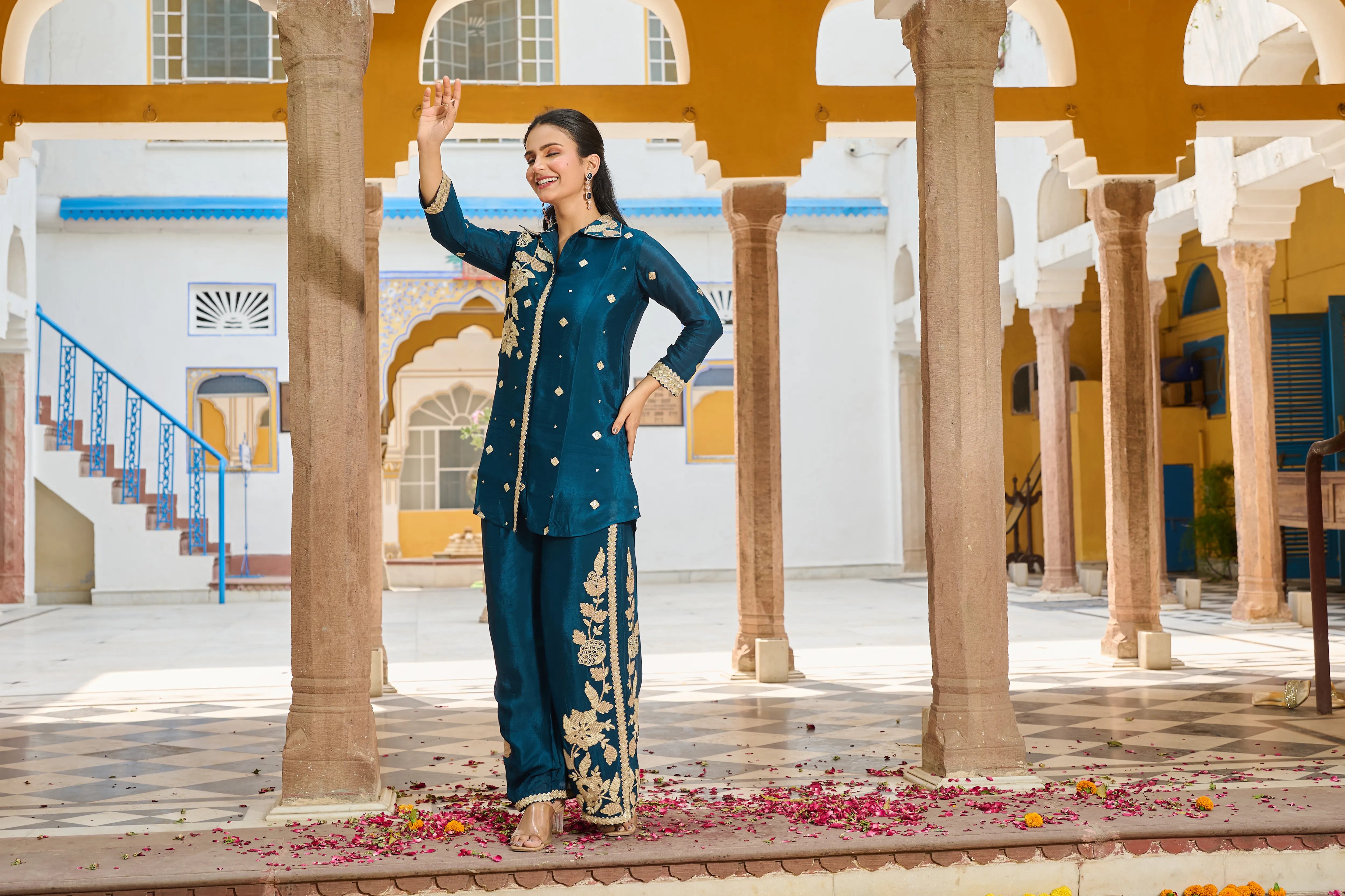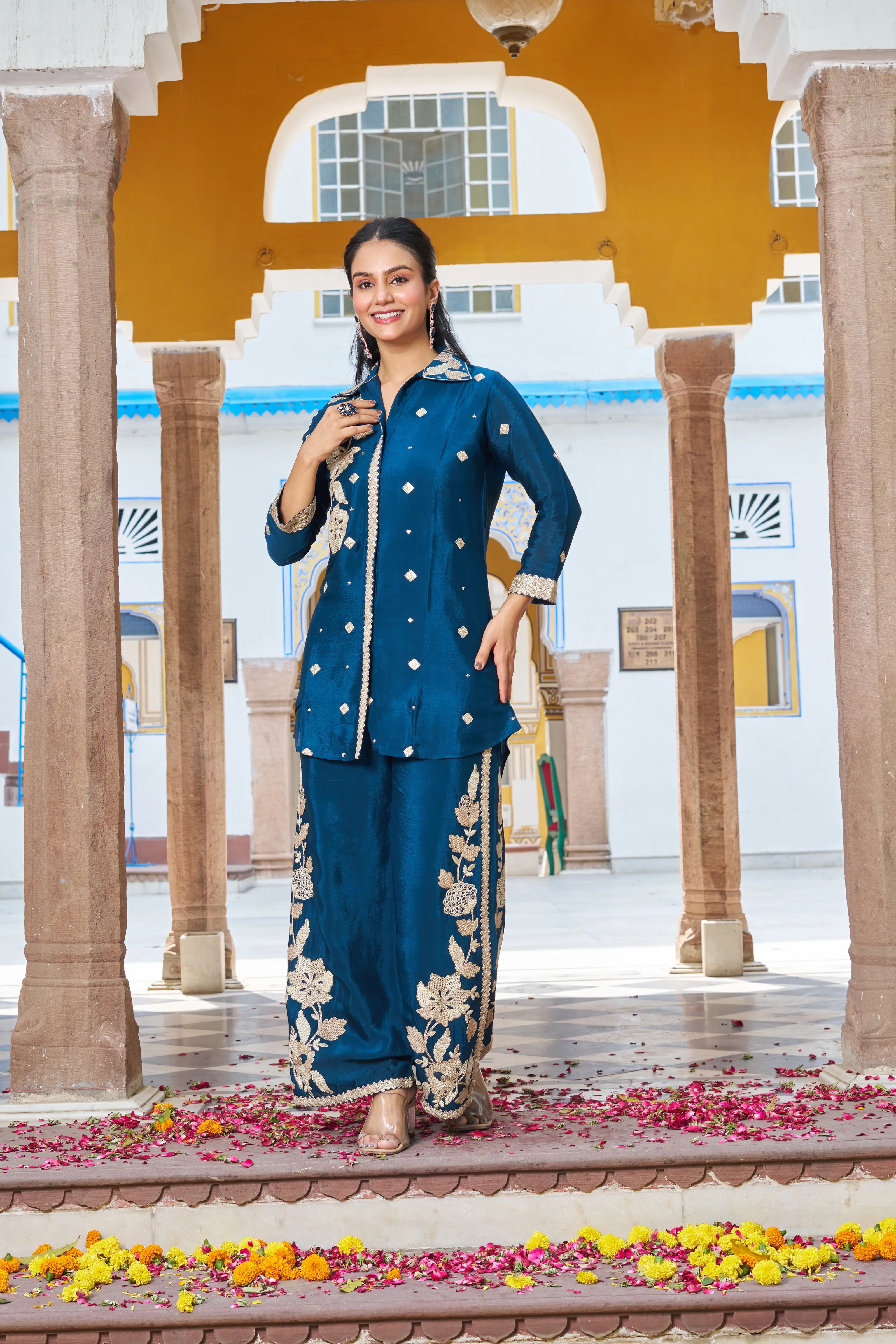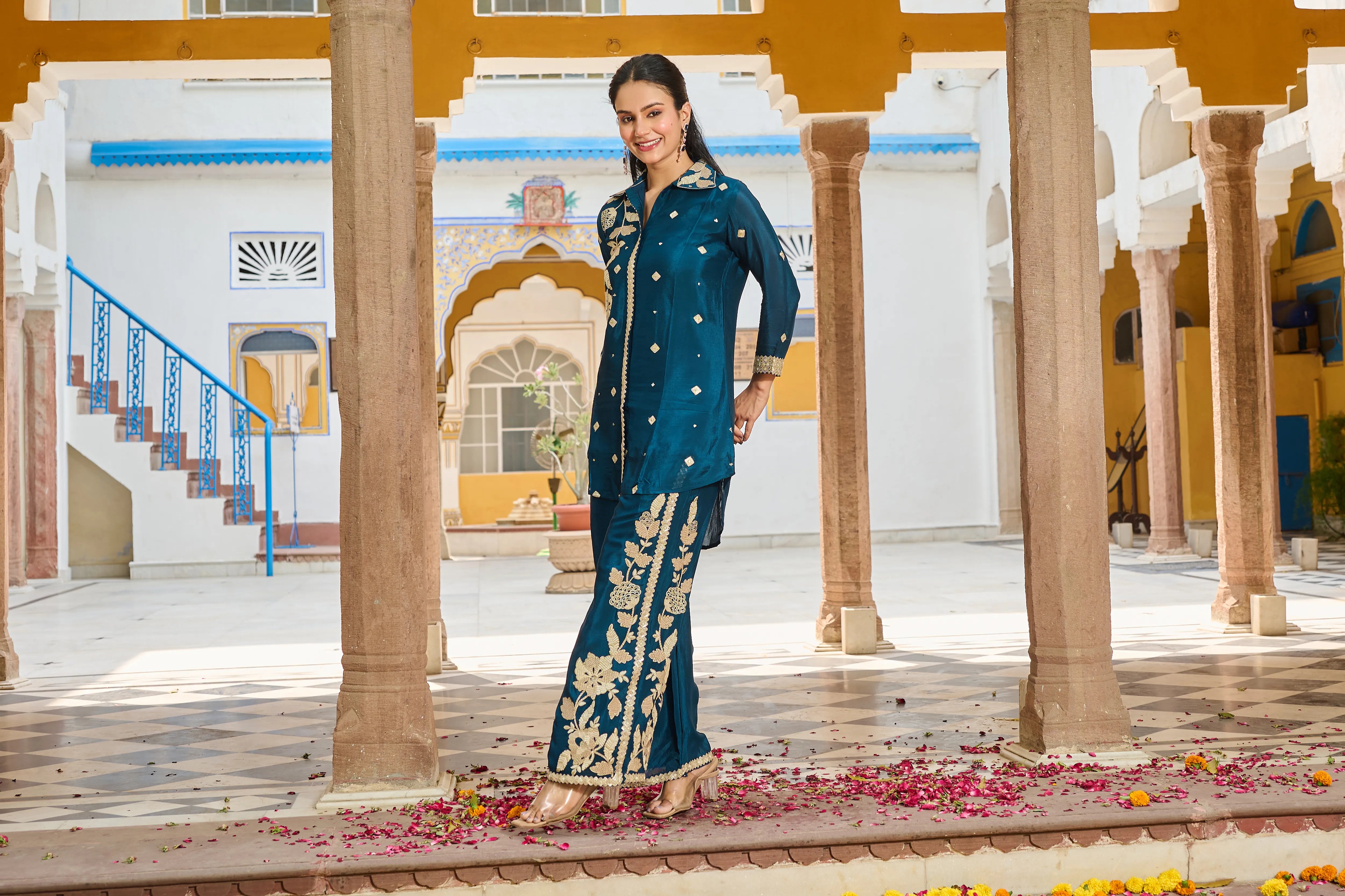 • Color: Deep peacock blue with antique gold embroidery and sequin highlights