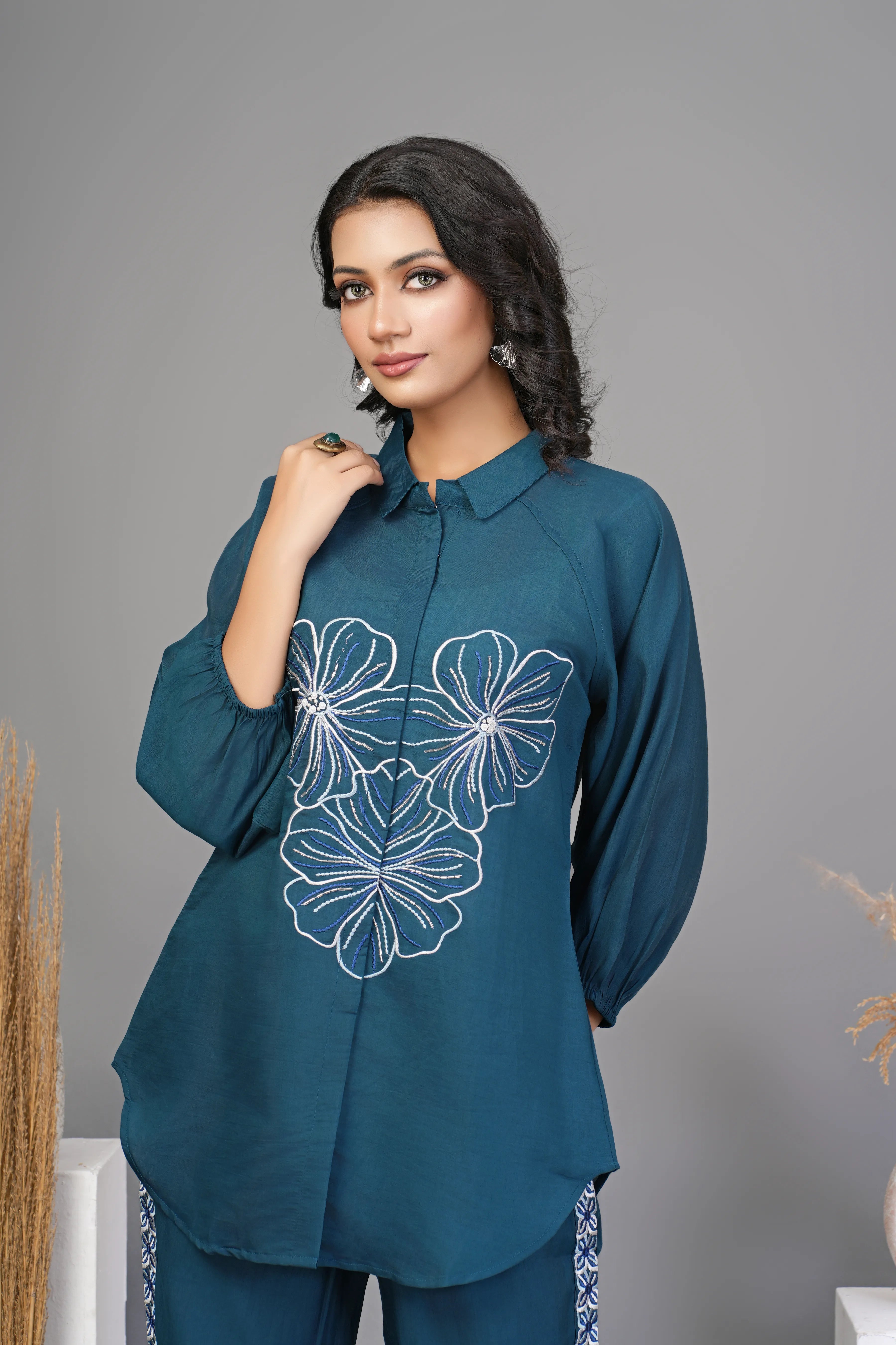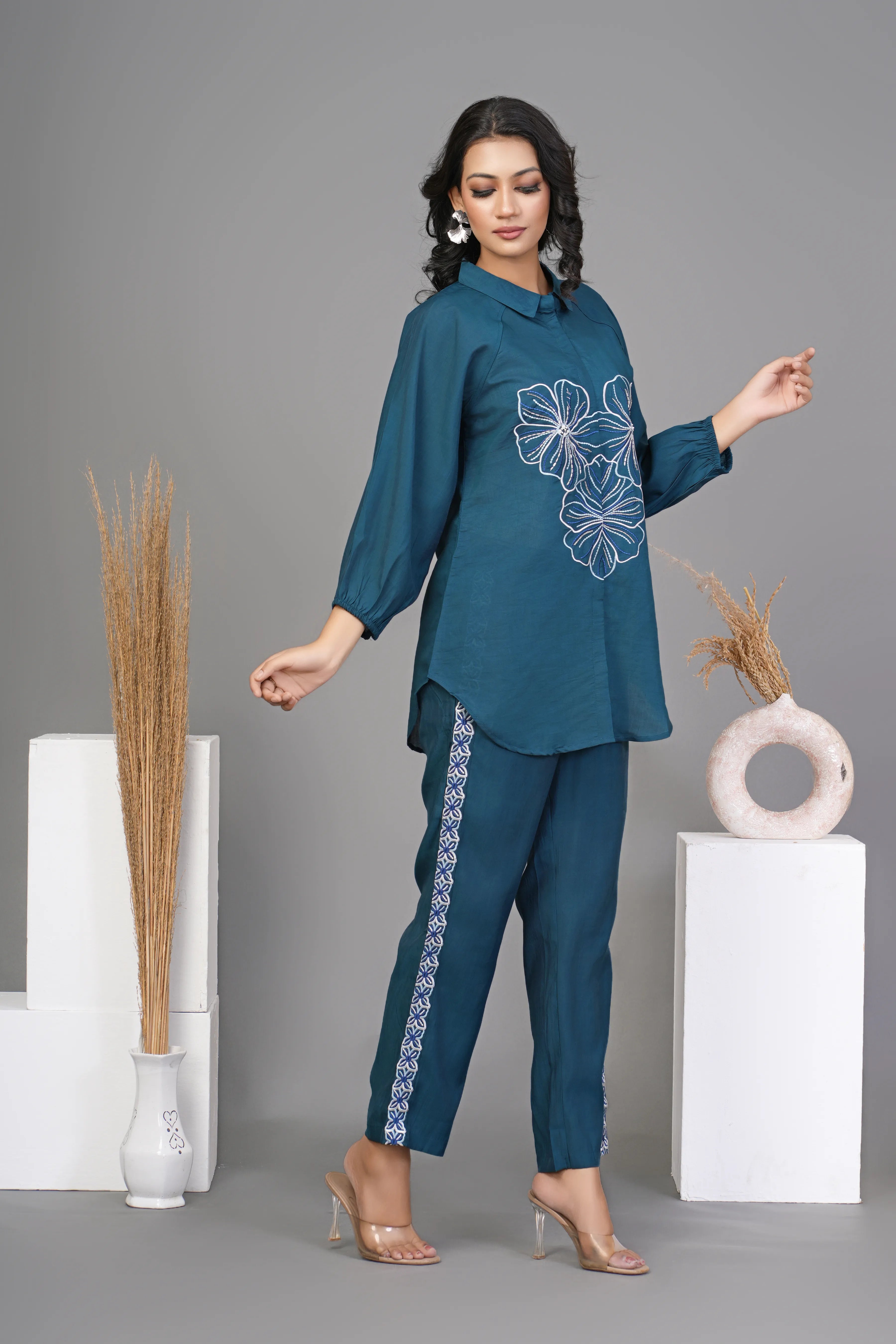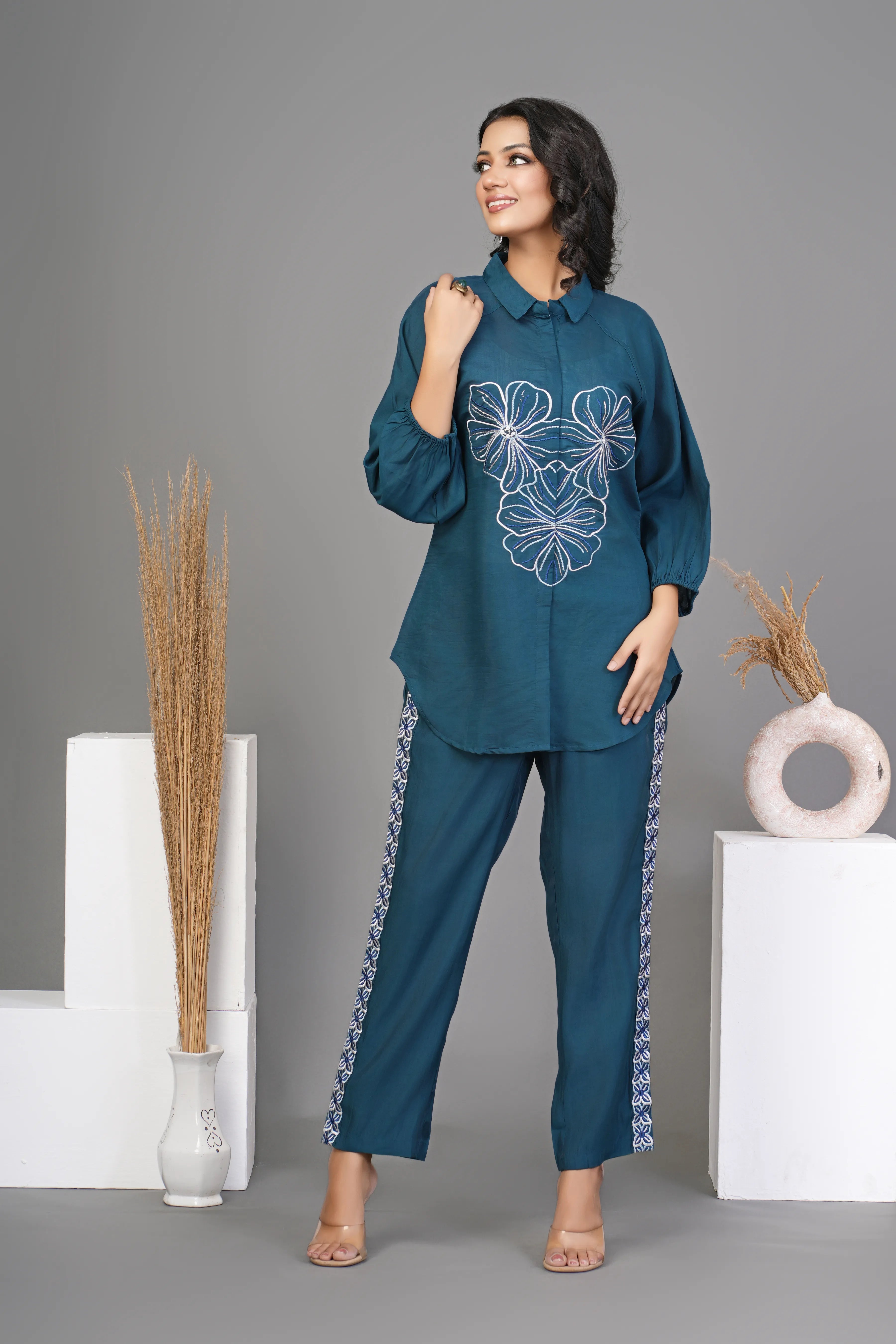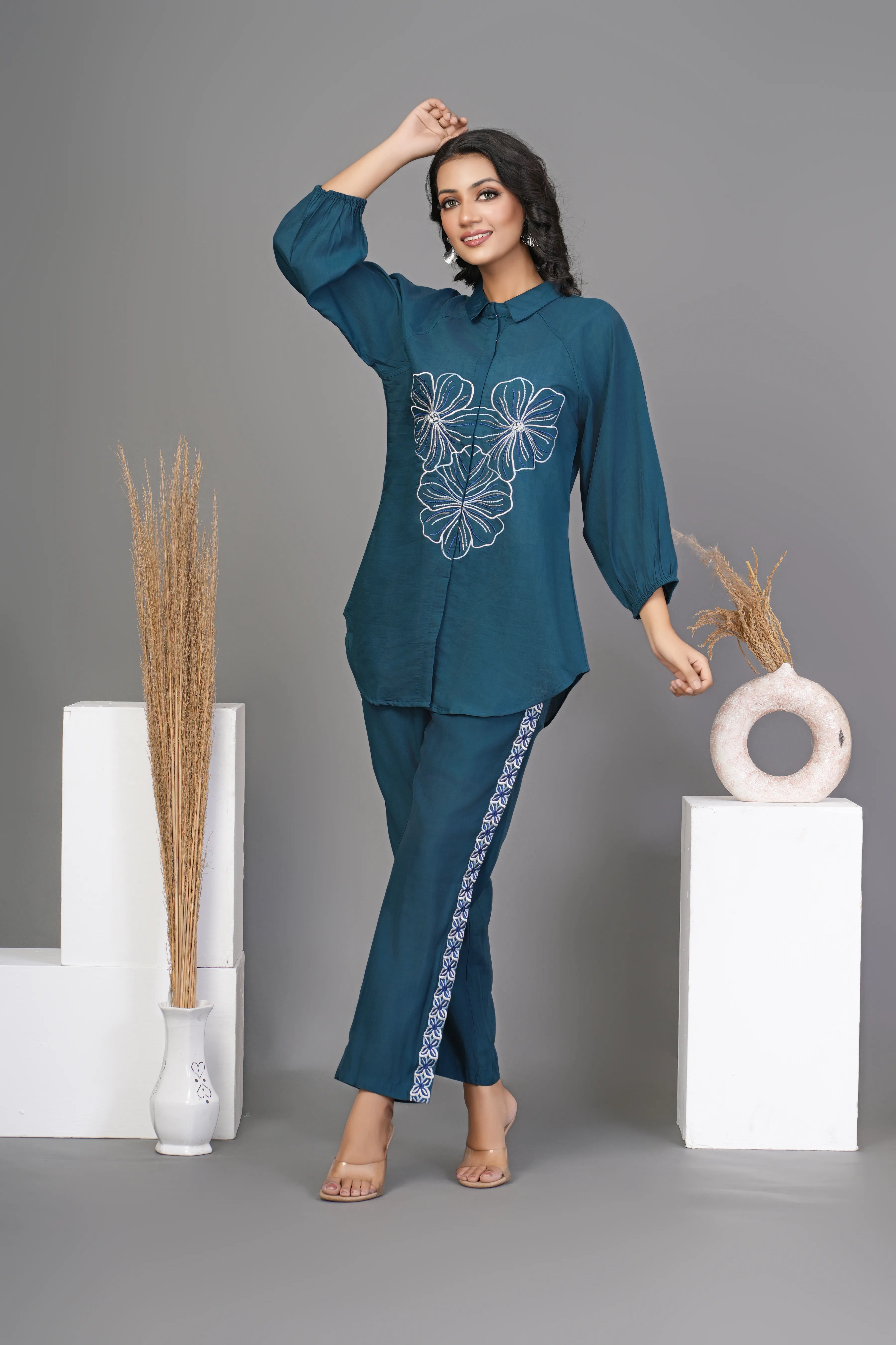 Step into sophistication with this Peacock Green Embroidered Shirt and Pant Set, a perfect blend of style and comfort. The viscose shirt features intricate floral embroidery, a refined shirt collar, and a concealed button placket, adding a touch of formality to its modern feminine design. Paired with matching embroidered viscose pants, this co-ord set offers a versatile and chic look for both casual and semi-formal occasions.