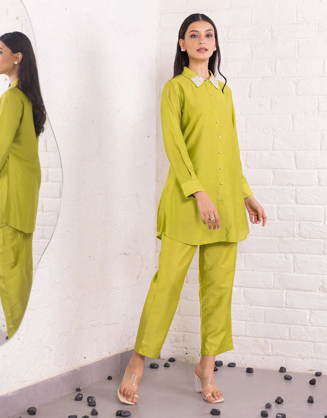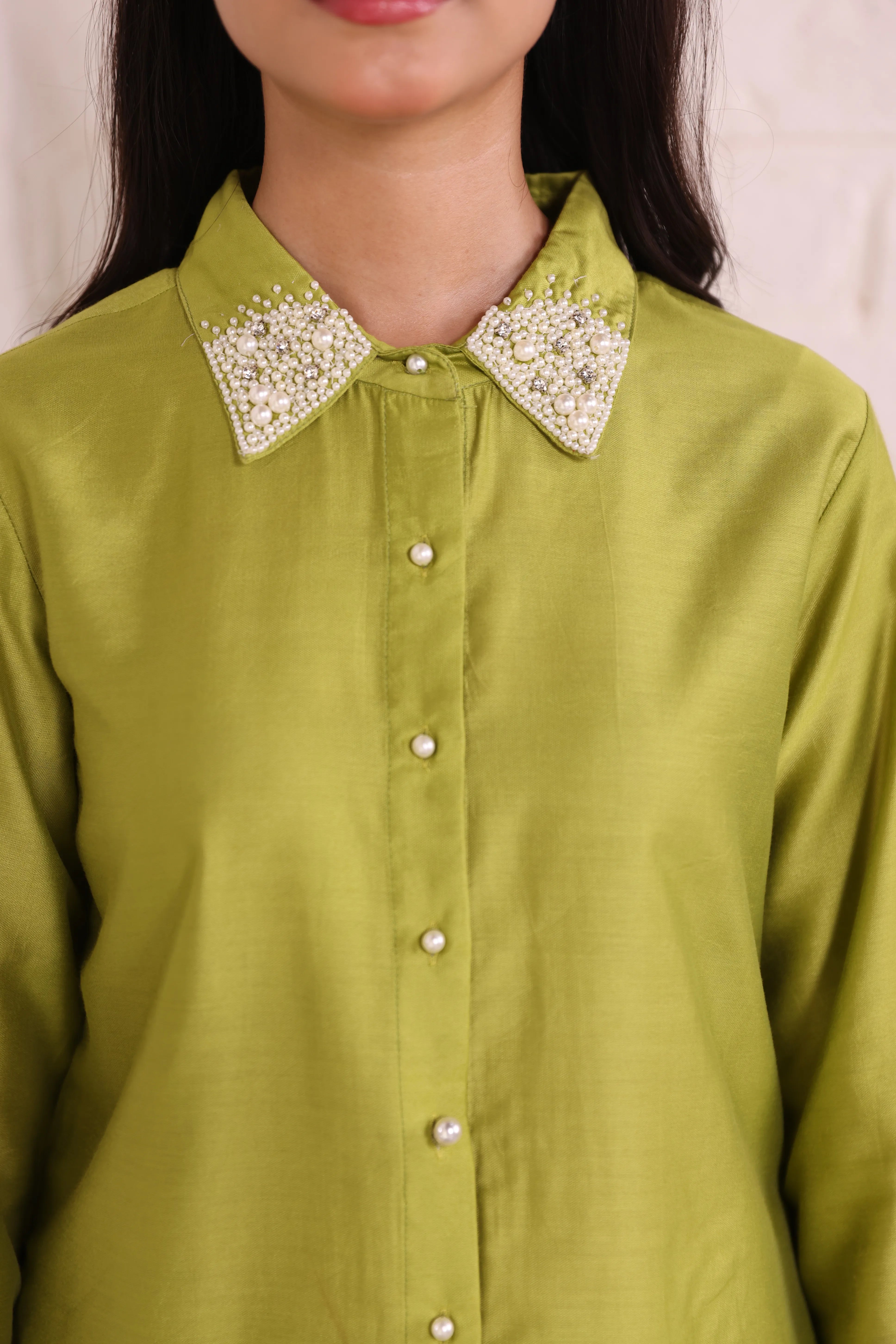 - Top: Shirt Collar, Relaxed Sleeves, Pearl Embellishments, Solid Parrot Green Color