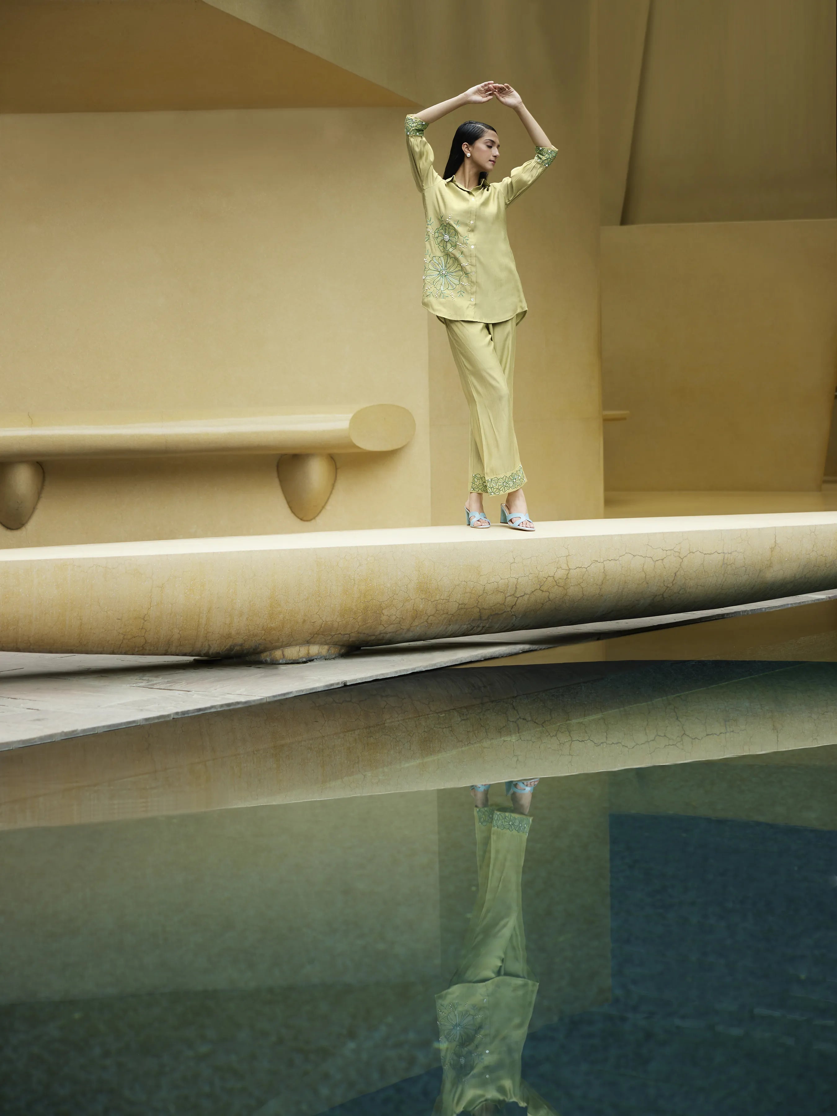 The Pista Green Embroidered Shirt with Pant by Kiaa offers a sophisticated yet comfortable design for everyday wear. The shirt features delicate appliqué and embroidered puff sleeves, and it is paired with straight pants for a balanced, stylish look.