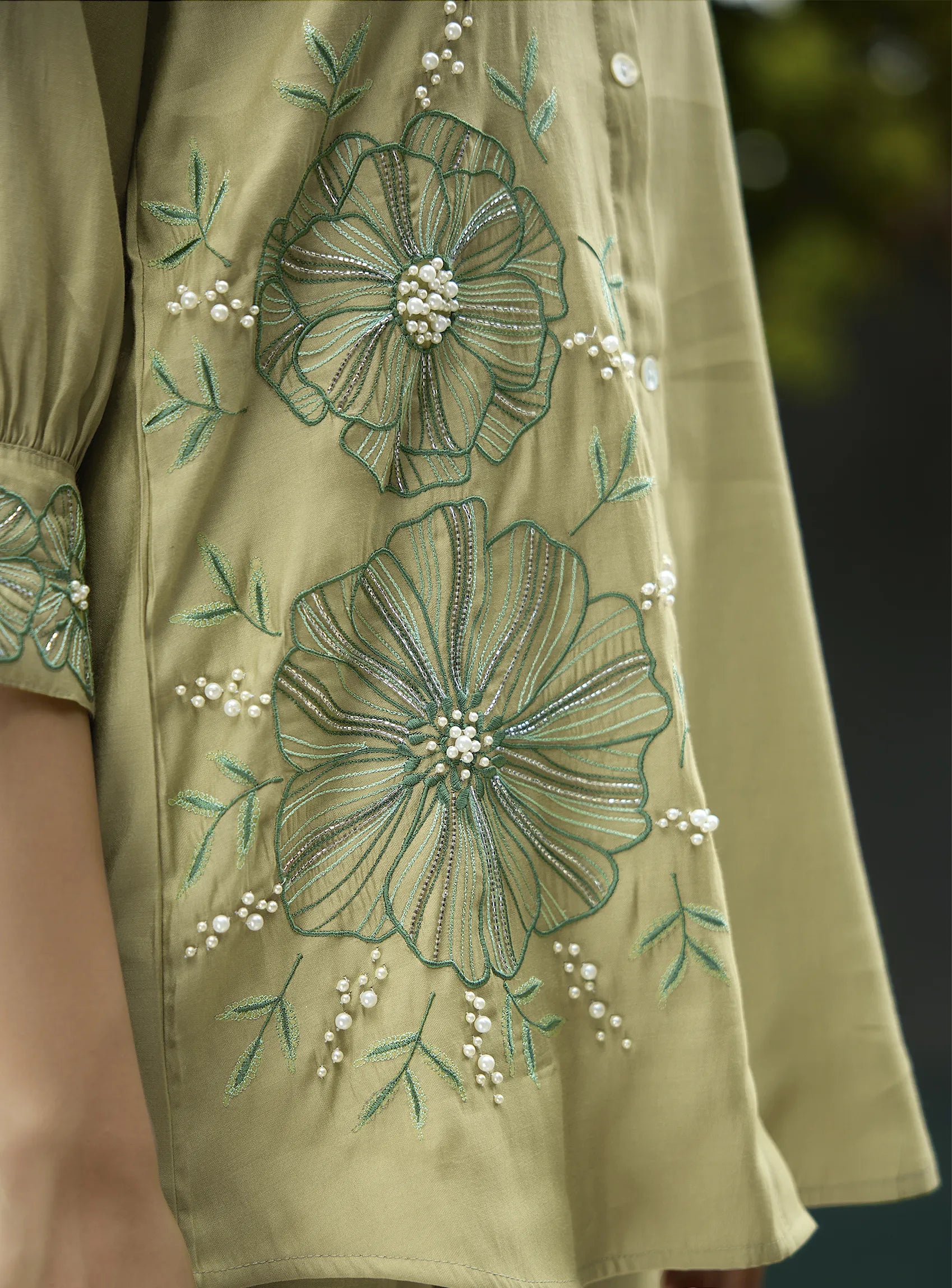 - Shirt: Pista Green with Appliqué and Embroidered Puff Sleeves, 3/4th Relaxed Sleeves