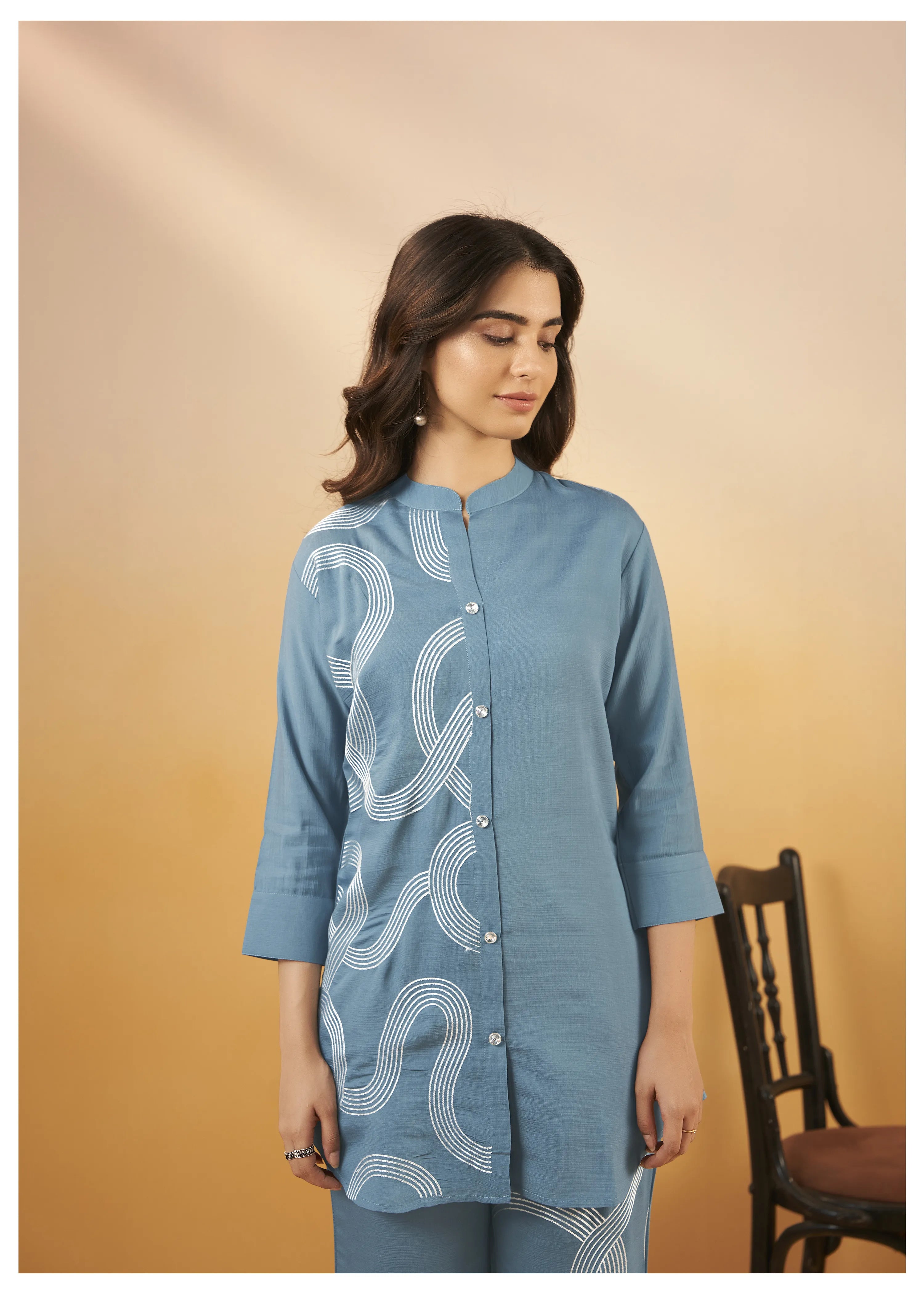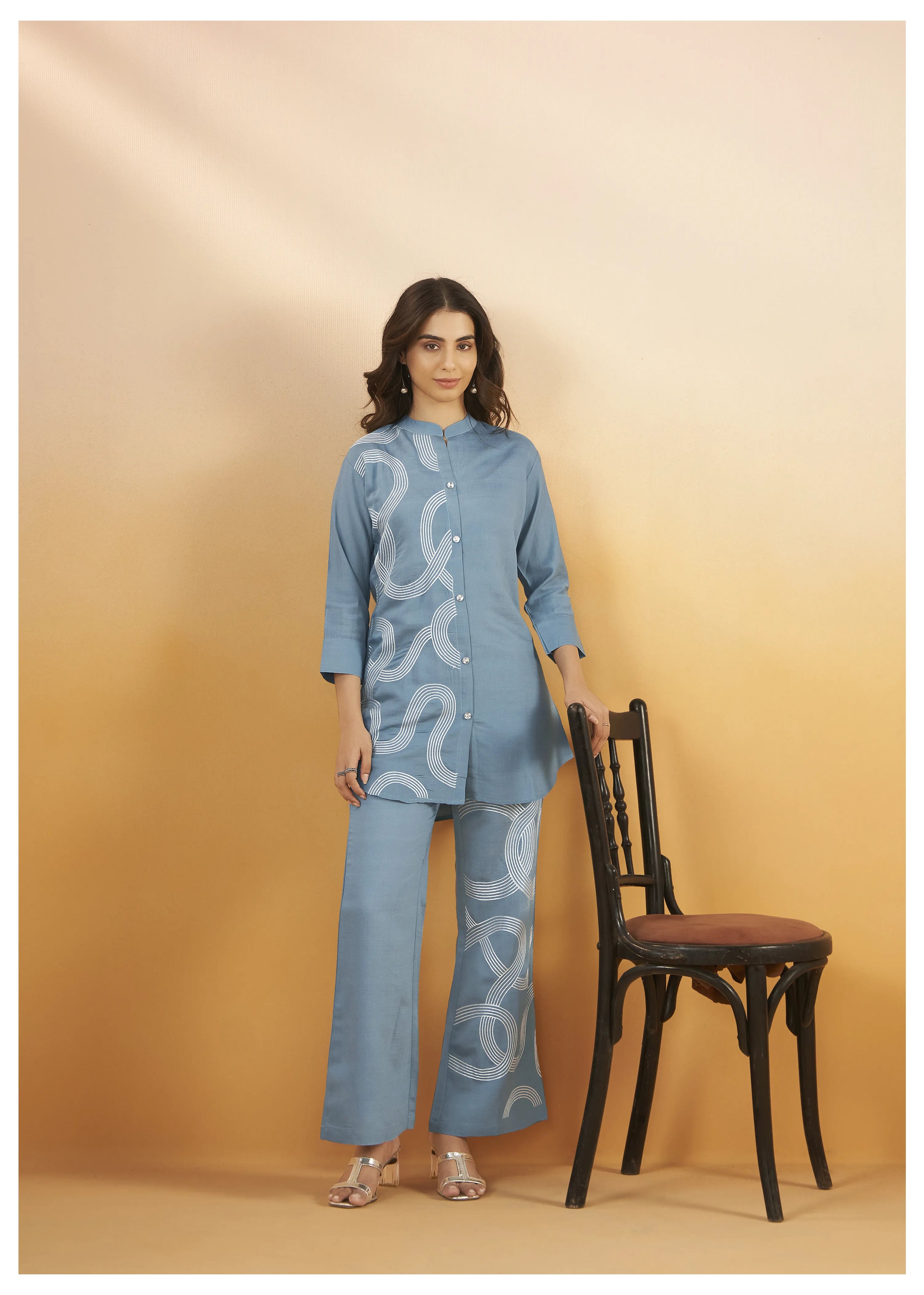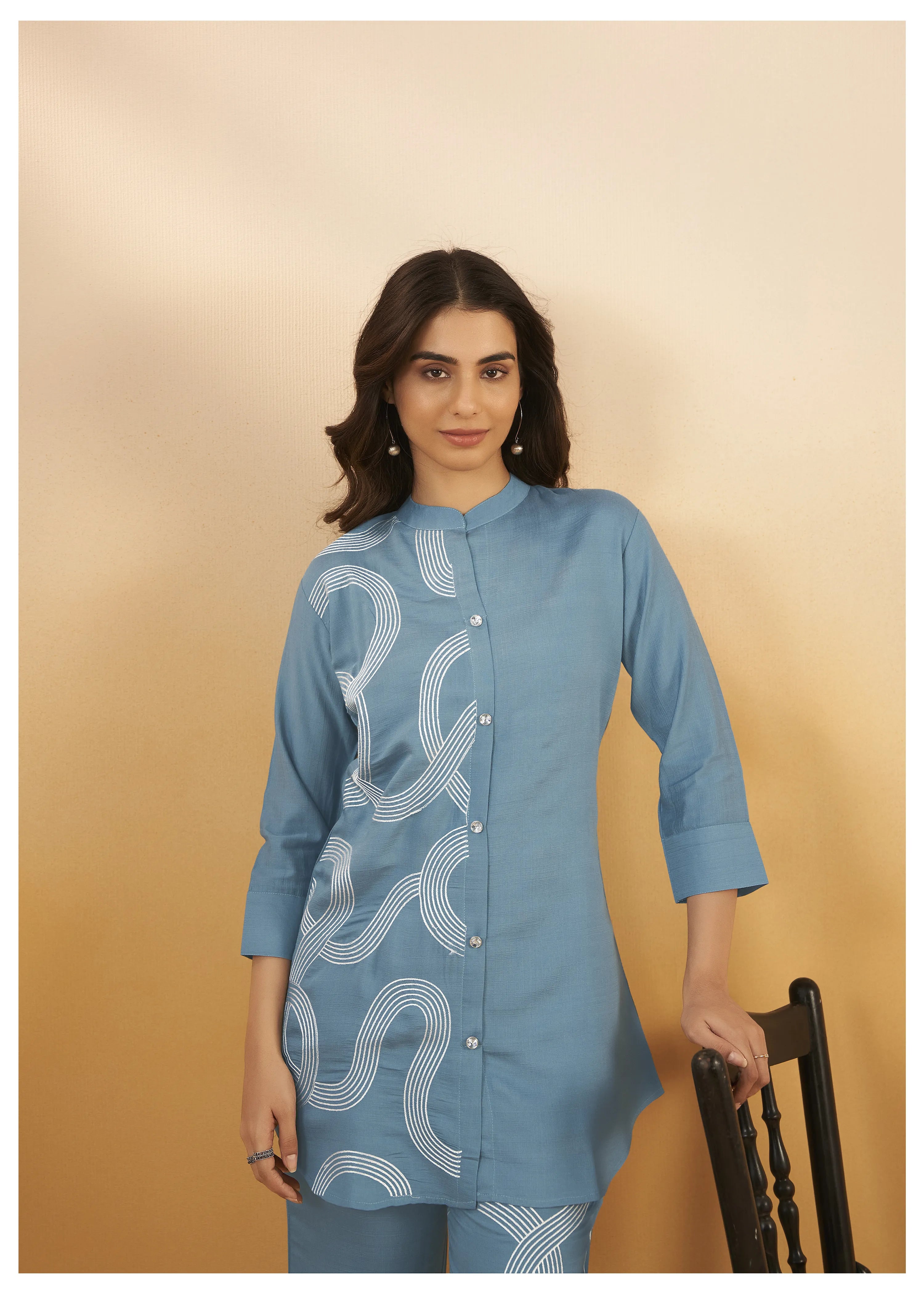 Step into effortless sophistication with this enchanting powder blue co-ord set, crafted from soft and luxurious viscose silk. Adorned with delicate white thread embroidery, this ensemble exudes refined elegance and charm. The diamond button-front detailing adds a touch of polish, making it the perfect choice for elegant gatherings, festive occasions, or daytime soirées.
