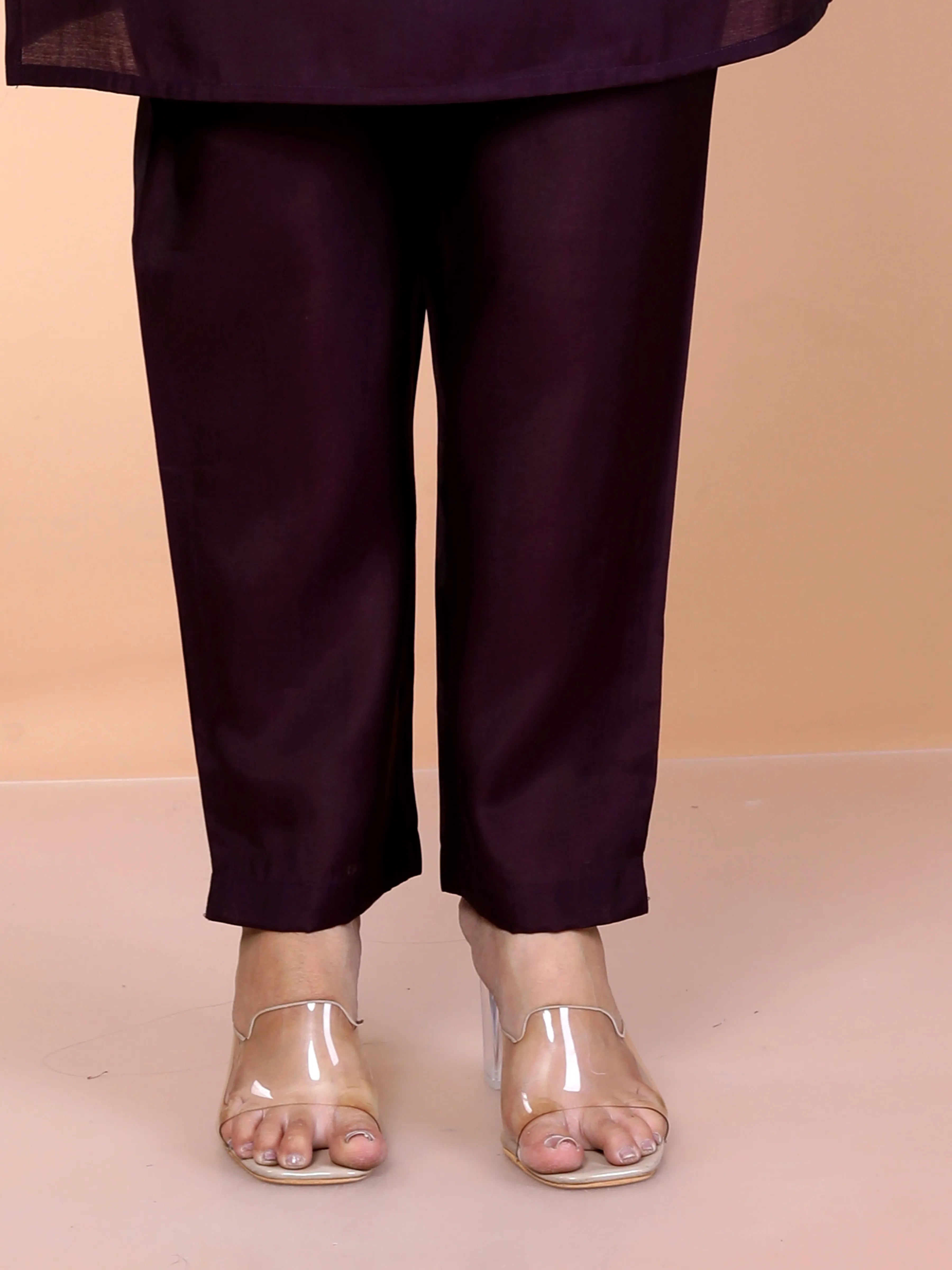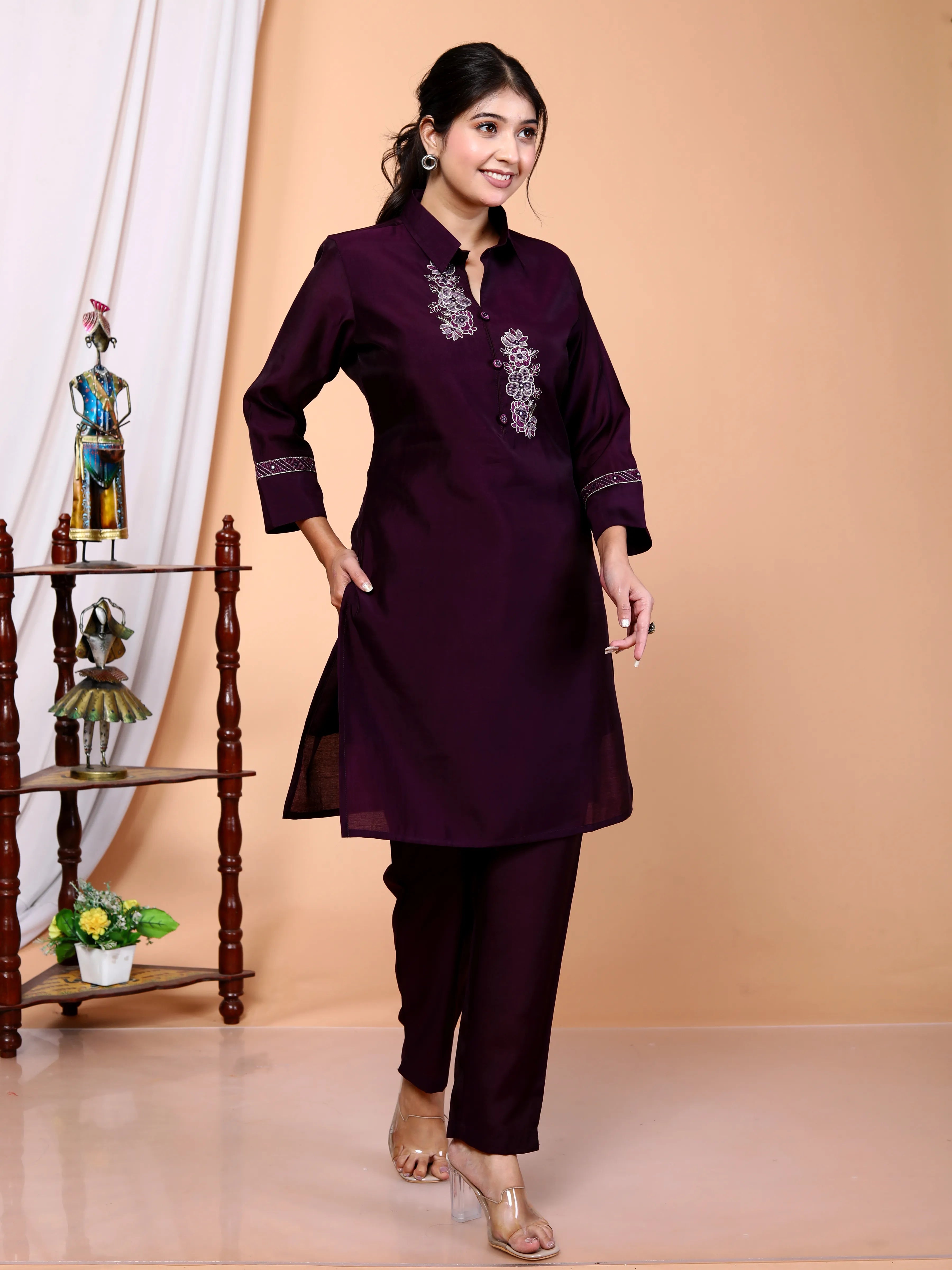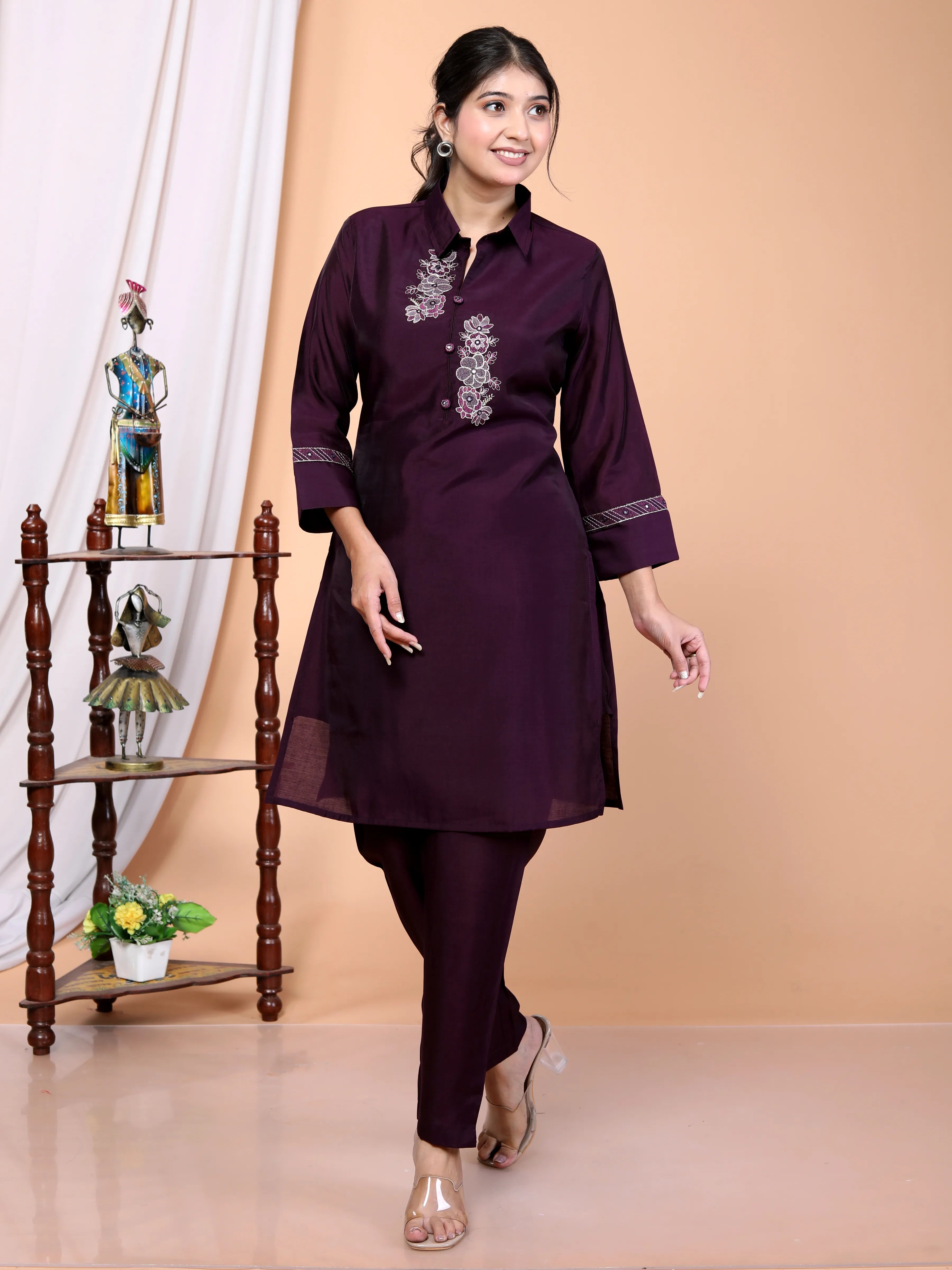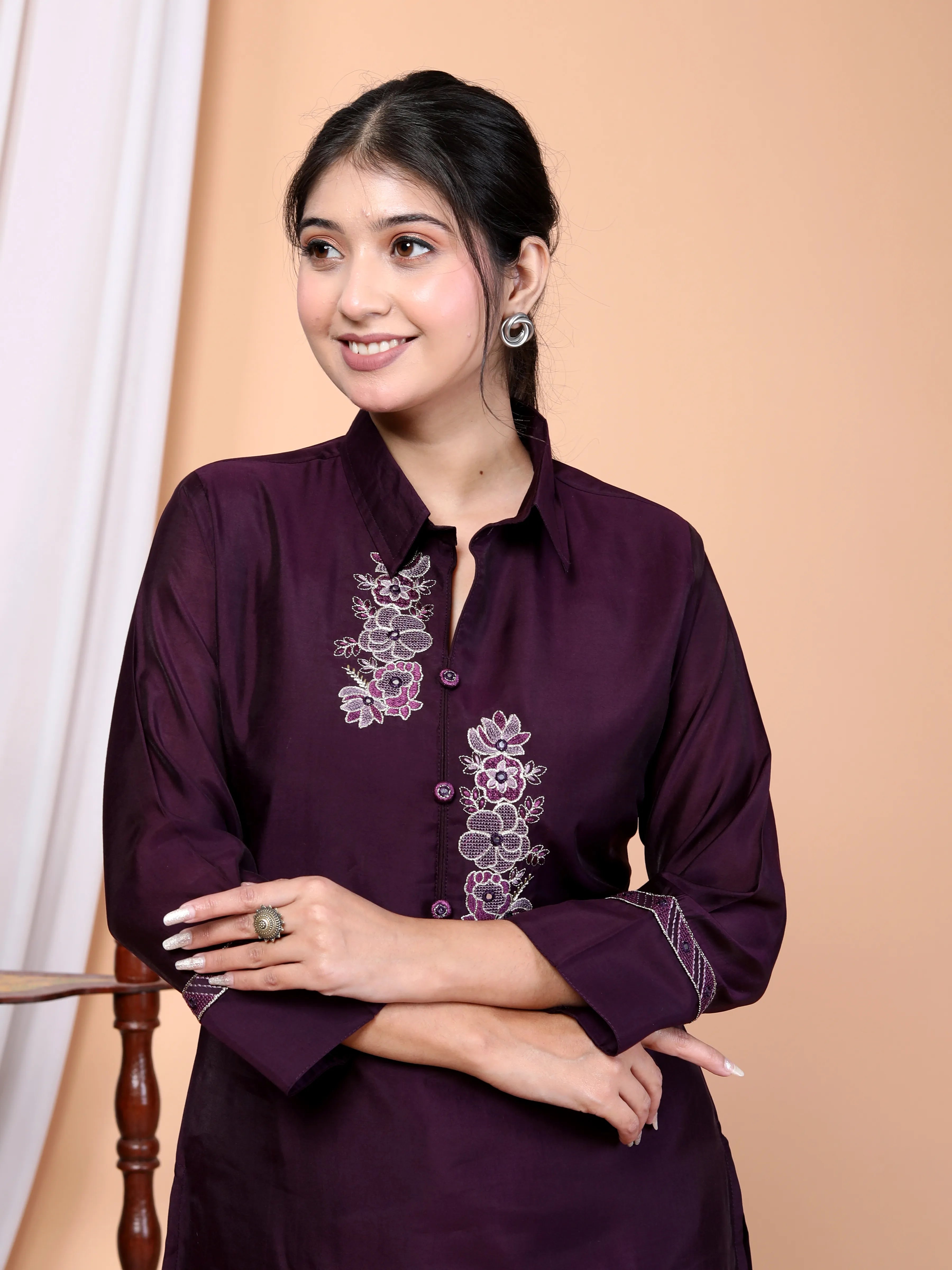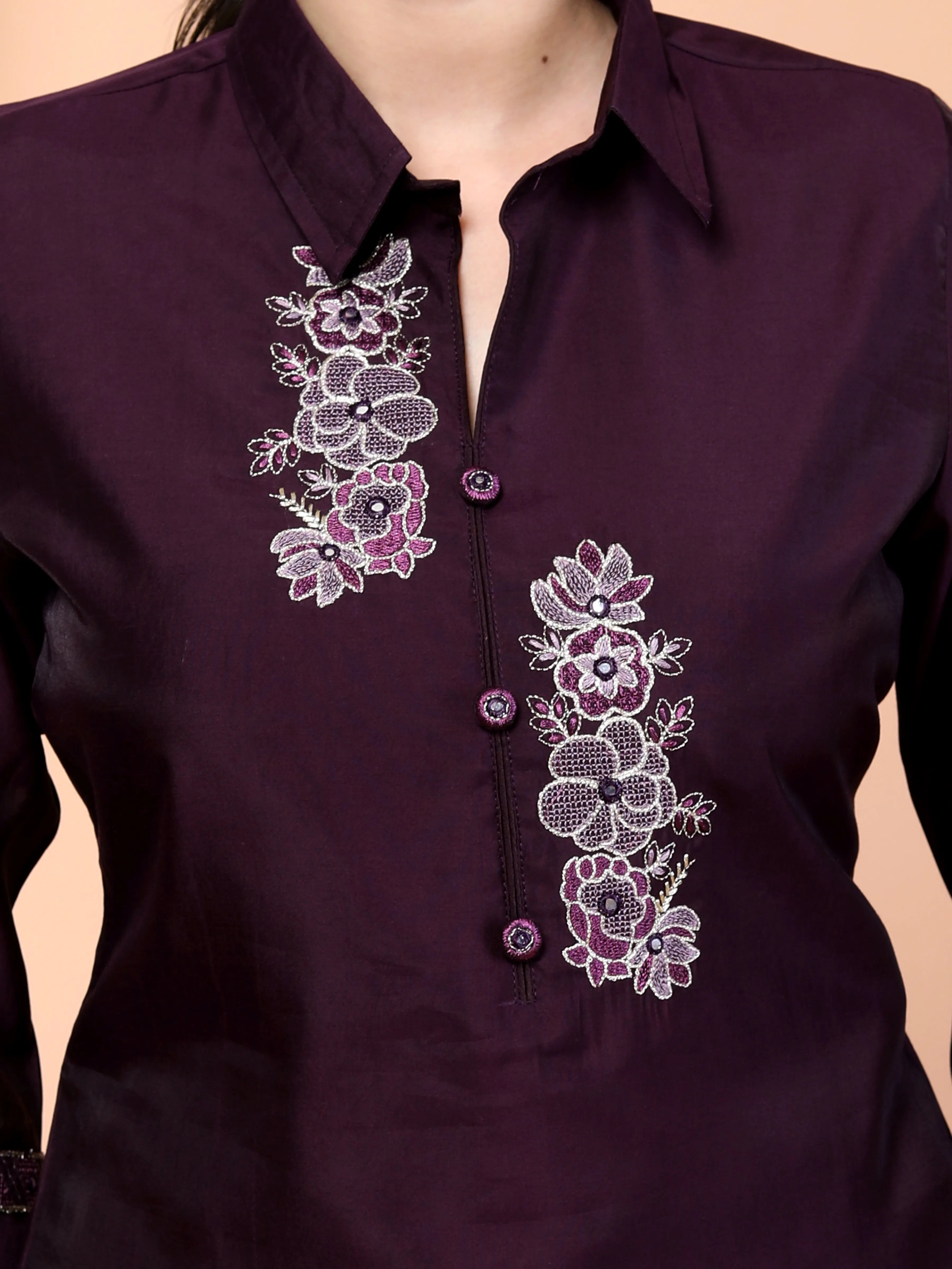 Elevate your style with this stunning Purple Embroidered Roman Silk Co-Ord Set, designed with a solid mulberry base. The button-front shirt is beautifully adorned with cream and purple thread placement embroidery, adding a unique touch of sophistication. Paired with straight pants, this luxurious set crafted from Roman silk offers both elegance and comfort, making it perfect for any occasion.