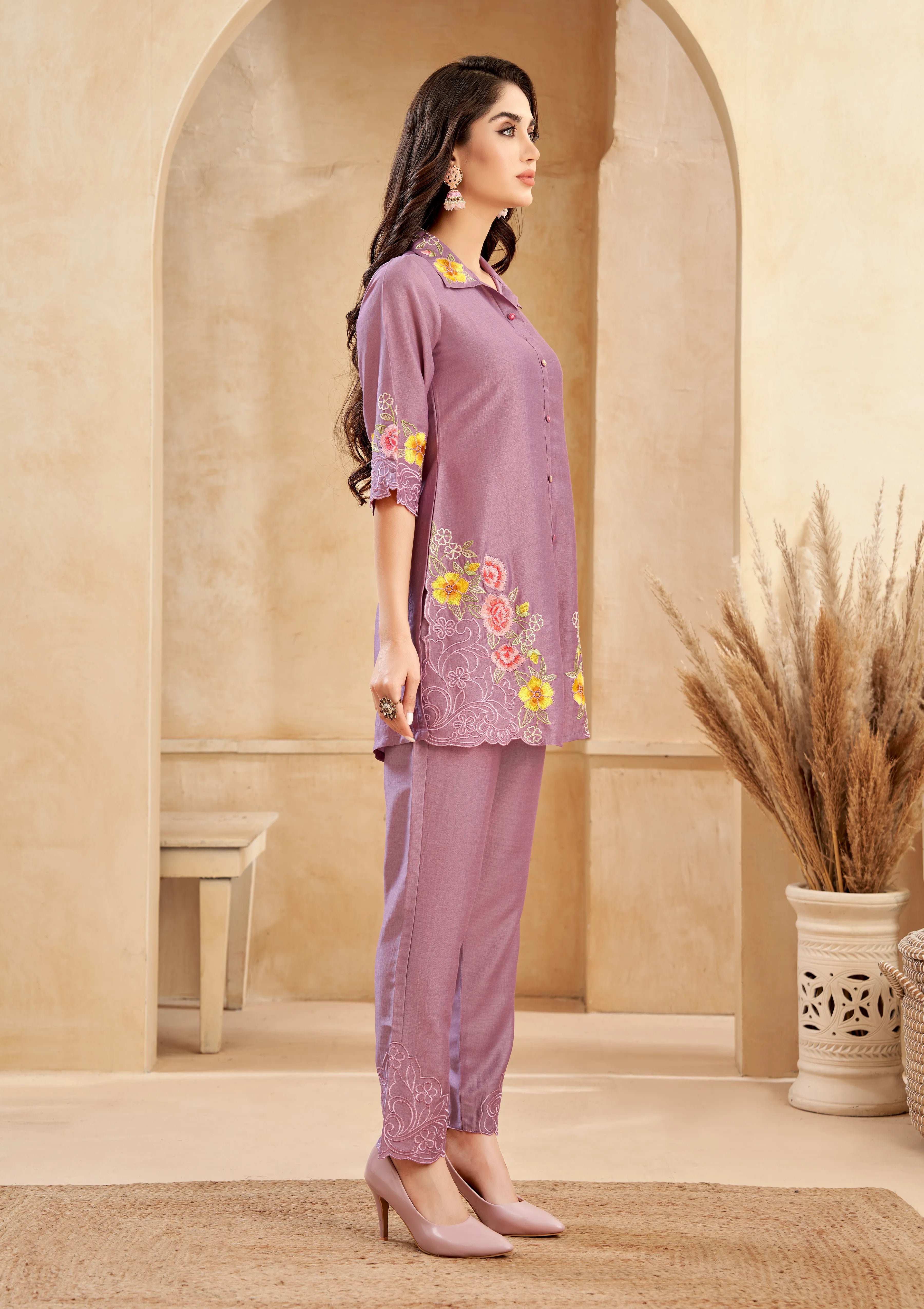 Purple Roman Silk Floral Embroidered Co-Ord Set