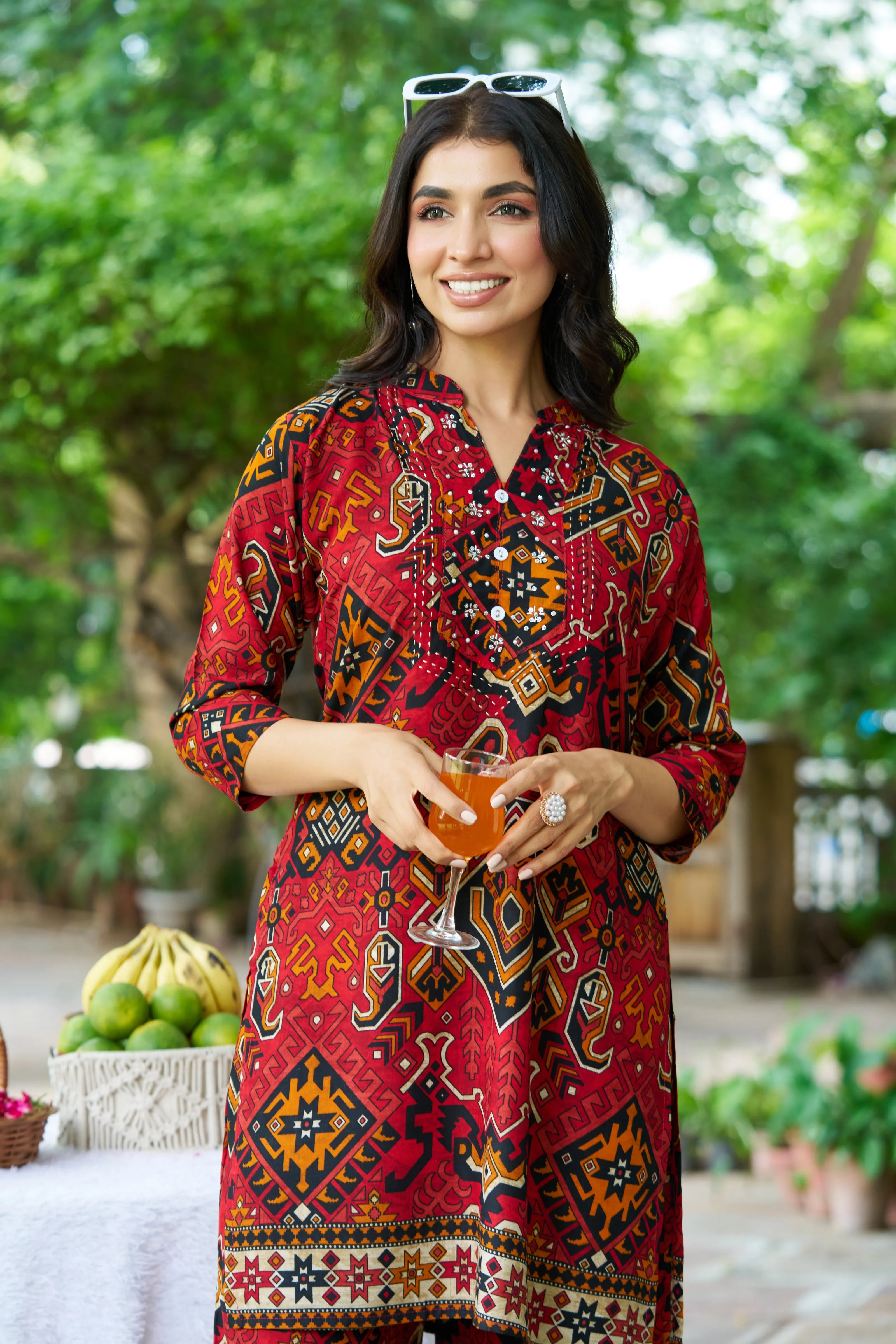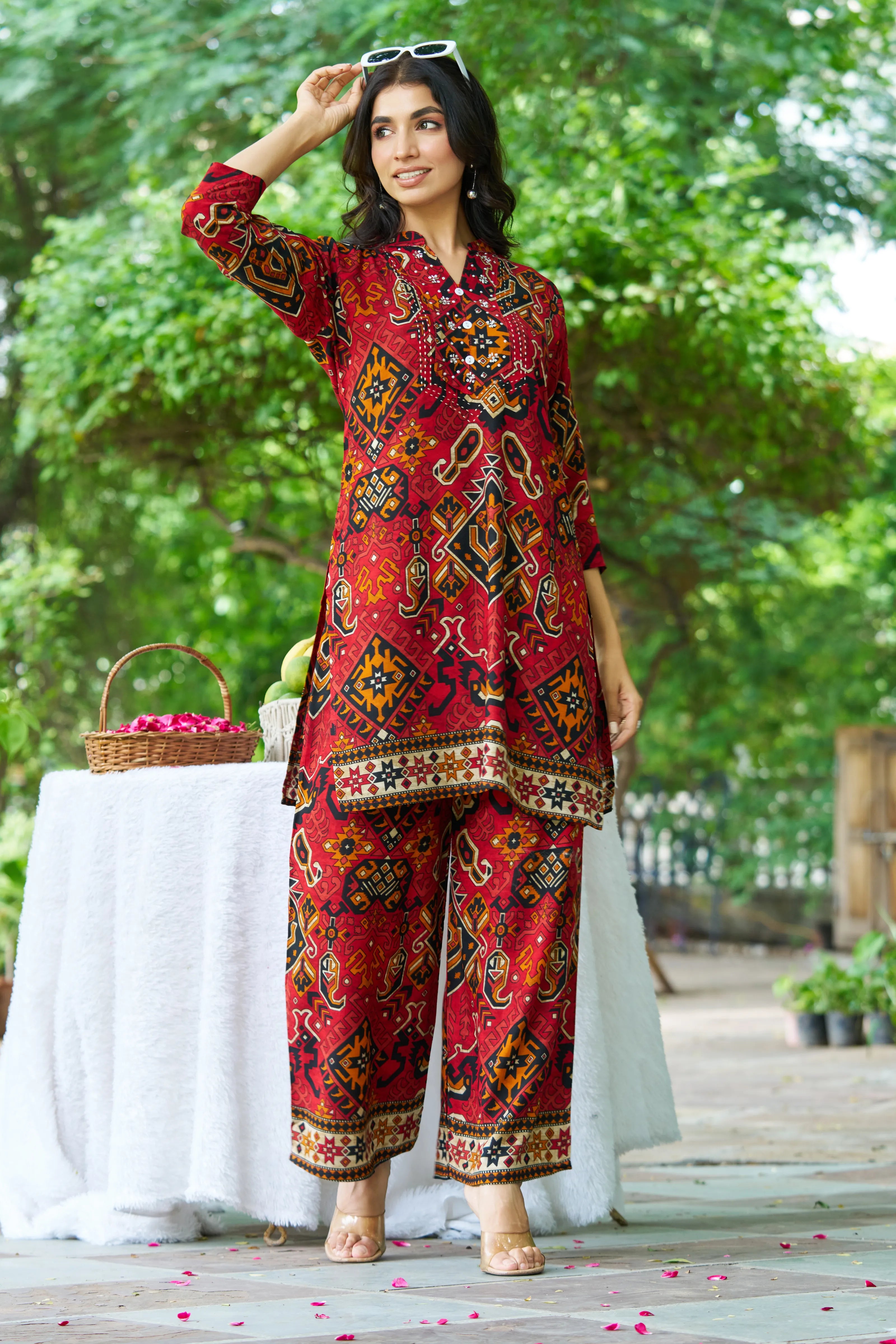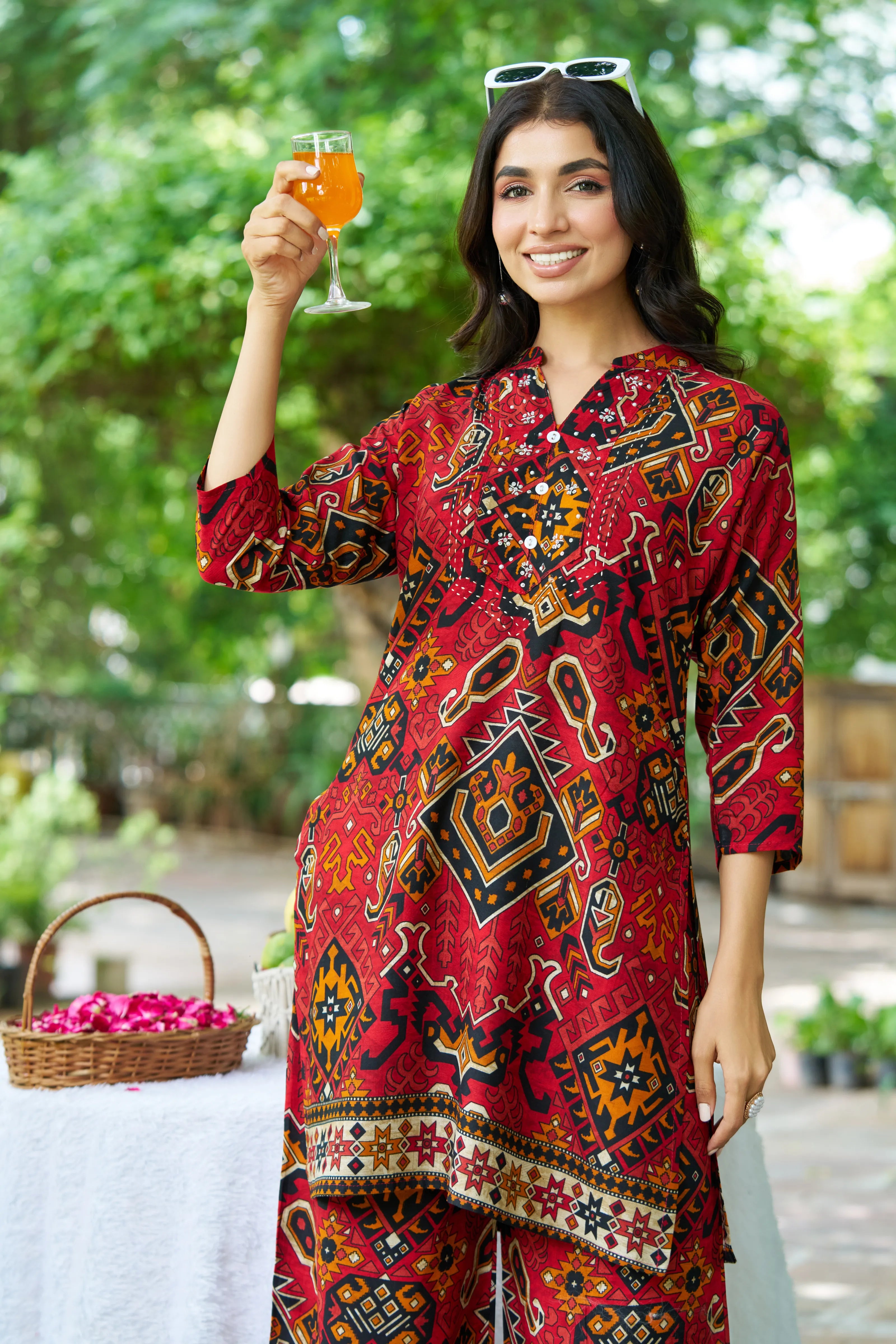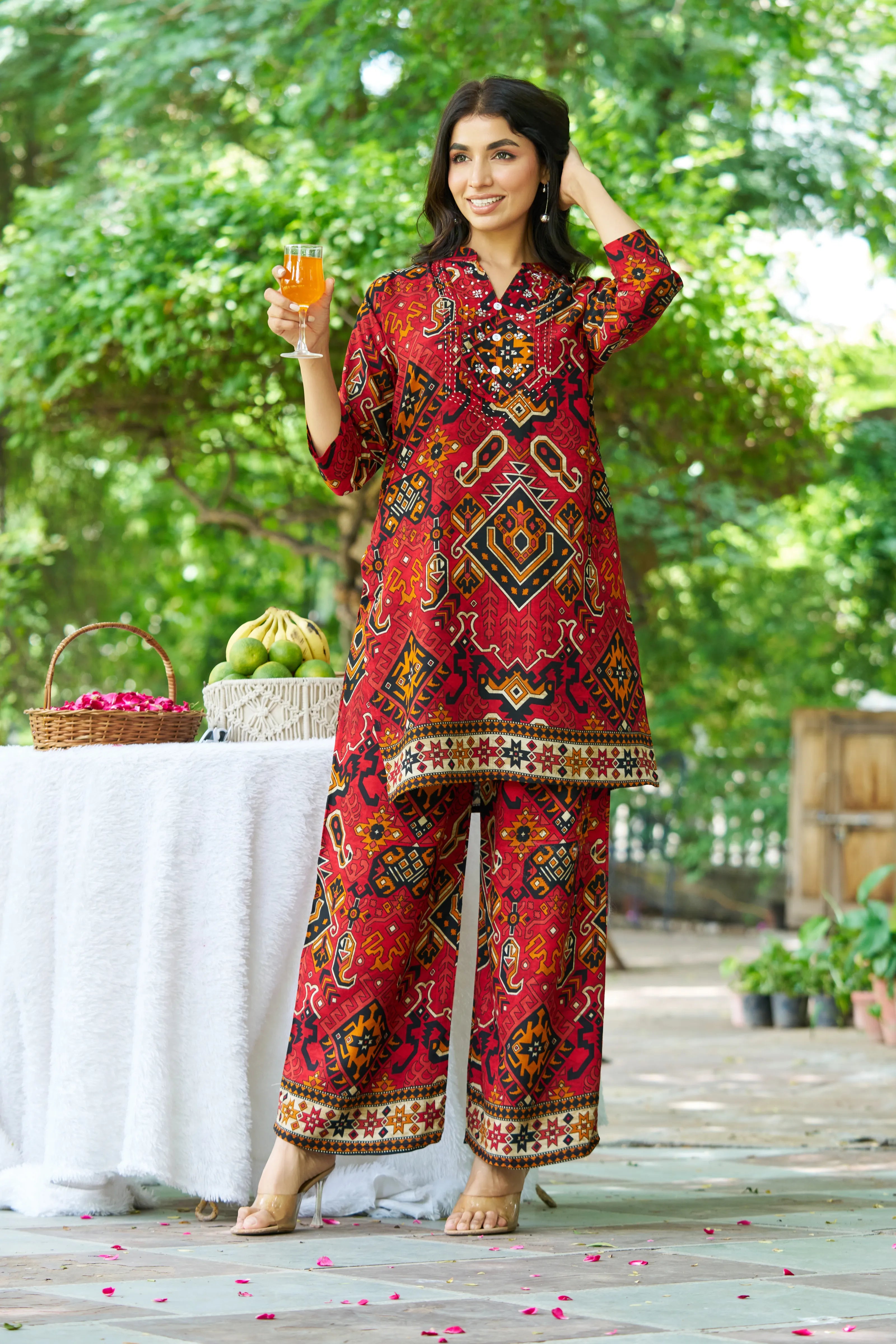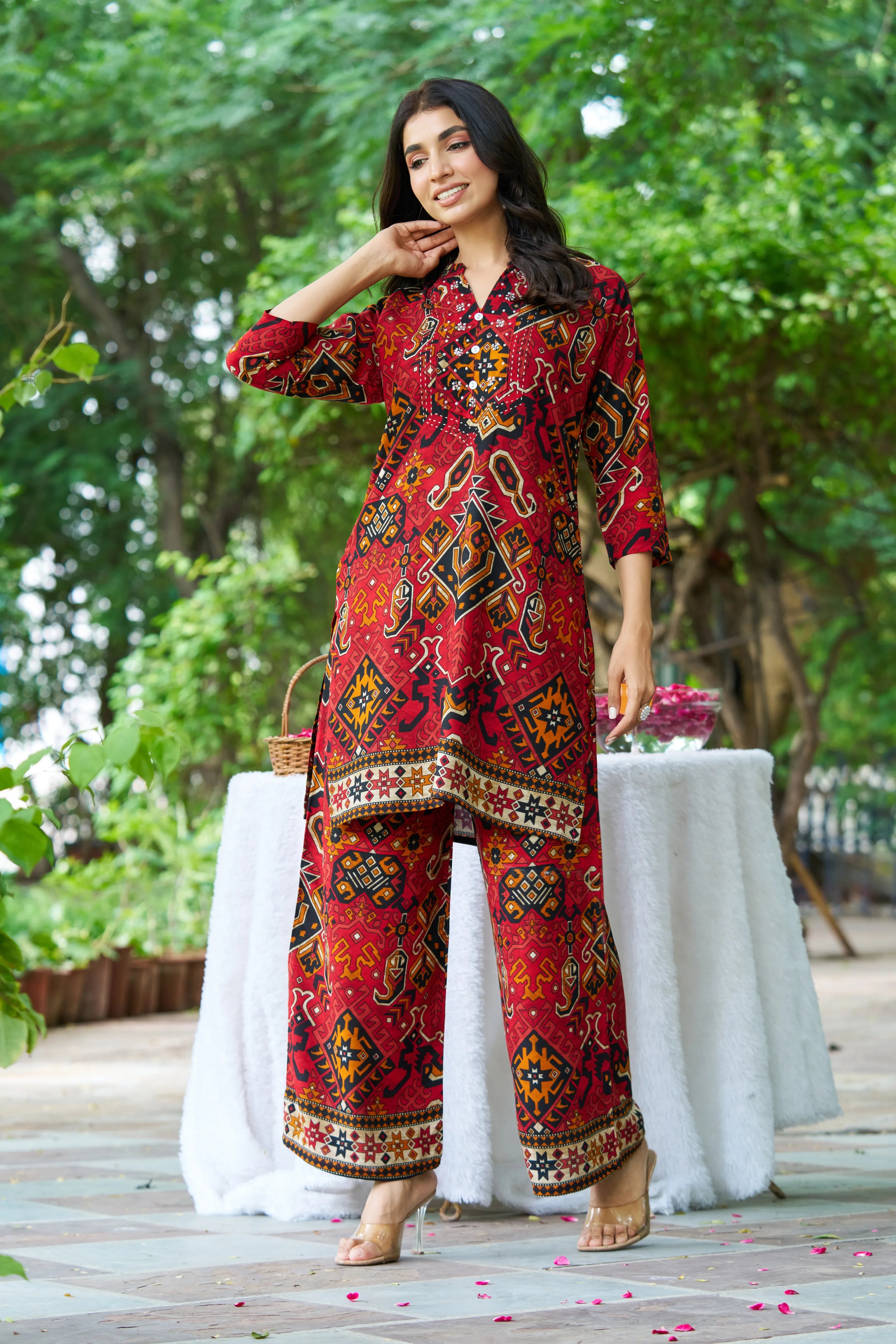 Step into vibrant tradition with Rajasthan Rouge, a fusion of heritage prints and modern flair. Featuring an all-over multicolor Ajrak print on rich red rayon, this kurti set is elevated with intricate blanket stitch yoke, detailed moti & salli embellishments, and a structured mandarin collar. The front button detailing adds charm, while the relaxed wide-leg pants with a single pocket ensure comfort with style.