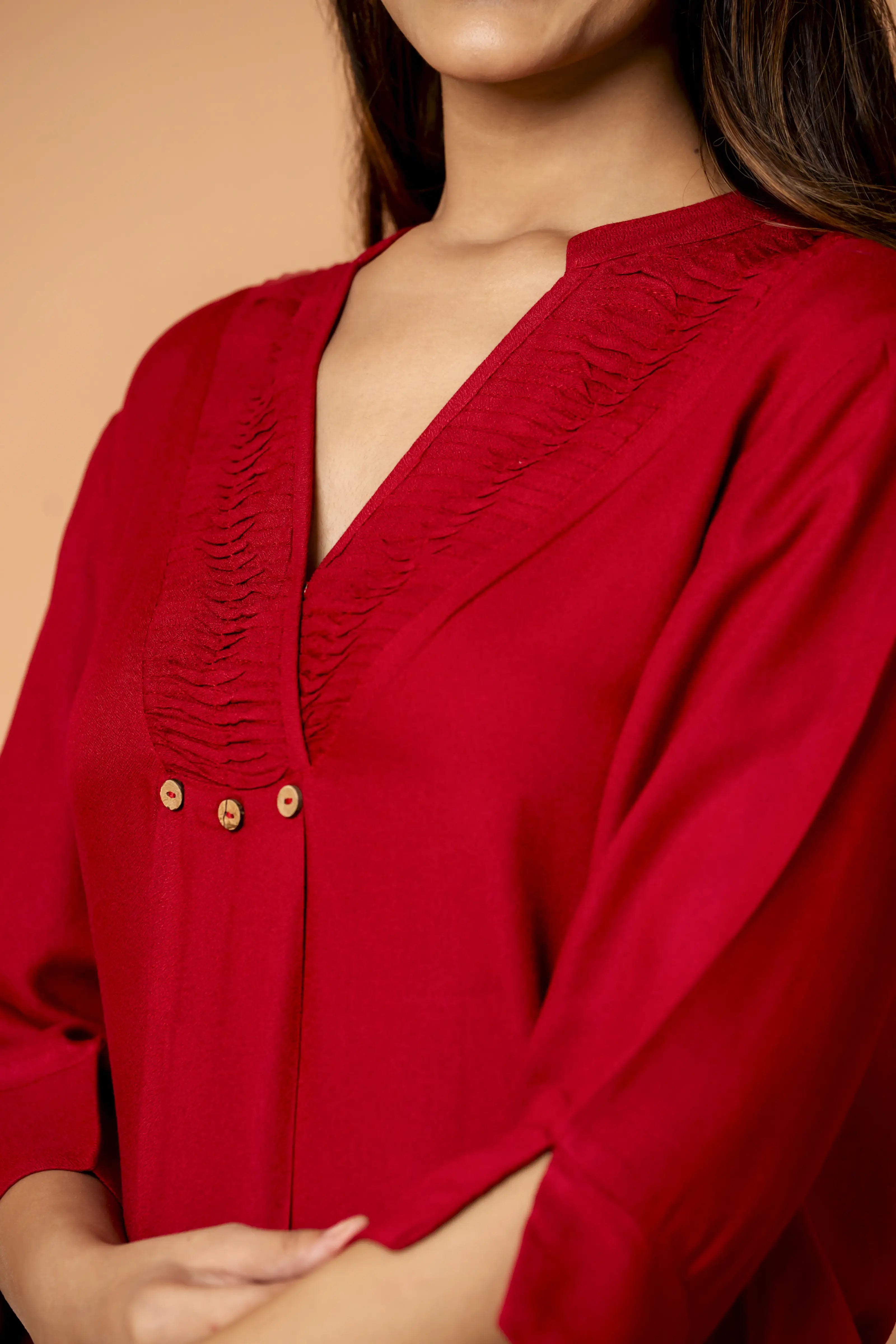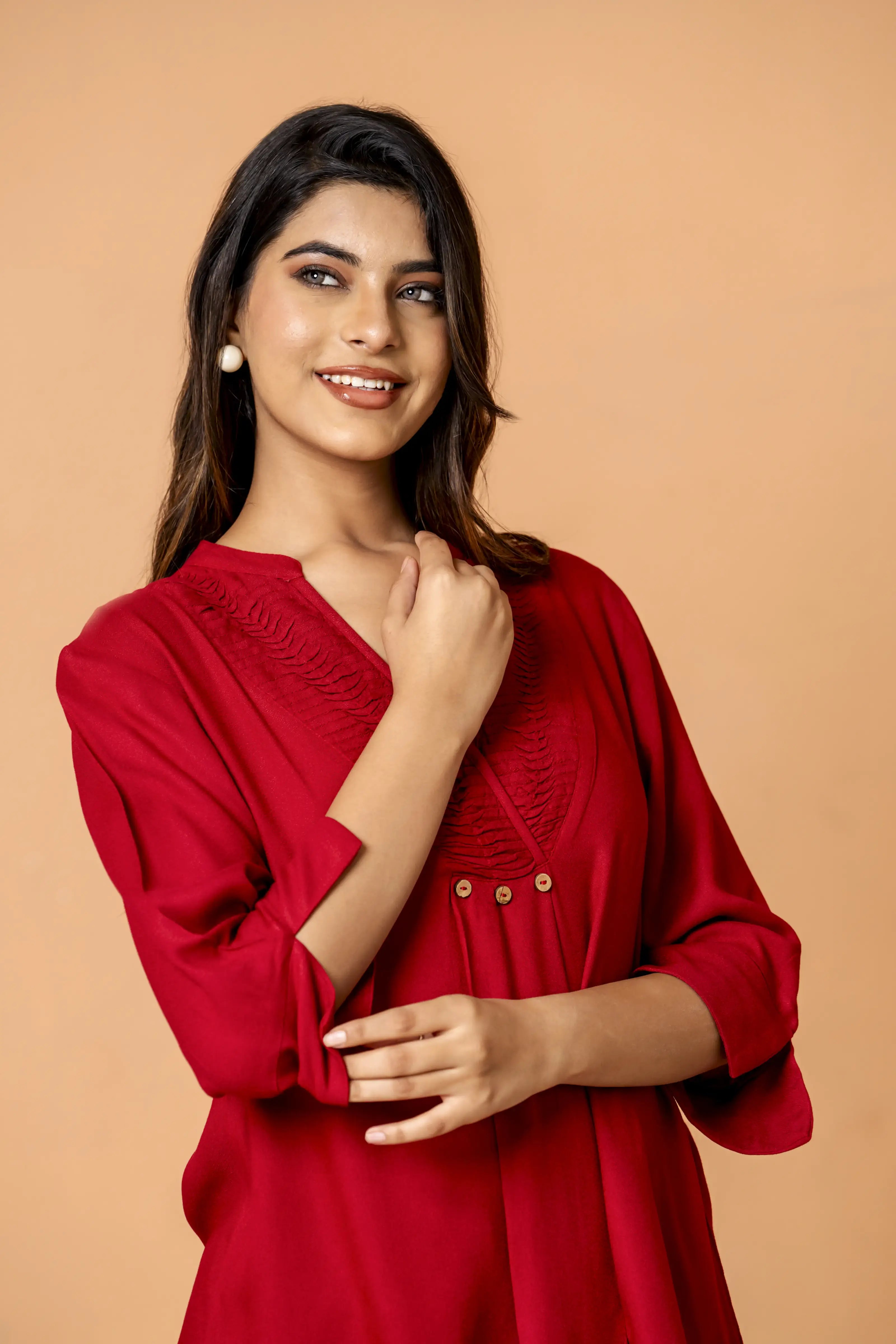 Add the Red Pleated Front Rayon Co-Ord Set to your wardrobe and let its chic design and bold color make a powerful style statement!