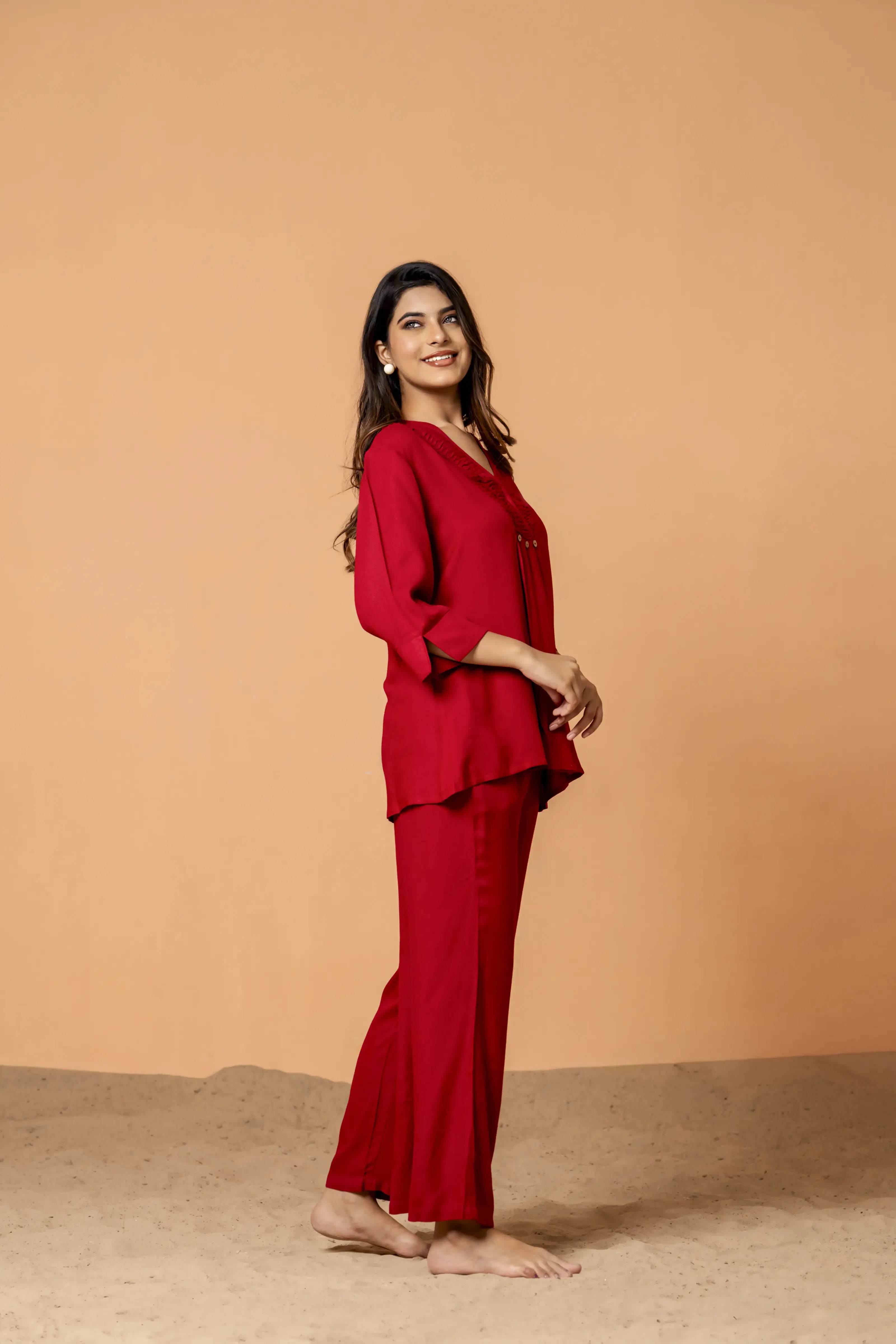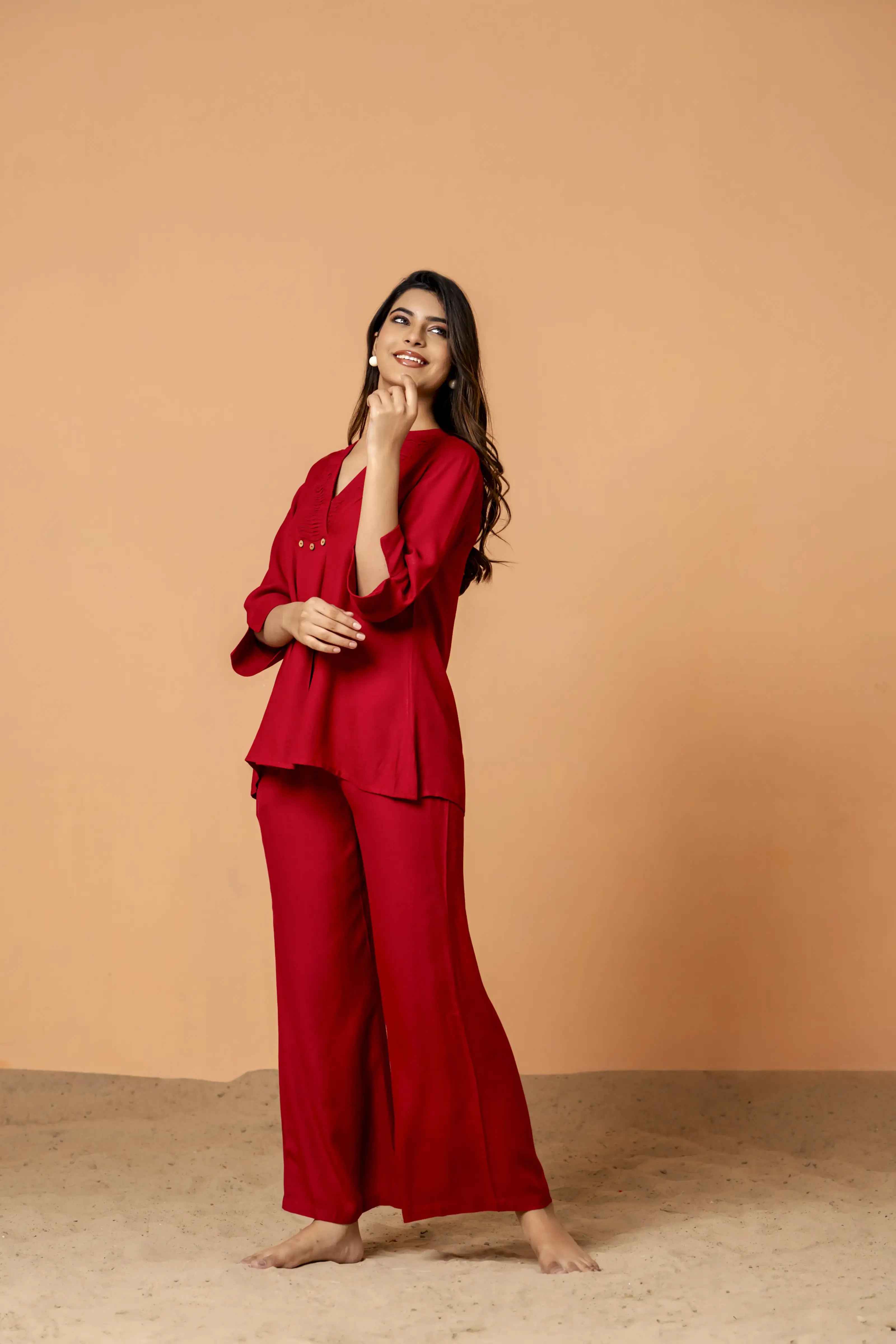 Radiate confidence with this bold Blood Red Co-Ord Set, crafted from soft and breathable rayon. The top boasts a sophisticated pleated front design and 3/4th sleeves, paired with elegant wide-leg pants to create a contemporary yet timeless silhouette. Perfect for both casual outings and semi-formal occasions, this ensemble strikes the ideal balance between comfort and style.