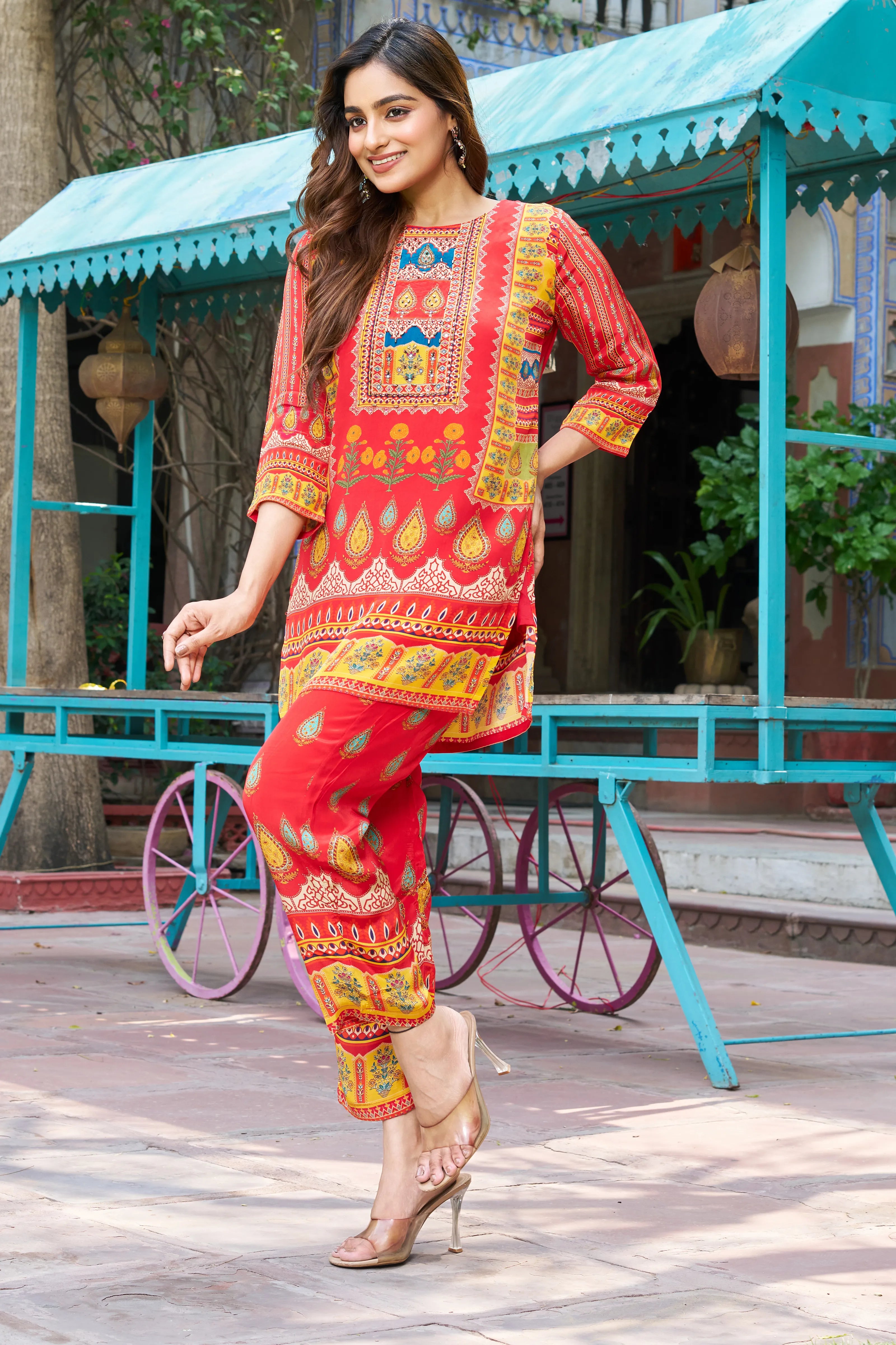 Infuse your wardrobe with celebration-ready charm through the Festive Bloom co-ord set. Drenched in a vibrant red hue, this ensemble brings alive the beauty of traditional Indian art with multicolor folk-inspired motifs, intricate bead detailing, and subtle mirror accents that shimmer with every step.