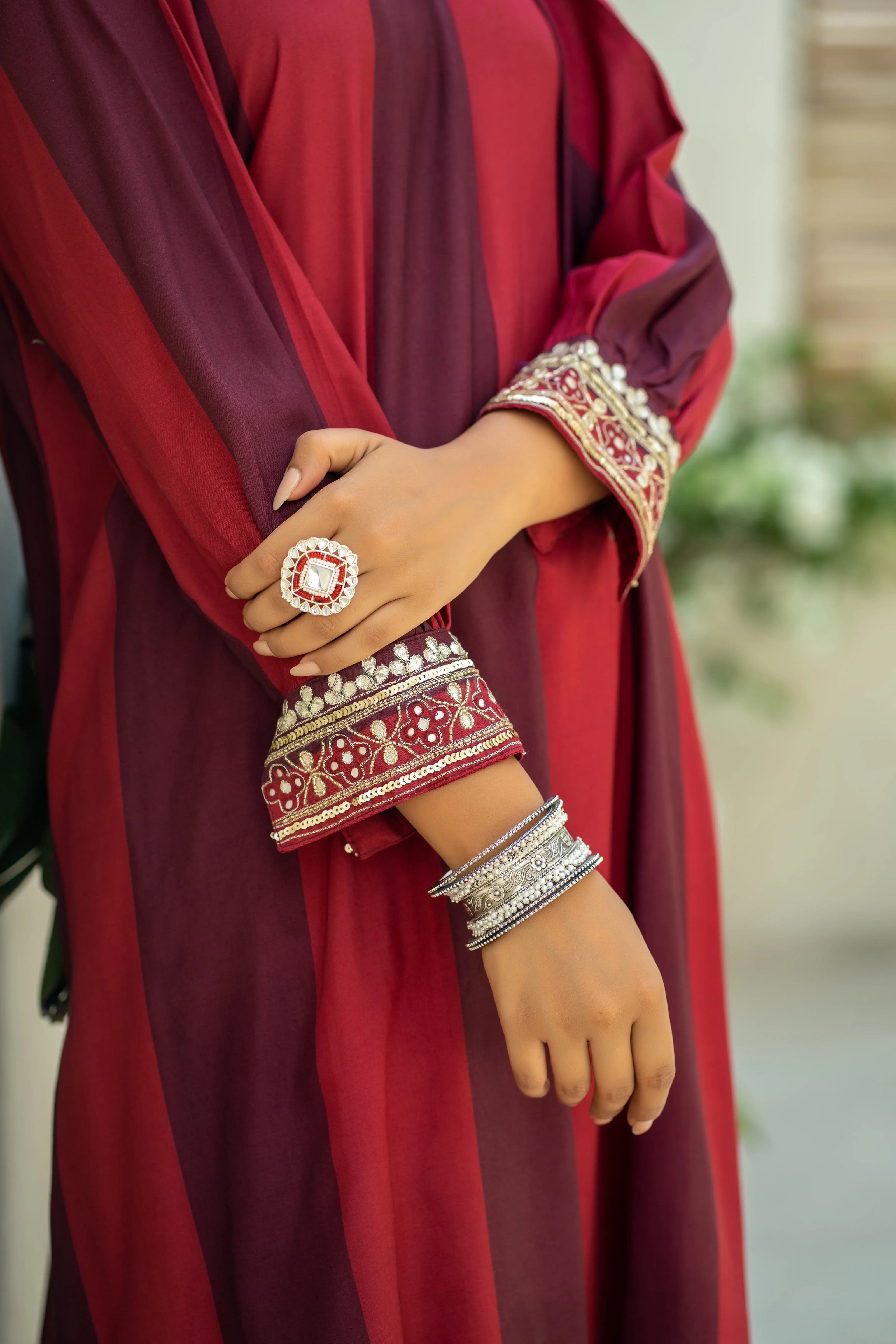 - Design: Bold red and burnt maroon stripes with sequence work on the cuffs