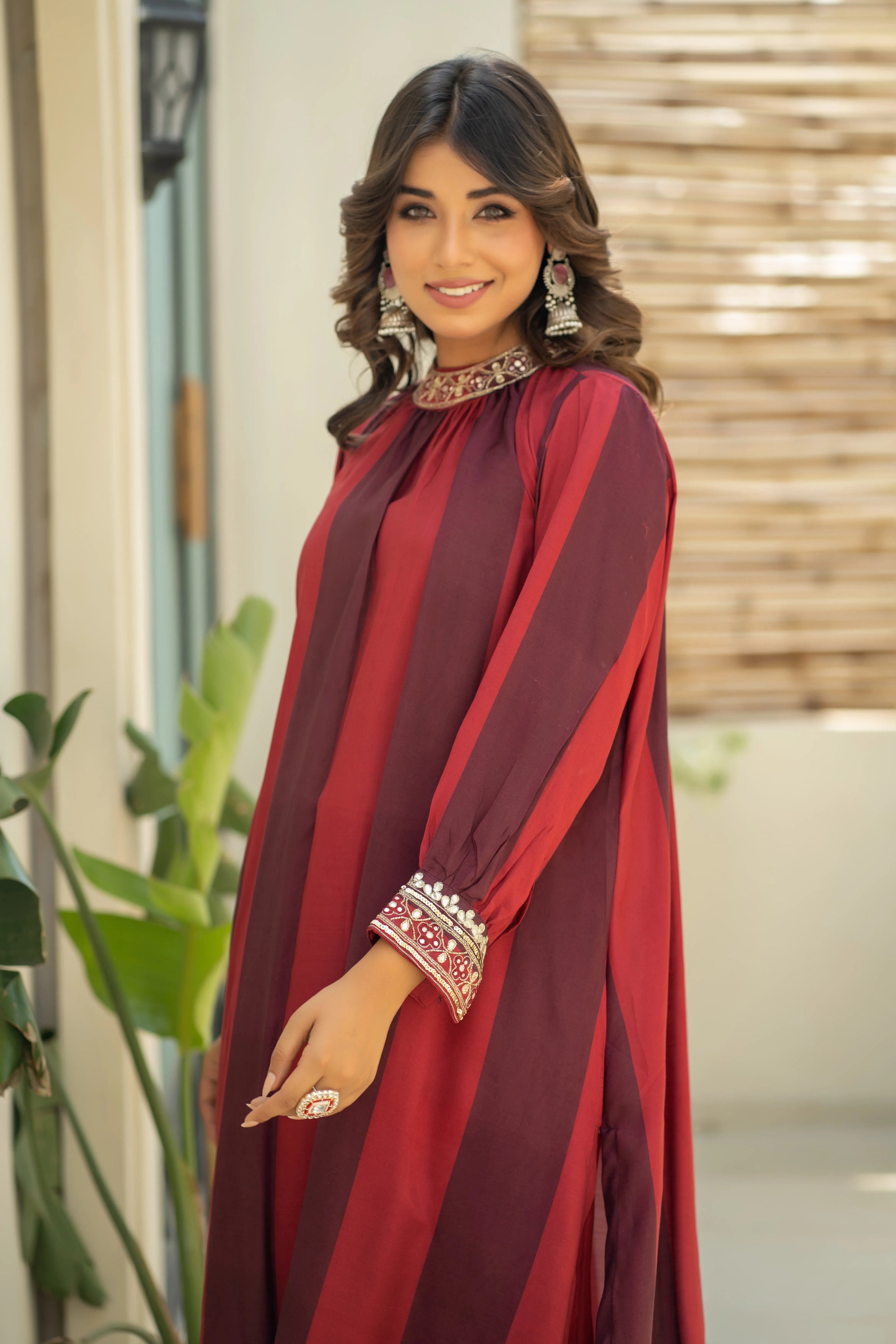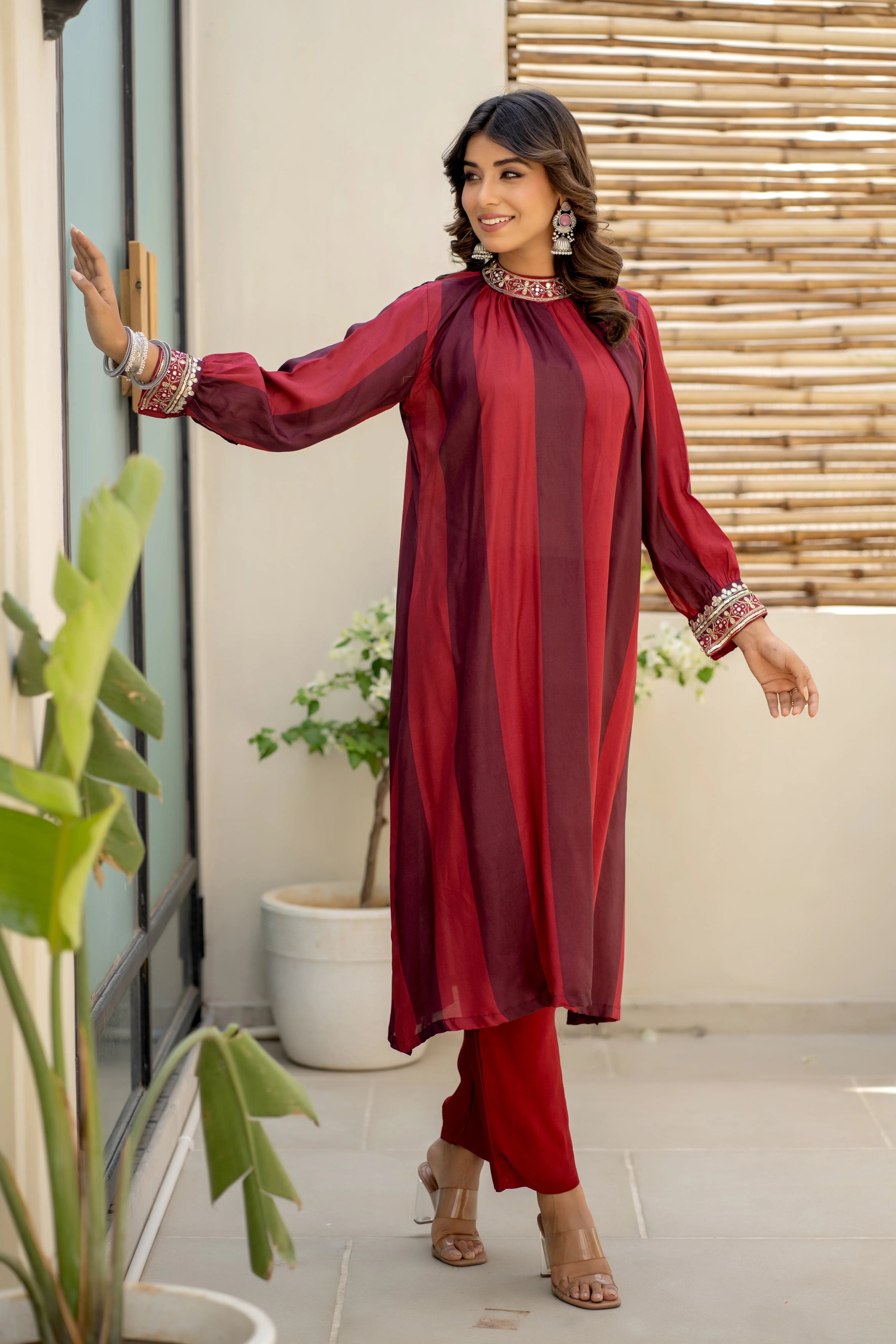 This stunning long kurti features a captivating blend of red and burnt maroon stripes, beautifully complemented by intricate sequence work on the cuffs and a chic round neck. Paired with straight pants crafted from soft muslin, this set effortlessly combines comfort with elegance, making it the perfect choice for any occasion.