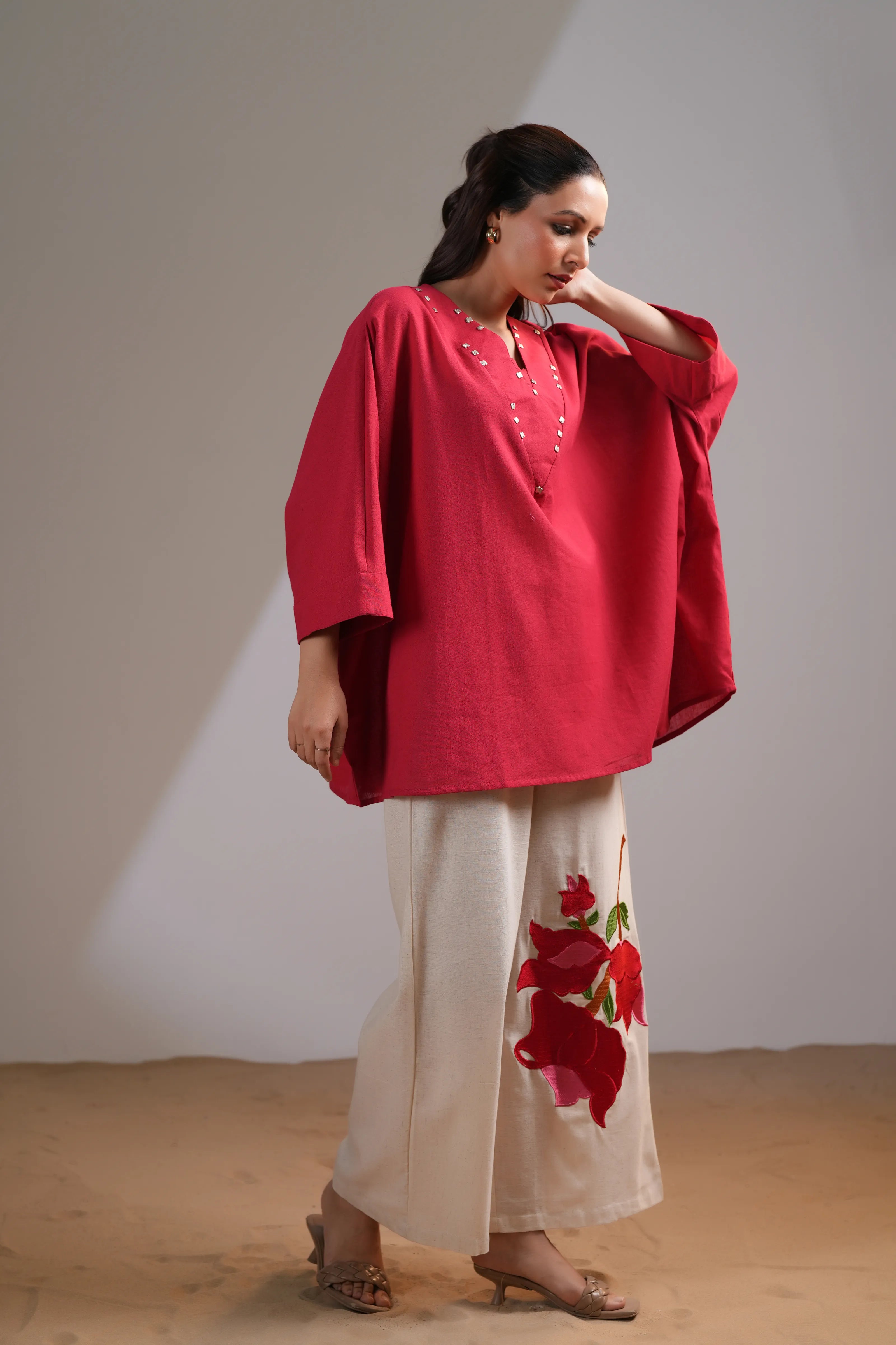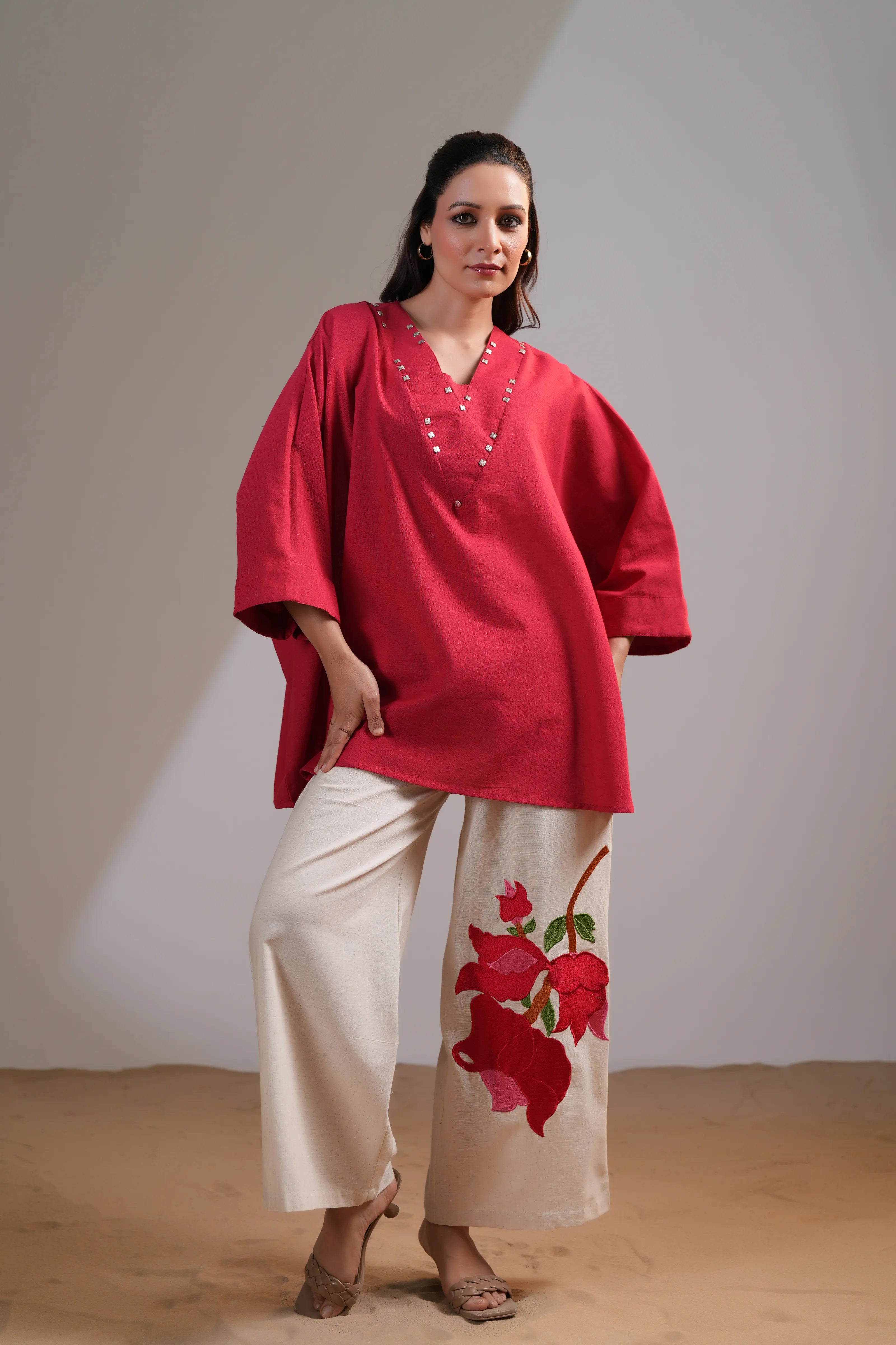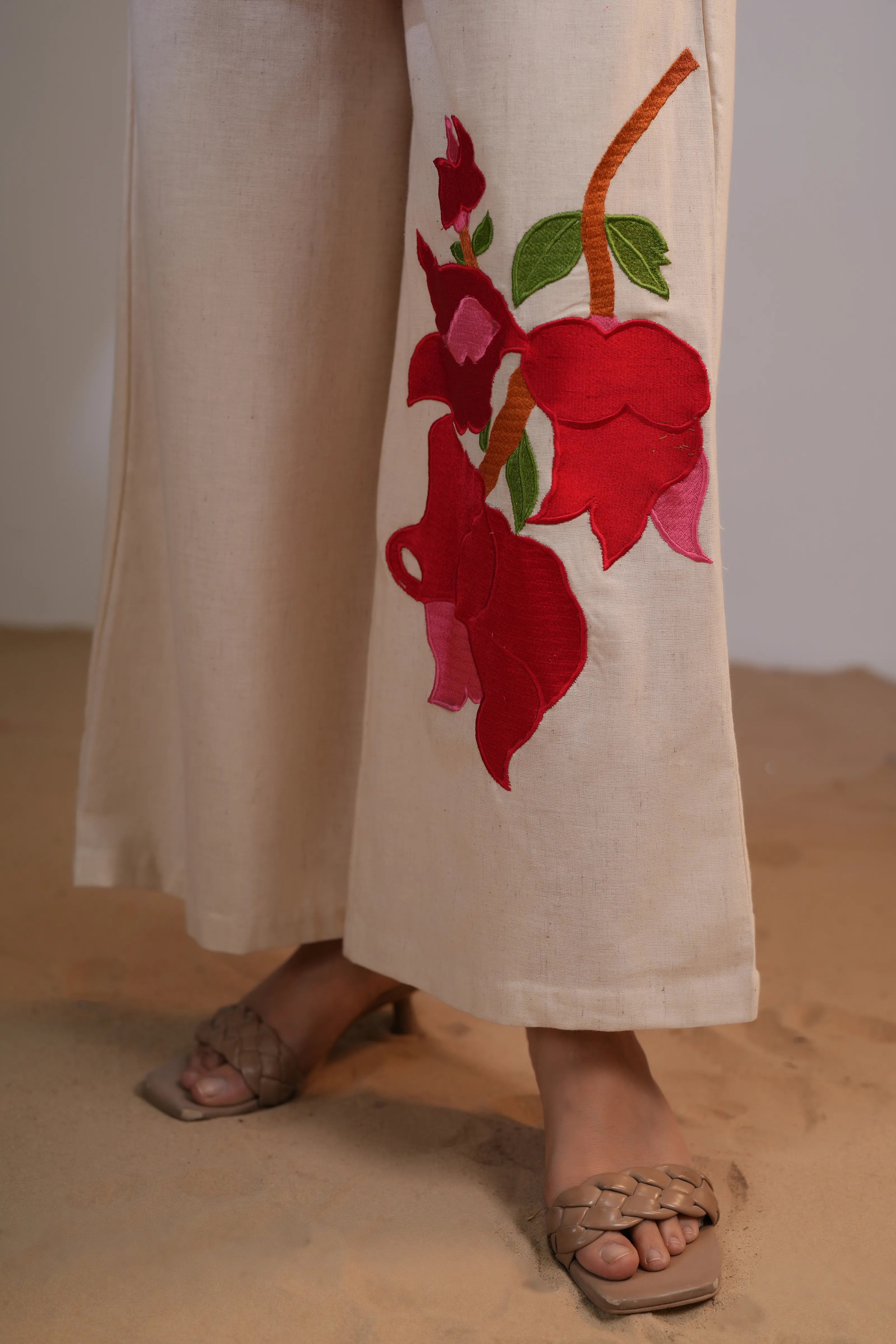 The star of the set? The cream wide-leg pants, adorned with bold red floral placement embroidery — a conversation starter at every turn.